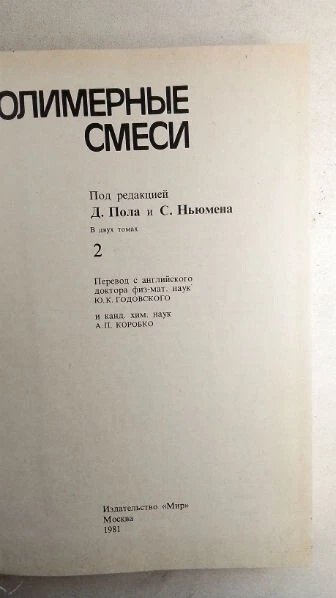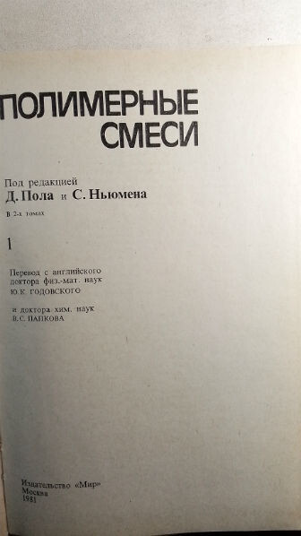 Полимерные смеси. В 2-х томах Пол Д., Ньюмен С. Пер. с англ. М. Мир 1981г. 550 с., 454 с. Твердый переплет, Чуть увеличенный. формат. Двухтомная коллективная монография по редакцией американских ученых Д. Пола и С. Ньюмена посвящена фундаментальным принципам образования полимерных смесей, формирования их морфологии и физико-механических свойств. В 1-м томе изложены теоретические проблемы совместимости — термодинамика совместимости и фазового разделения, процессы переноса в смесях, оптические свойства. Приведен исчерпывающий обзор совместимости исследованных к настоящему времени пар полимеров. Во 2-м томе изложены принципы формирования морфологии полимерных смесей, показана ее связь со свойствами композитов. В монографии рассматривается также применение полимерных смесей в качестве ударопрочных пластиков, взаимопроникающих полимерных стенок, волокон. Paul D., Newman S. Polymer mixtures. In 2 volumes. Translated from English. M. Mir 1981. 550 p., 454 p. Hardcover, Slightly enlarged. format.