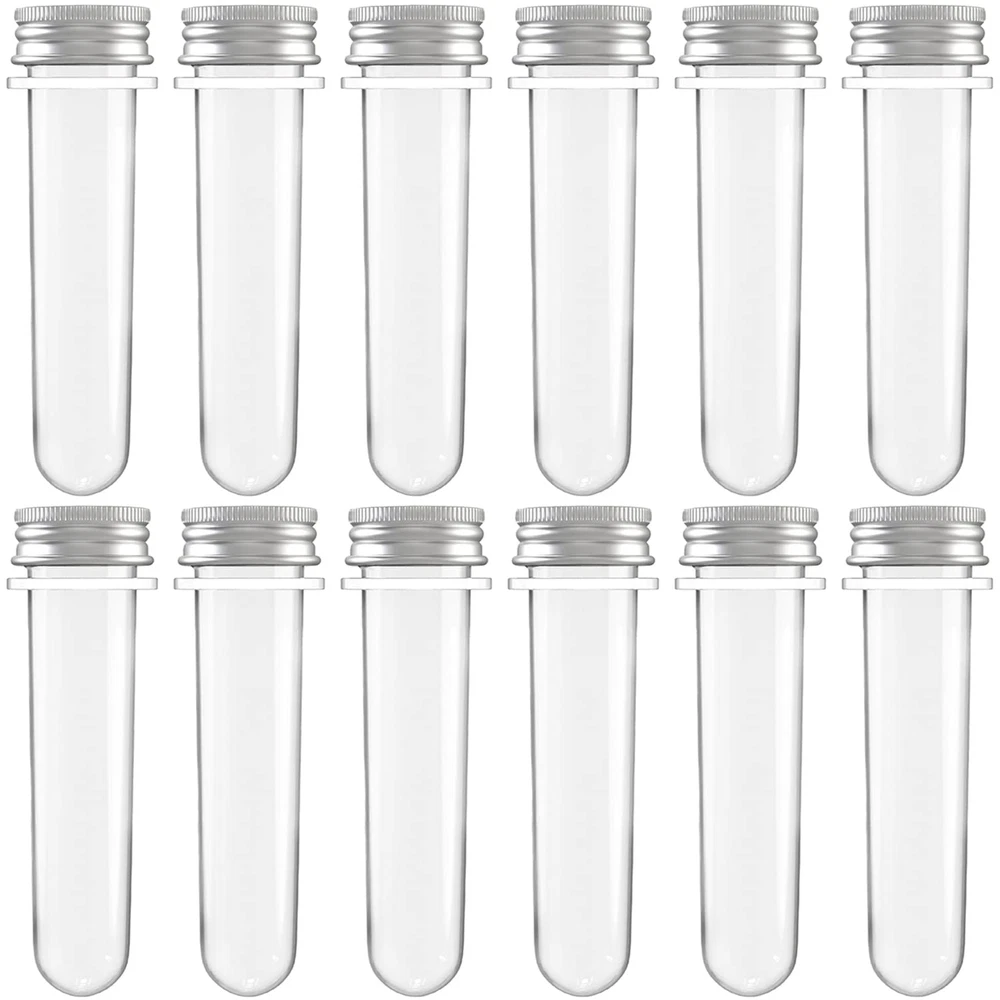 What You Get: 12 Pcs clear plastic tubes with aluminum screw-on lids, Enough for you daily decorate use, Also good for science experiment or propagate hydroponic plants, etc. Product Material and Size: These test tubes are made of PET plastic, hard to break, Clear plastic test tube is 5.5¡± inch length, 1¡± inch diameter, the cube capacity is 45ml. Leakproof and Safety: Clear plastic cube come with a aluminum screw cap, have good seal, rustproof and waterproof, for you storing gumball, candy, jelly, chocolate bean, cookie nuts packaging. Wide Range of Applications: Transparent plastic tube for storing powders, spices, beads, granules and liquids, Can also be used as a decorative accessories for party, festival or some special day, or use in lab, etc. SATISFACTION GUARANTEE: Our every product is carefully selected and checked. 12 Pcs clear plastic tubes 45 mL Also good for science experiment or propagate hydroponic plants, etc, have good seal, rustproof and waterproof for storing powders, spices, beads, granules and liquids, Can also be used as a decorative accessories for party, festival or some special day, or use in lab, etc.