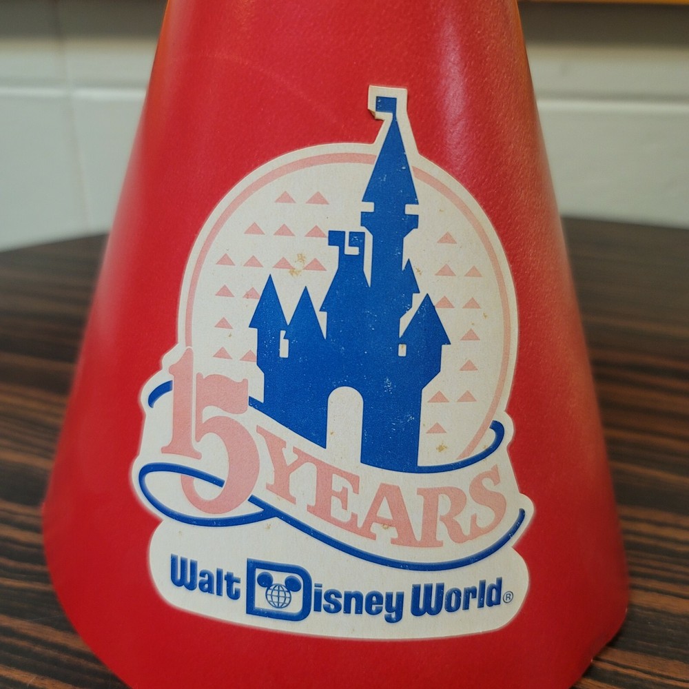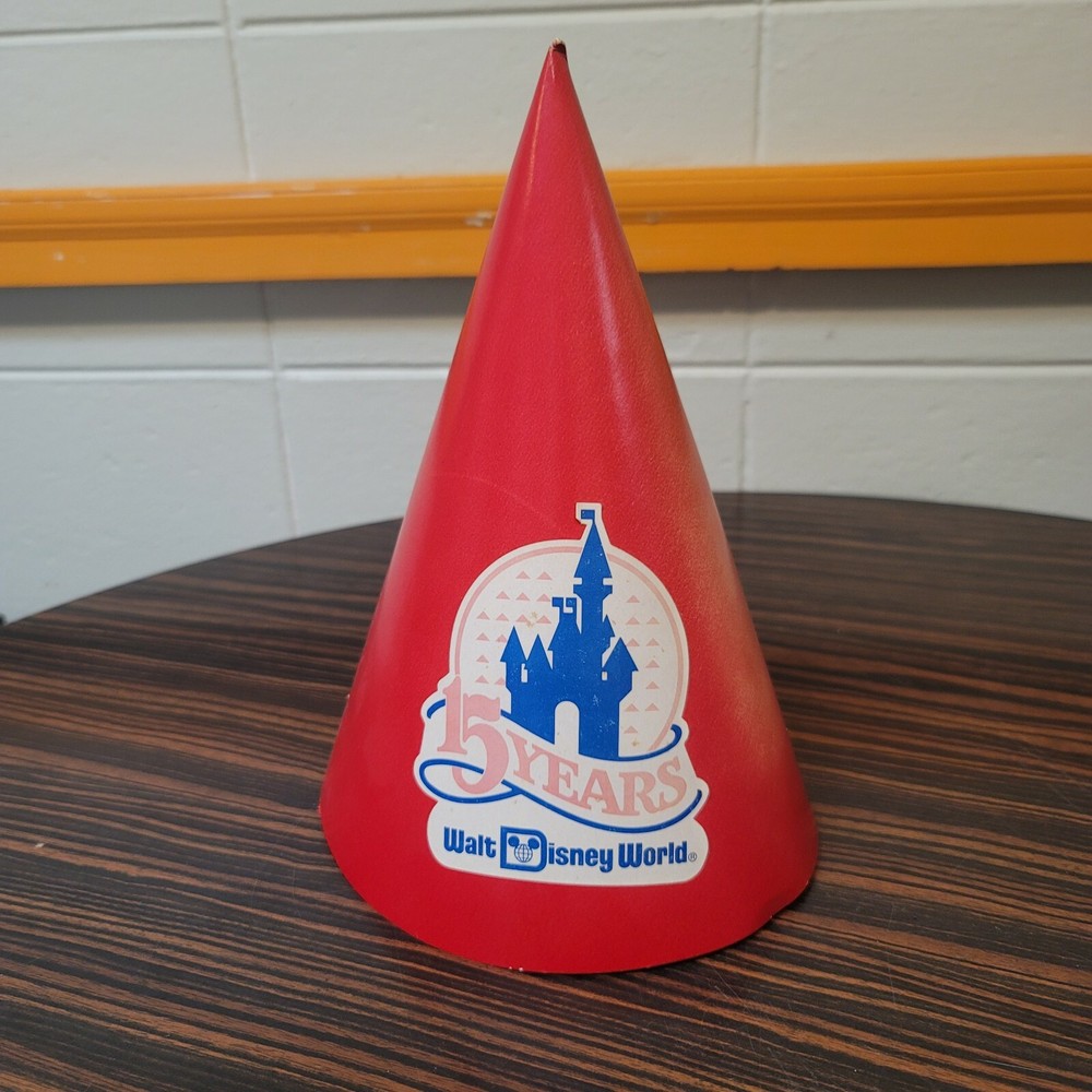 15 Year Anniversary Walt Disney World Party Hat Cap Birthday Red Cone Dunce. Measures 10" in height, graphic and hat are a little sun faded from being displayed. Please view photos for more details....