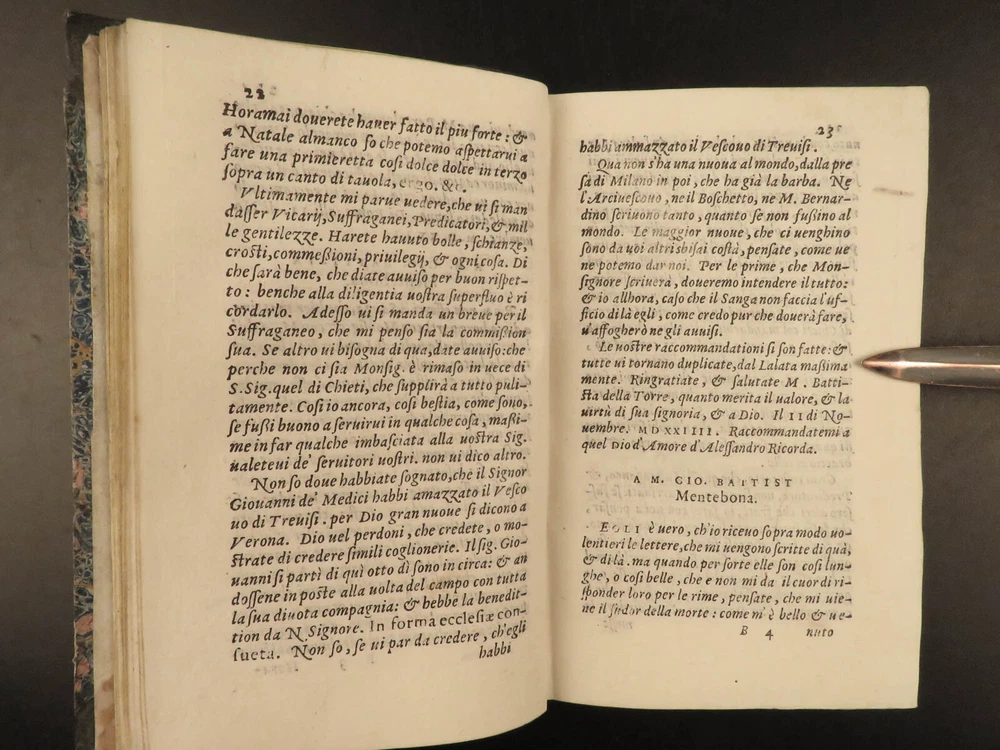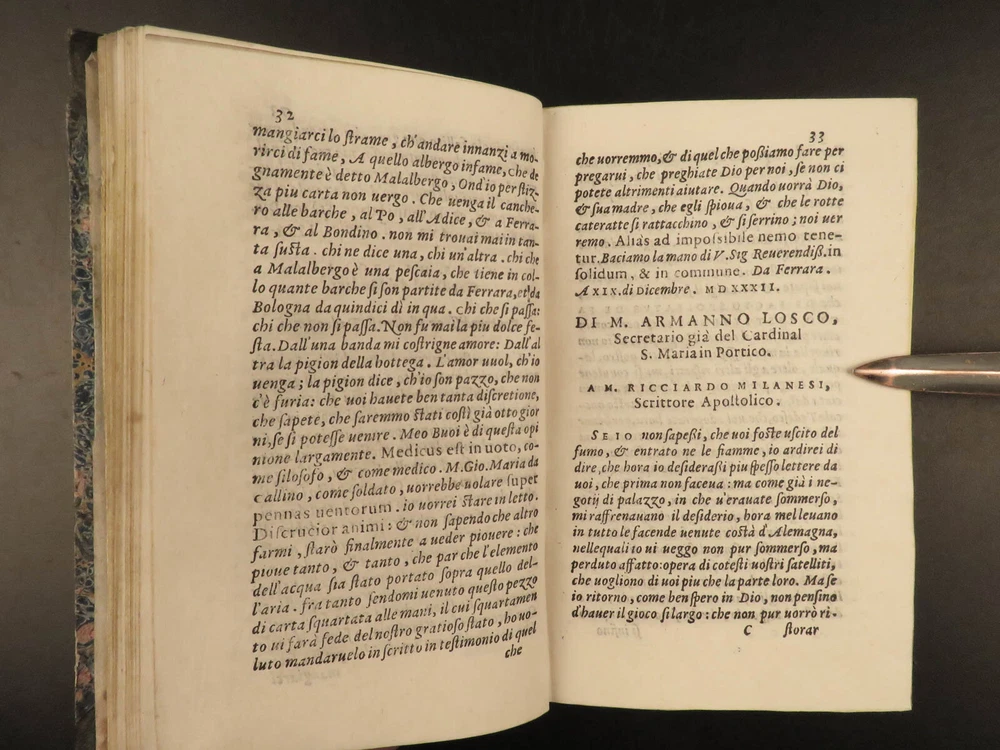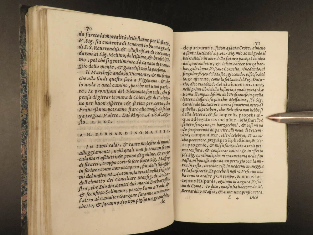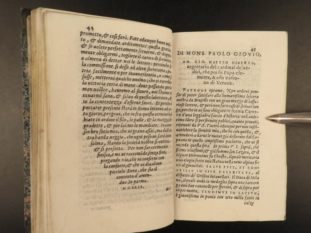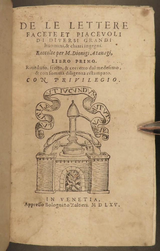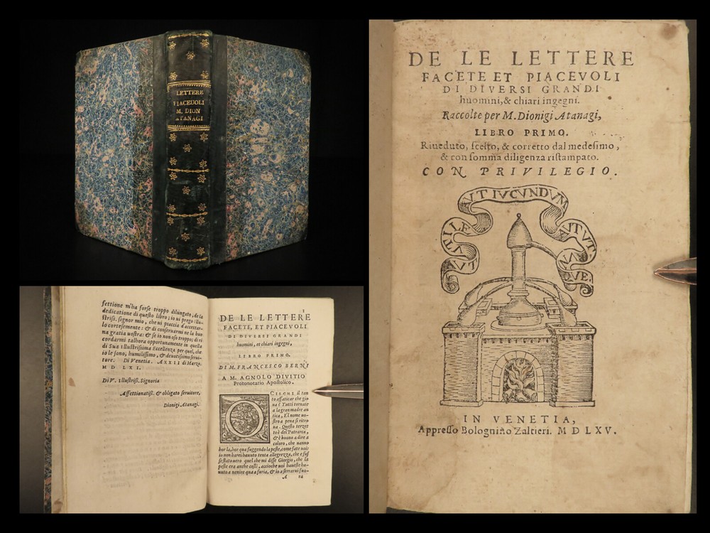 1565 1 st ed ITALIAN Great Men Dionigi Atanagi Letters Paolo Giovio Flaminio Dionigi Atanagi was a 16 th -century Italian author who is best-known for ‘ Pleasant Letters by Great Men’ – a collection of letters of iconic Italian men. This 1565 first edition of Atanagi’s “ Letters ” contains the correspondence of figures such as Paolo Giovio and Marcantonio Flaminio. Item number: #20149 Price: $795 ATANAGI, Dionigi De le lettere, facete et piacevoli di diversi grandi huomini, & chiari ingegni. Venetia : Appresso B. Zaltieri, 1565. 1 st edition Details : · Collation: Complete with all pages; o [16], 438, [8] o Fine, engraved initials o Signatures: * 8 2* 4 A-Z 8 AA-DD 8 EE 4 · Provenance: o Armorial Bookplate – S&B § Includes a styled ‘&’ of rope, with an English earl’s coronet. o Handwritten – [Lre. Burlesche] on bottom fore edge · References: USTC 811371 · Language: Italian · Binding: Leather; tight and secure · Size : ~6.25in X 4in (15.5cm x 10.5cm) · Rare and desirable Our Guarantee: Very Fast. Very Safe. Free Shipping Worldwide. Customer satisfaction is our priority! Notify us with 7 days of receiving, and we will offer a full refund without reservation! 20149