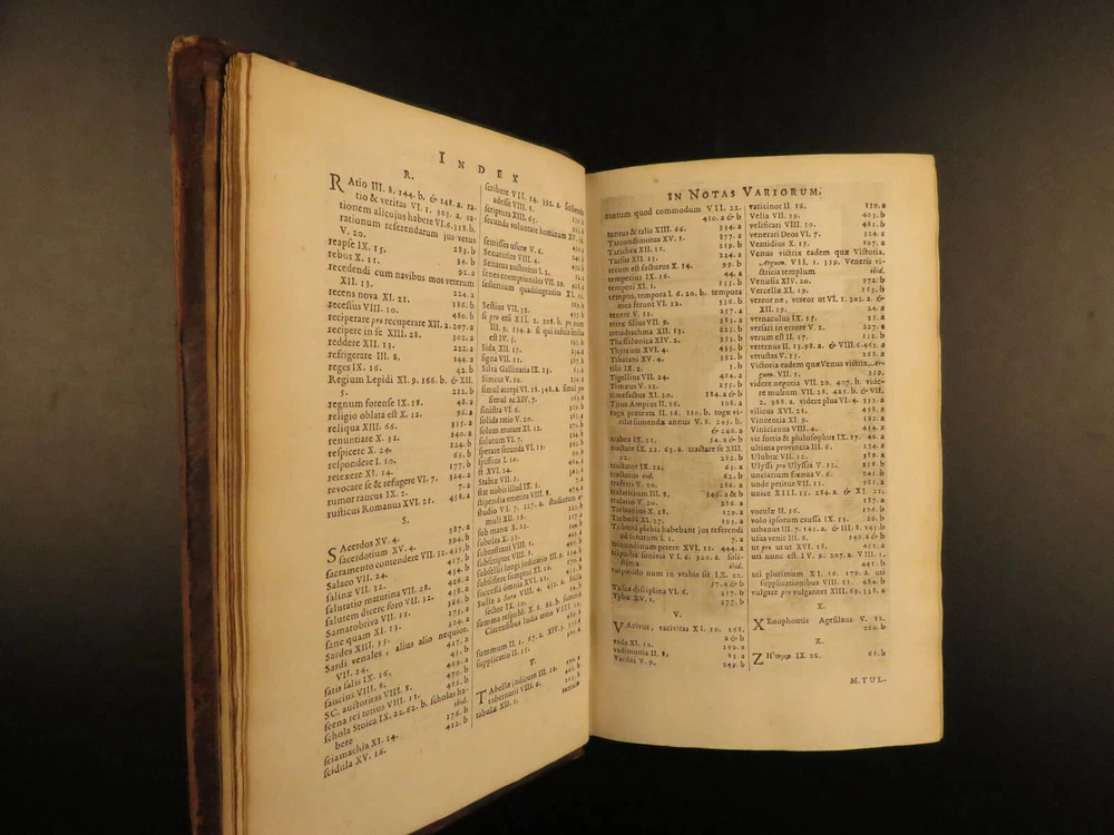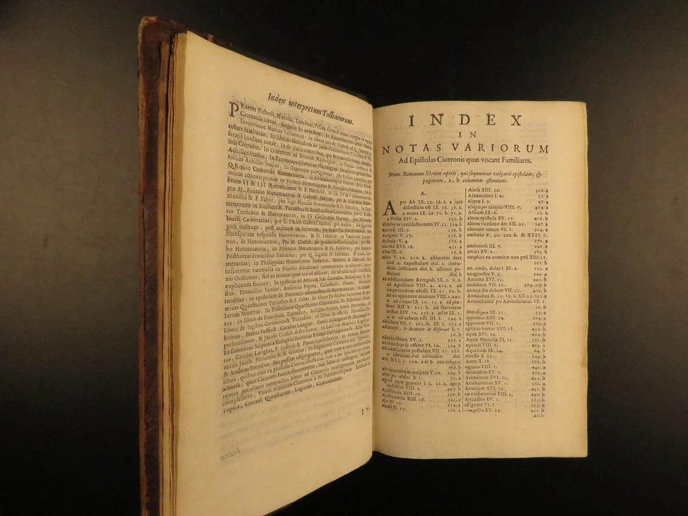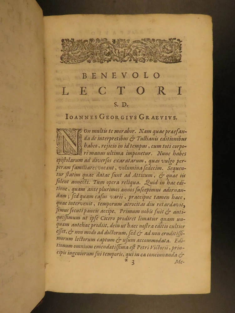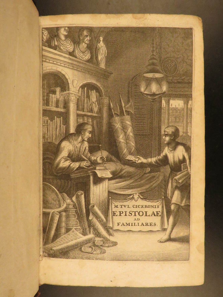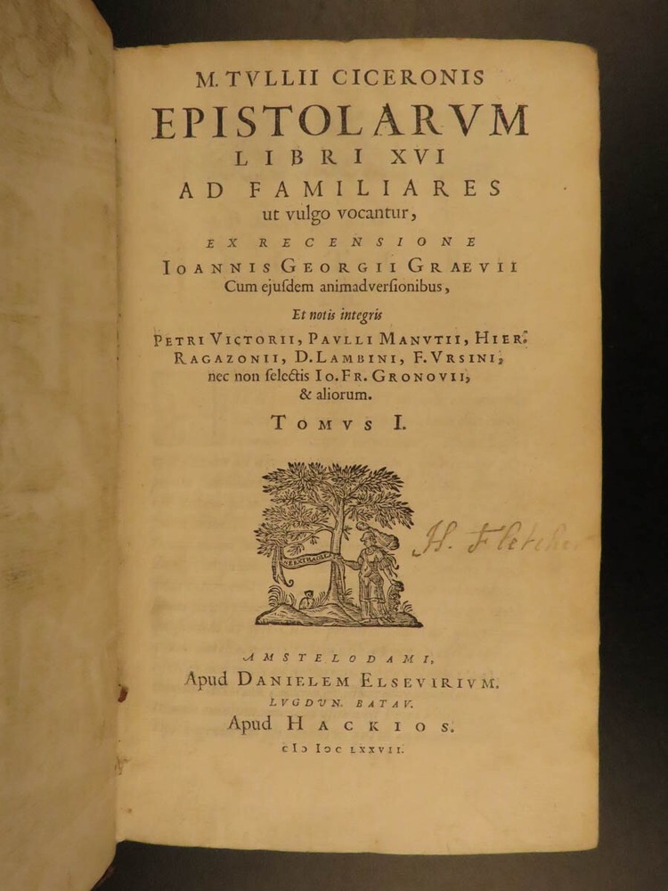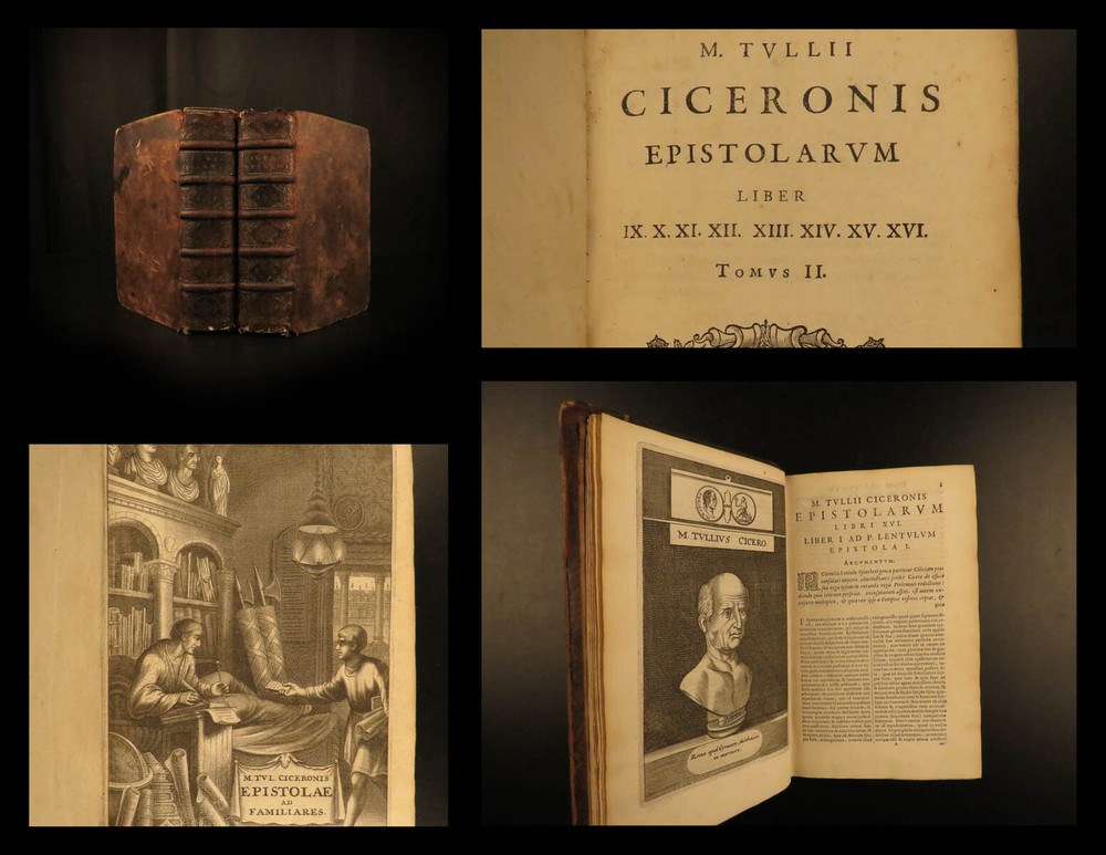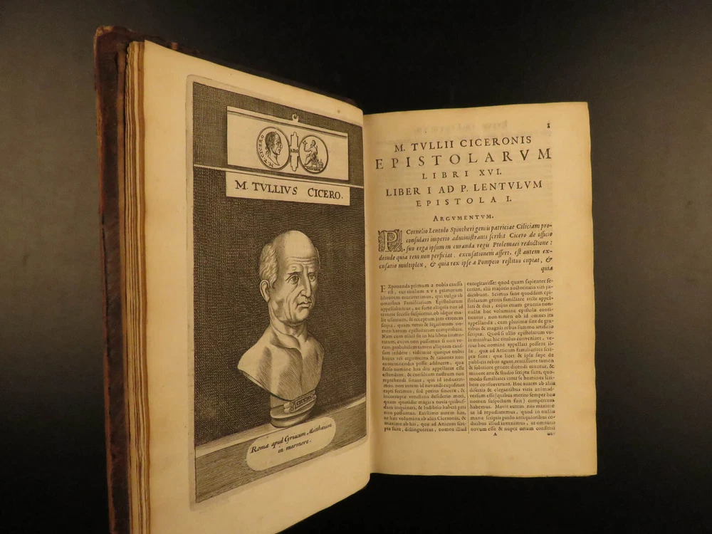 1677 Cicero Epistolae Familiar Letters ROME Paulus Manutius Commentary Elzevier “A room without books is like a body without a soul.” ― Marcus Tullius Cicero ‘Familiarium Epistolarum’ or ‘Familiar Letters’ is a series of letters by Cicero to Roman public figures. They are considered the most reliable source of information for the period leading up the fall of the Roman Republic . It includes history of Rome, Julius Caesar, Brutus, and other important influences. This 1677 Hackium and Elzevier edition was published in Amsterdam and is notable for including one of the best and most important commentaries on Cicero – those of Paulus Manutius and Gerolamo Ragazzoni. Item number: #13784 Price: $599 CICERO, Marcus Tullius M. Tullii Ciceronis epistolarum libri XVI ad familiares ... ex recensione Ioannis Georgii Grævii cum ejusdem animadversionibus, et notis integris P. Victorii, P. Manutii, H. Ragazonii, D. Lambini, F. Ursini, nec non selectis I.F. Gronovii, et aliorum. Amstelodami : Apud D. Elsevirium ; Lugdun. Batav. : Apud Hackios, 1677. Details : · Collation: Complete with all pages; 2 volumes o Vol. I – [20], 506, 434, 78 o Vol. II – 468, 416, [104] · References: Willems 1525 · Provenance: o Armorial Bookplate – FAX MENTIS INCENDIUM GLORIÆ – FAX MENTIS HONESTÆ GLORIA – 1632 o Handwritten – H. Fletcher · Language: Latin · Binding: Leather; tight & secure · Size : ~7.75in X 5in (20cm x 13cm) Our Guarantee: Very Fast. Very Safe. Free Shipping Worldwide. Customer satisfaction is our priority! Notify us with 7 days of receiving, and we will offer a full refund without reservation! 13784