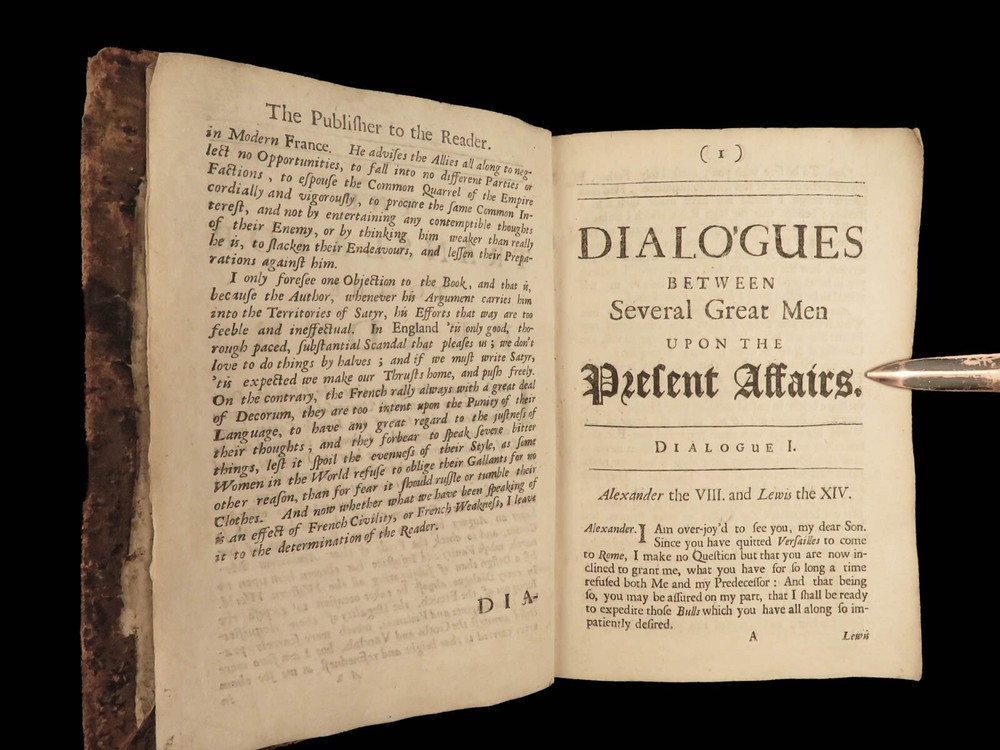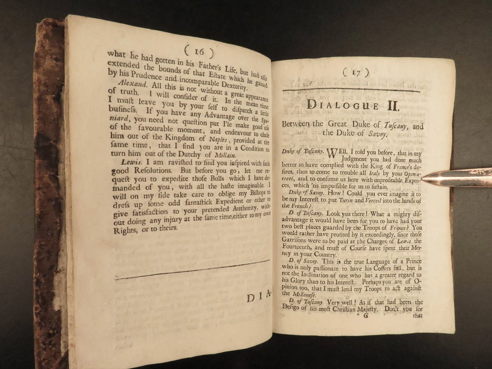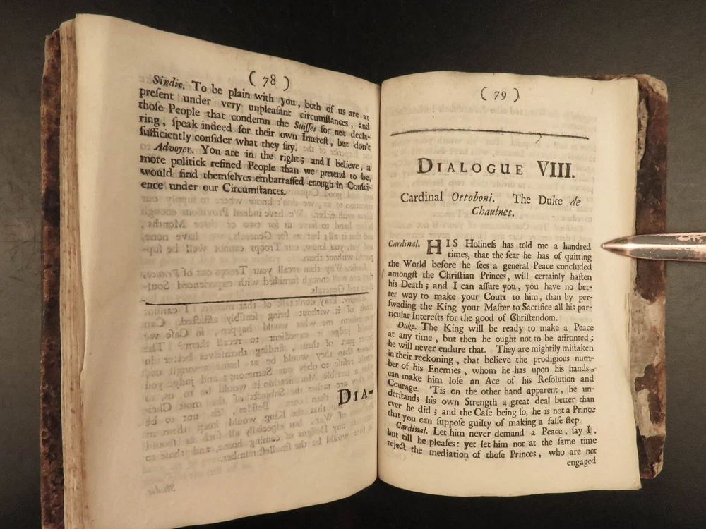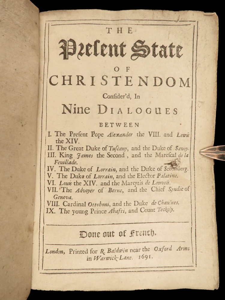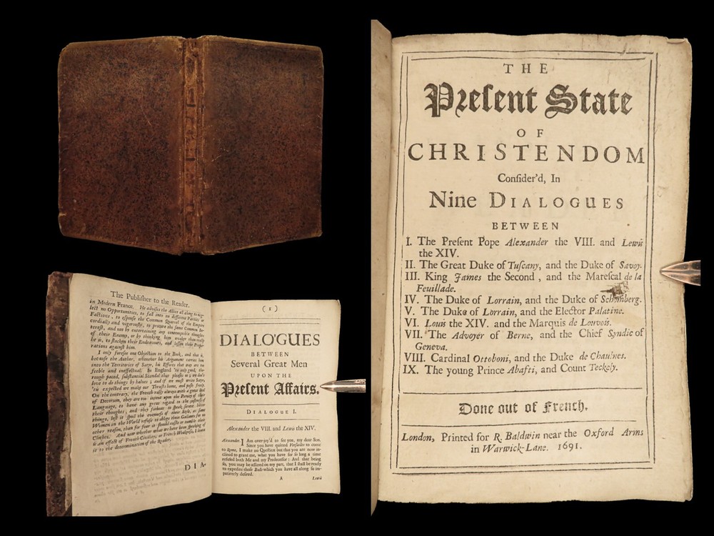 1691 ENGLISH 1 ed Present State of Christendom Louis XIV Alexander Duke Tuscany ‘ The Present State of Christendom’ is a collection of nine dialogues between notable figures of 17 th -century Europe including Pope Alexander VIII, King Louix XIV, dukes of Savoy and Tuscany, the Duke of Lorrain, Cardinal Pietro Ottoboni, Prince Abasti, and others. Each of these works of correspondence discuss the effects of Protestant and Catholic theology on politics, royal crowns, and on churches themselves. Item number: #22214 Price: $599 various The present state of Christendom consider'd : in nine dialogues London : Printed for R. Baldwin ..., 1691. First edition. Details : · Collation: Complete with all pages o [4], 95, [1] · Language: English · Binding: Leather; tight and secure · Size : ~6in X 4.25in (15cm x 10.5cm) Our Guarantee: Very Fast. Very Safe. Free Shipping Worldwide. Customer satisfaction is our priority! Notify us with 7 days of receiving, and we will offer a full refund without reservation! 22214