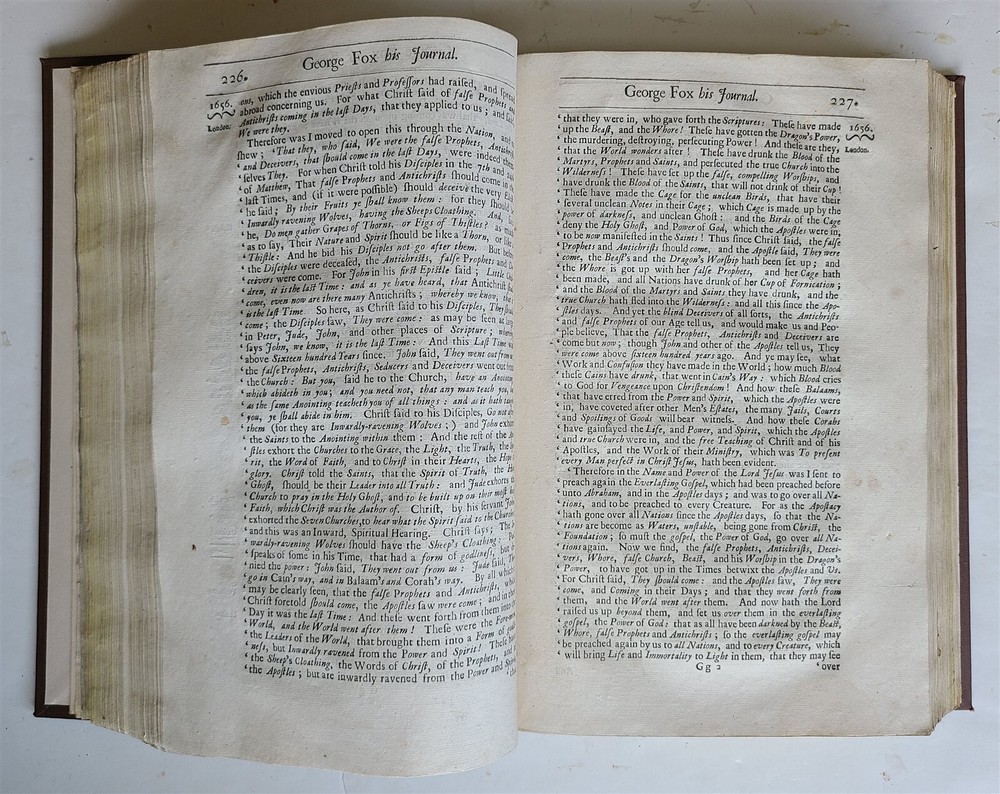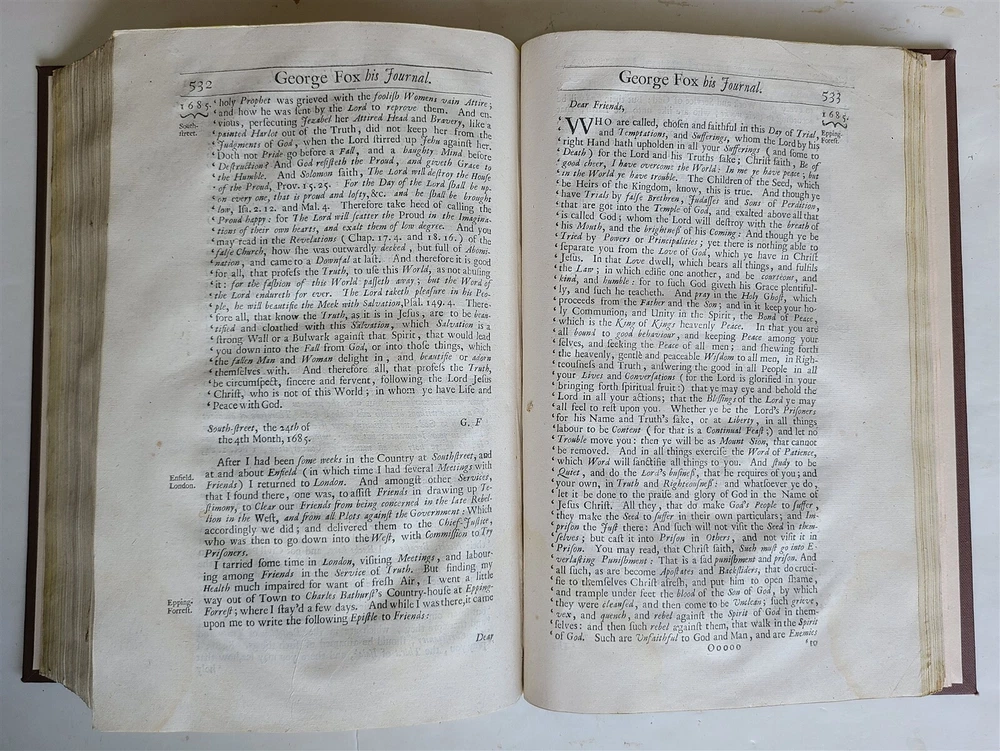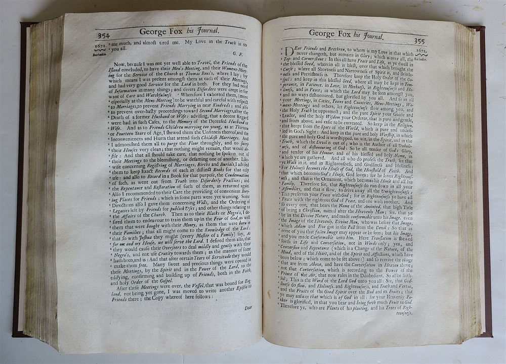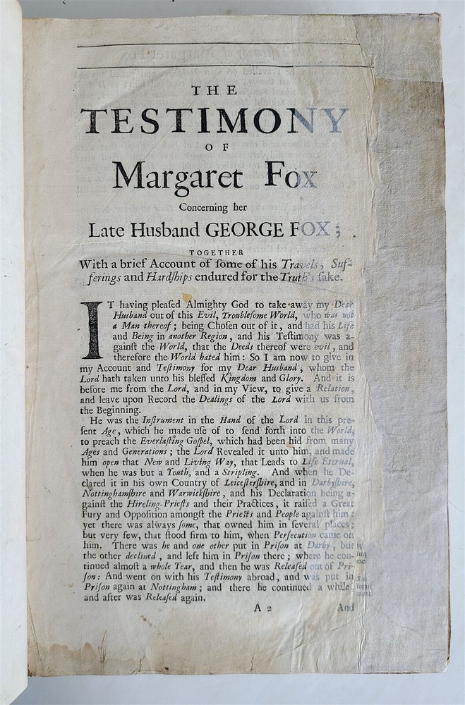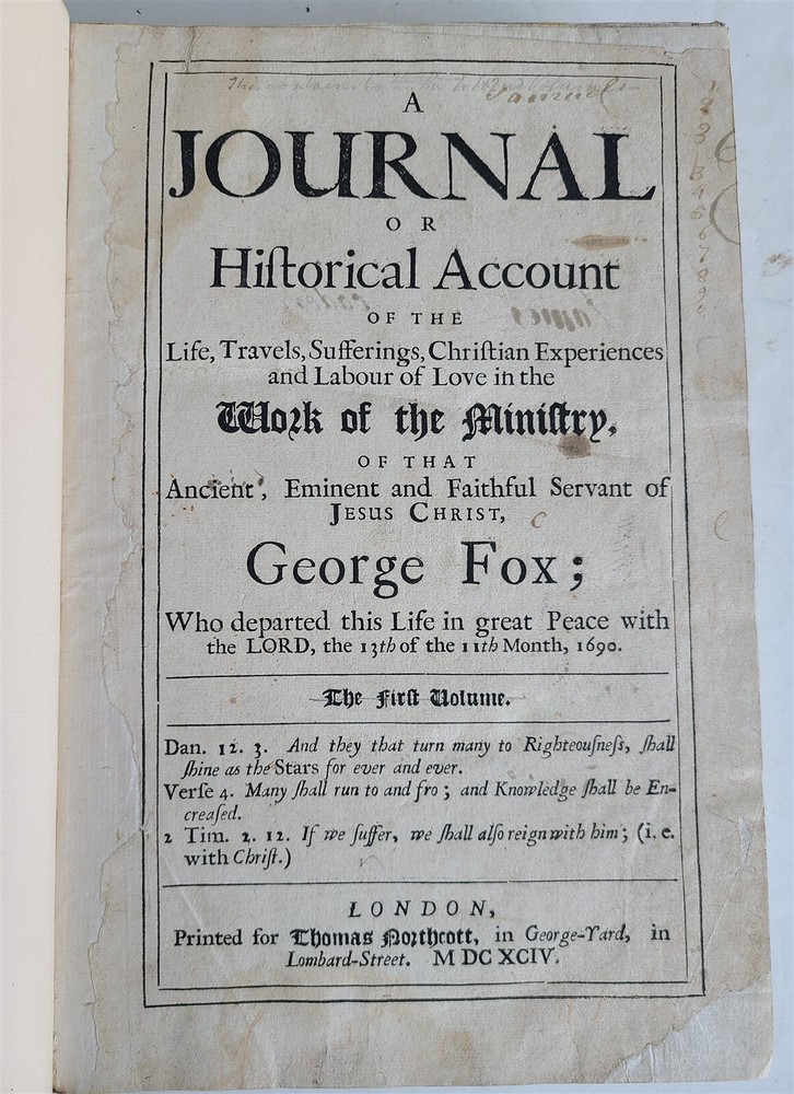 A Journal or Historical Account of the Life, Travels, Sufferings…. Of… George Fox. Volume 1 London, 1694 Small folio. Size 8 1/4 by 11 3/4" 632 pp plus table Final table leaf at end in facsimile and second to last leaf covered in tissue for repair, some other repairs, Otherwise good condition Binding is modern 1/4 calf. Text in English =============================== Please see my other auctions Thank You Refund Policy: We will issue a FULL REFUND, 100% money back if you are not satisfied with your purchase. Items must be returned to us within 20 days in order to receive a refund or replacement. Buyer is responsible for shipping costs. Powered by SixBit's eCommerce Solution