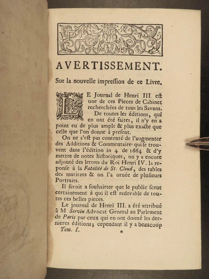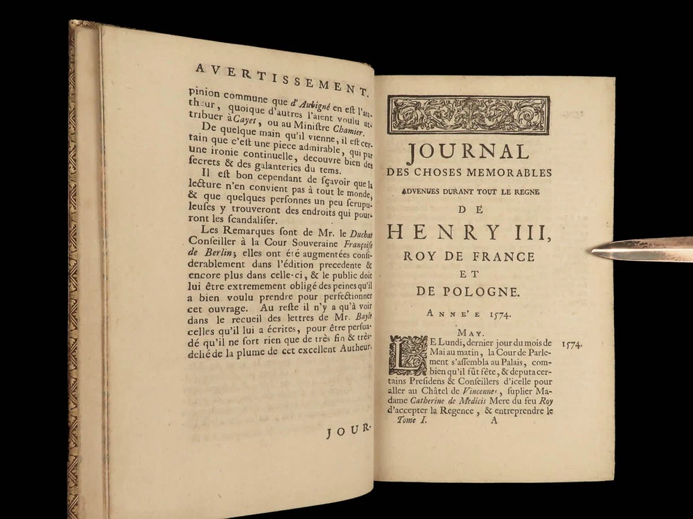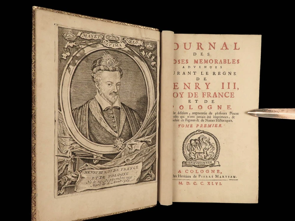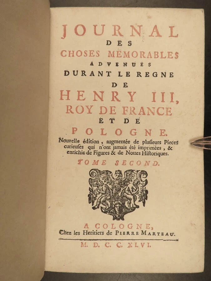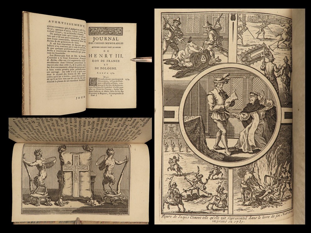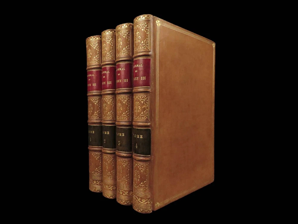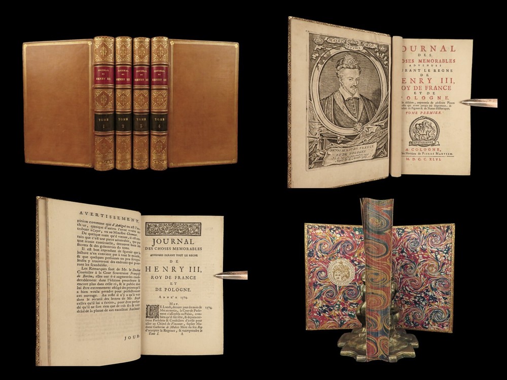 1746 BEAUTIFUL Henry III of France 1 ed Journal Wars of Religion Huguenots 4v SET Henry III of France was king of France at the end of the 16 th -century. Much of his reign, both of France and Poland, was dictated by the French Wars of Religion and the ongoing feuds between Protestants and Catholics. Henry’s journal was published, following his life, and became one of the best accounts of late 16 th -century France, Huguenots, and the Catholic League from a royal perspective. Item number: #24124 Price: $695 HENRY III of France Journal des choses memorables advenues durant le regne de Henry III, roy de France et de Pologne A Cologne: de Pierre Marteau, 1746. First edition. Details : · Collation: Complete with all pages; 4 volumes o Vol. 1 – [6], 368, [20] o Vol. 2 – [2], 299, [13] o Vol. 3 – [2], 337, [15] o Vol. 4 – [4], 306, [14] o 13 engraved plates throughout · Provenance: Armorial bookplate o William Twopenny § Motto: VIRTUTE ET INDUSTRIA o J. Hamilton Gair § Motto: SERO SED SERIO · Language: French · Binding: Leather; tight and secure · Size : ~7in X 4.75in (18cm x 12cm) Our Guarantee: Very Fast. Very Safe. Free Shipping Worldwide. Customer satisfaction is our priority! Notify us with 7 days of receiving, and we will offer a full refund without reservation! 24124