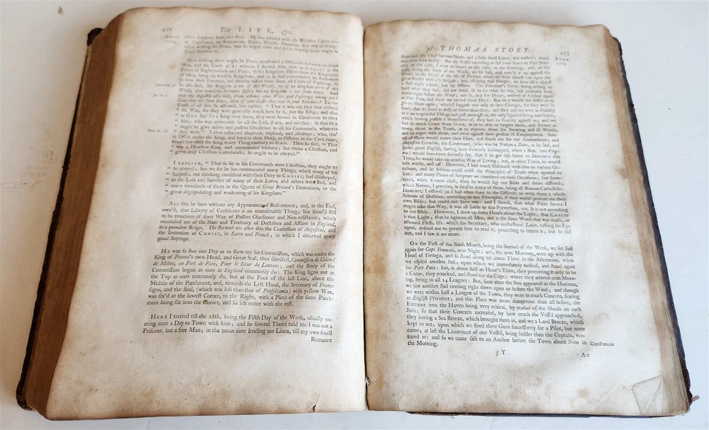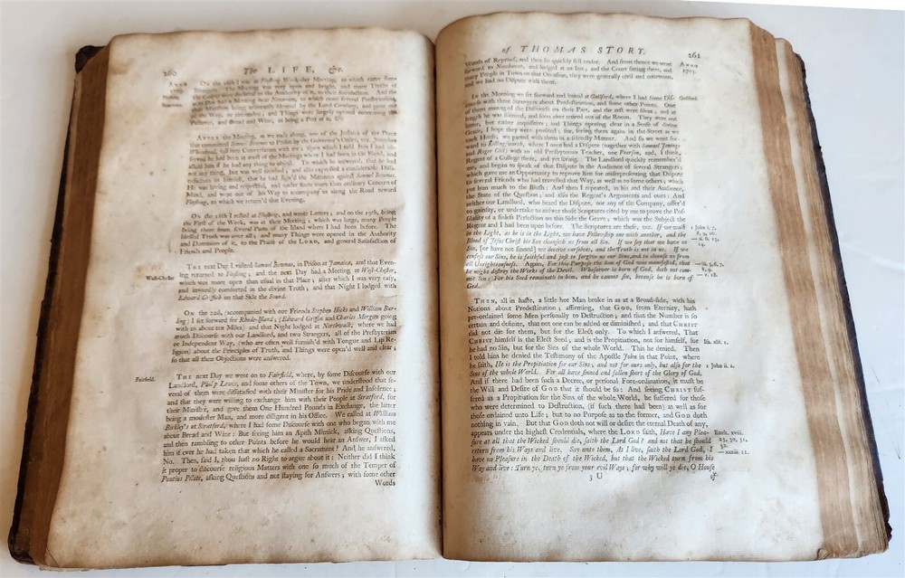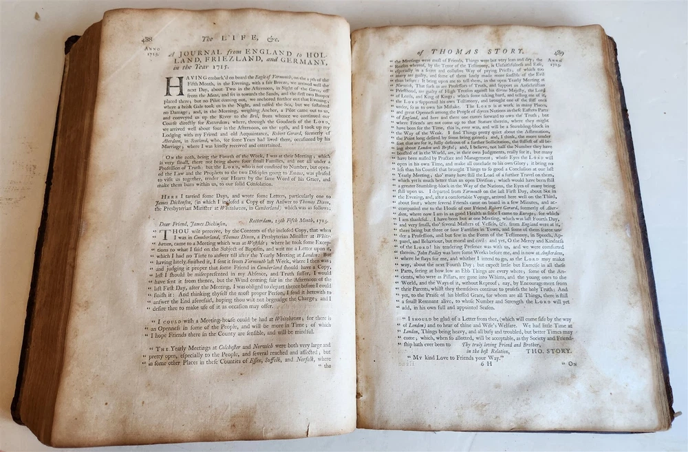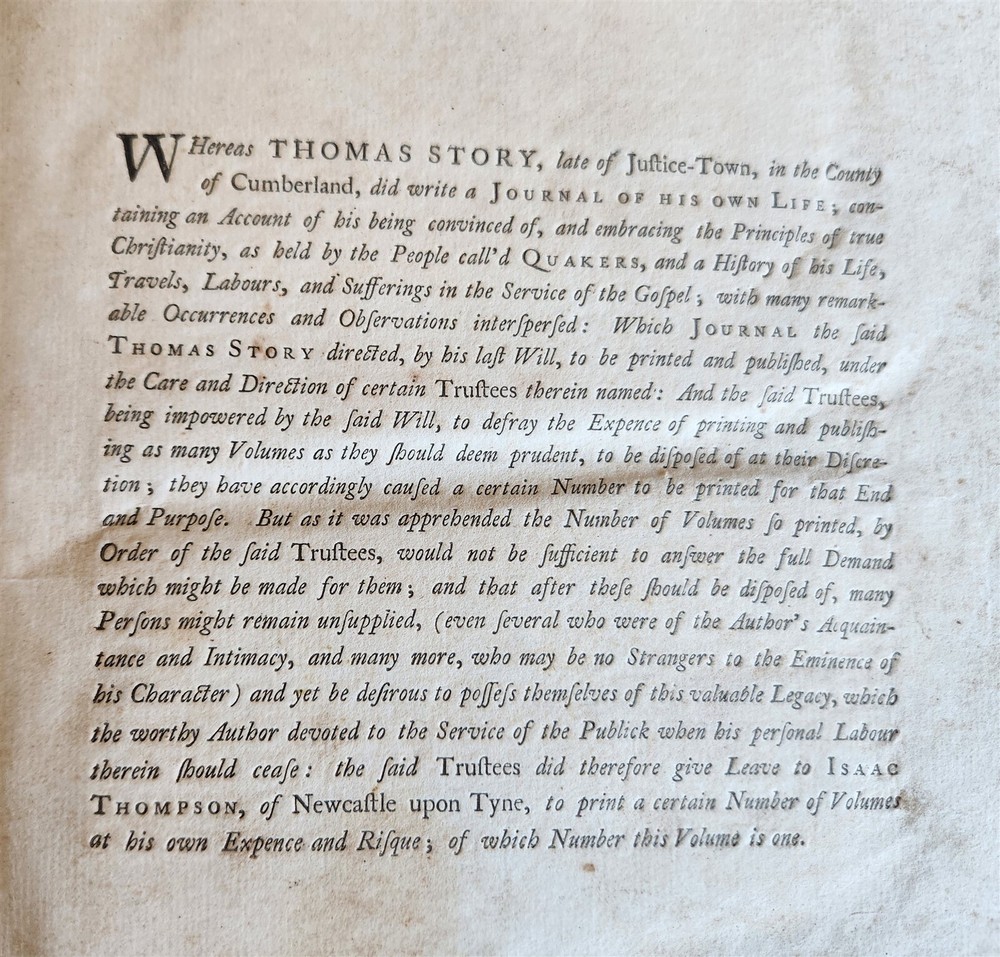 A Journal of the Life of Thomas Story. Containing, an Account of His Remarkable Convincement of, and Embracing the Principles of Truth, as Held by the People Called Quakers; and also, of His Travels and Labours in the service of the Gospel: with Many other Occurrences and Observations. Newcastle Upon Tyne, 1747 Folio: 9 by 13" First edition iv, 768, 8 pp. Period calf, boards holding but nearly detached, some damages to the leather Good interior, with some foxing Text in English =================================== Please see my other auctions Thank You Refund Policy: We will issue a FULL REFUND, 100% money back if you are not satisfied with your purchase. Items must be returned to us within 20 days in order to receive a refund or replacement. Buyer is responsible for shipping costs. Powered by SixBit's eCommerce Solution