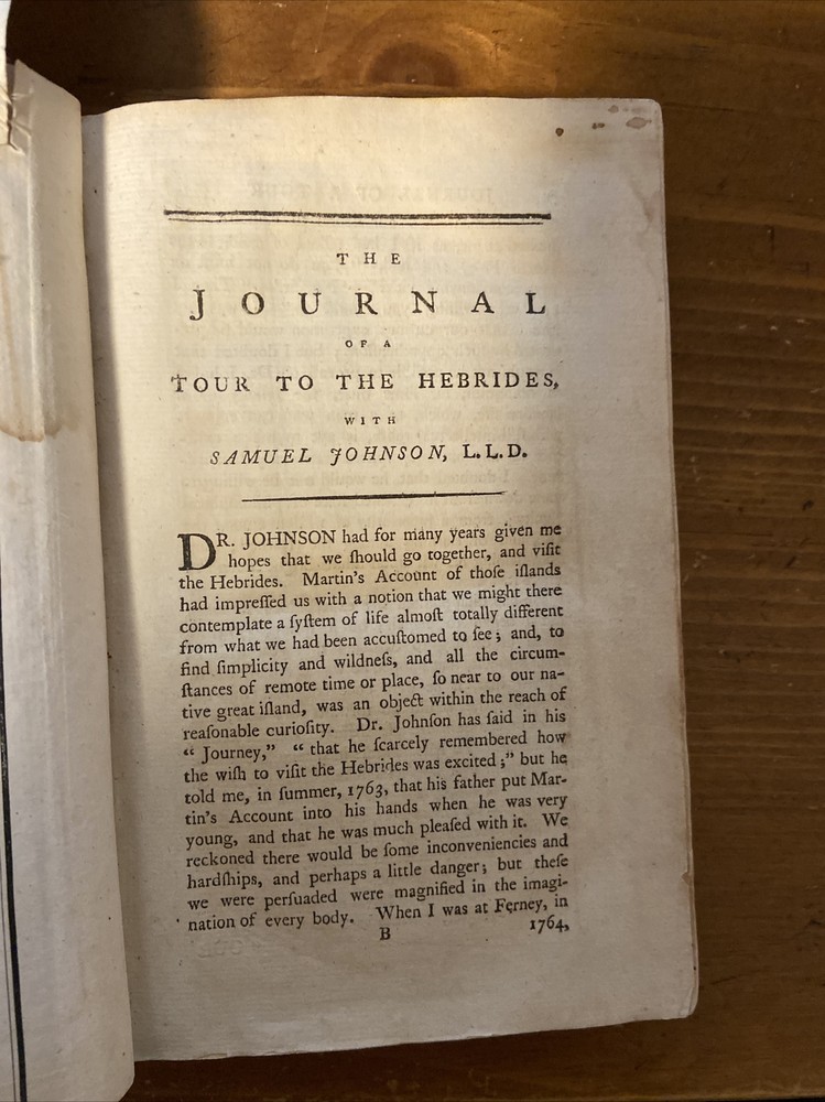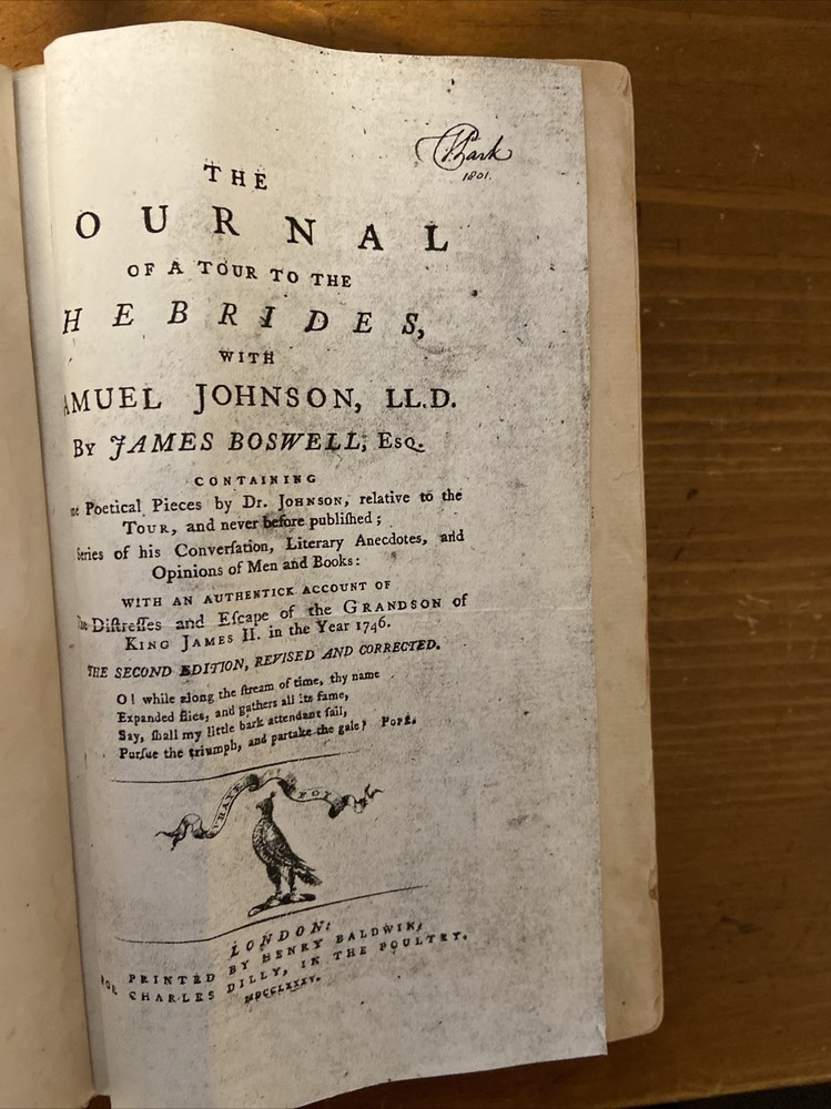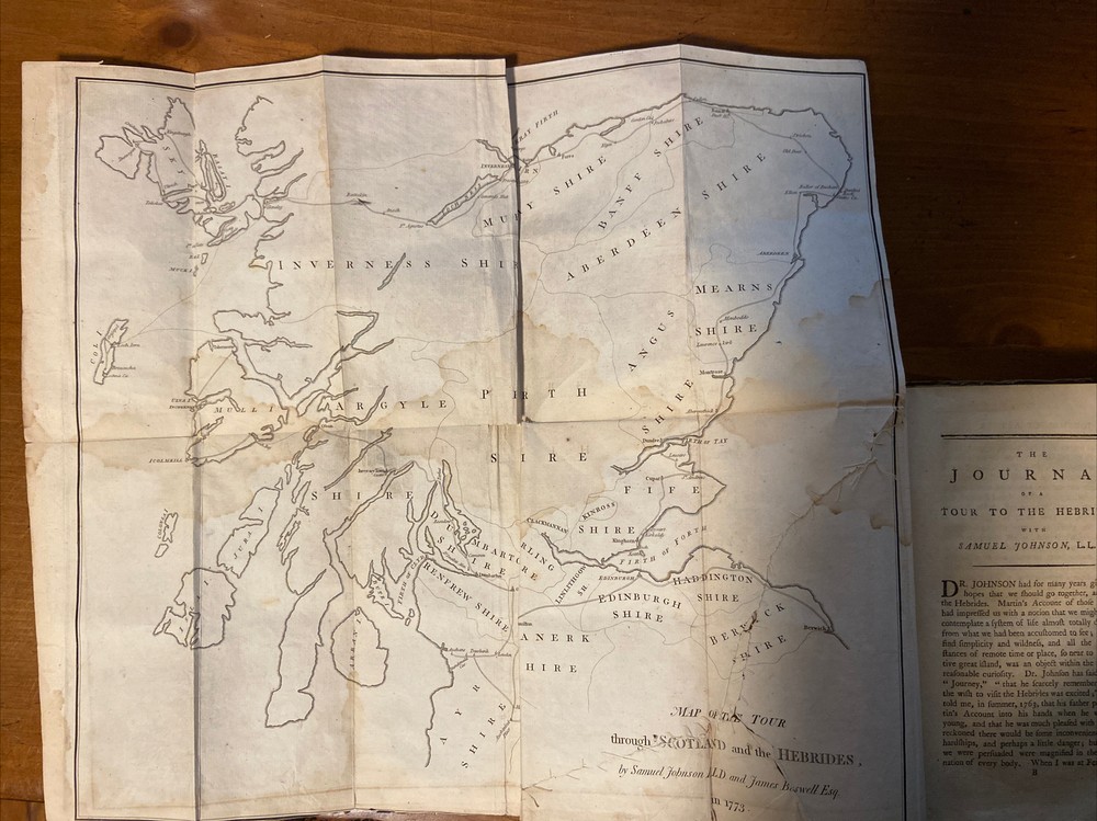 1785 Journal of a tour to the Hebrides; Boswell’s Tour; Scotland; As Is. 8 x 5 inches. 1/2 leather binding with front board missing. 442 pages plus advertisement. Spine worn. Title page replaced with facsimile. The large fold out map, a rarity in itself, is present with and old stitch repair. More affordable example.
