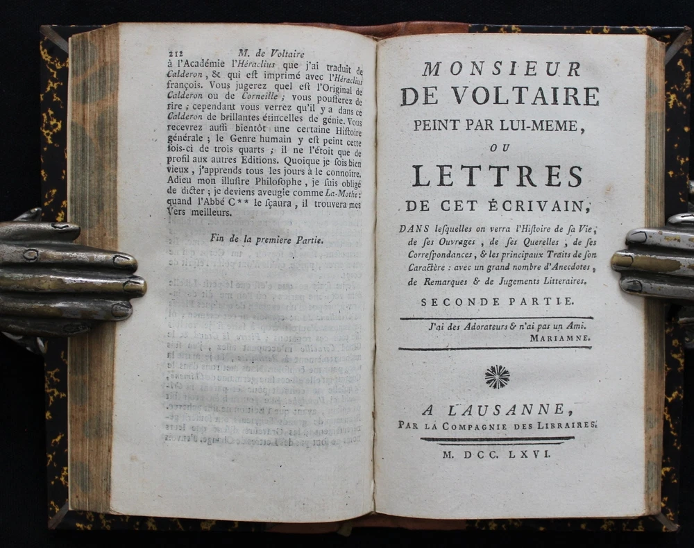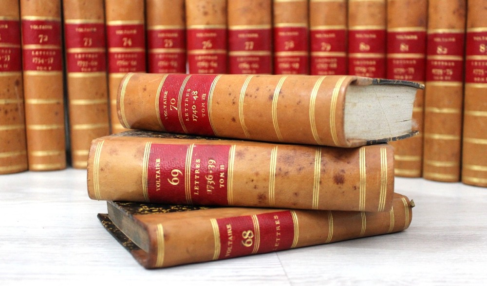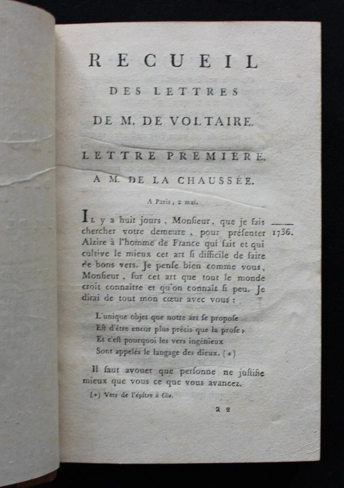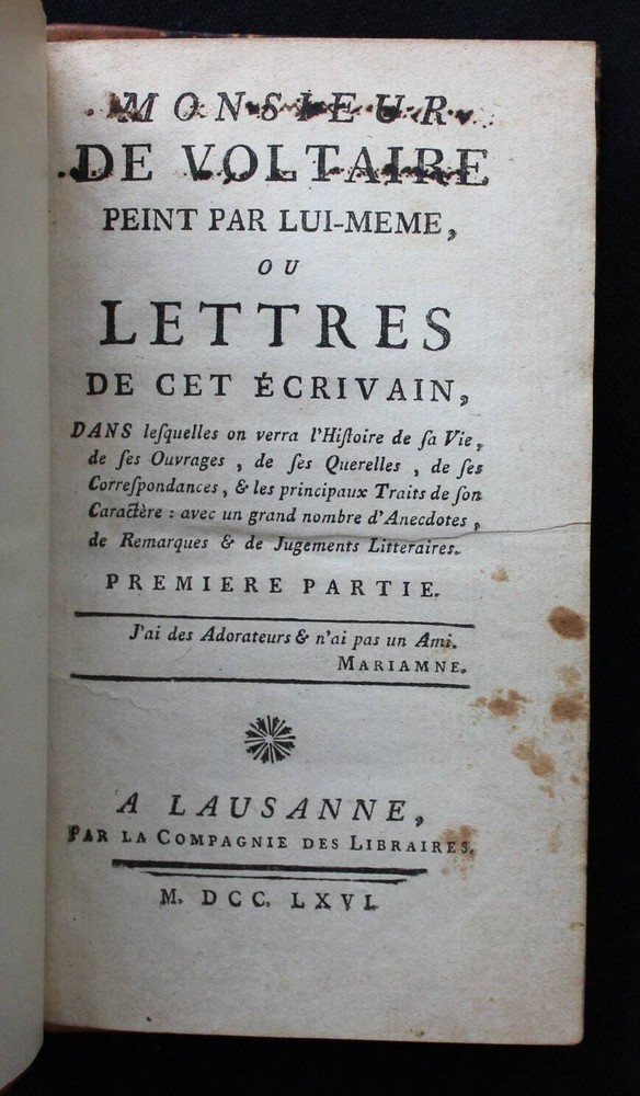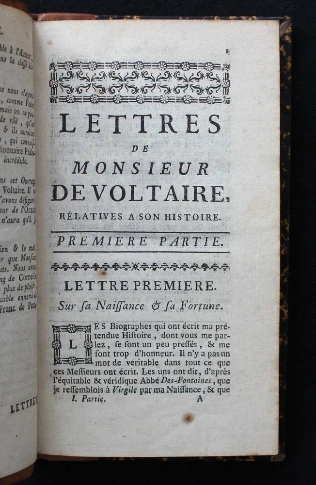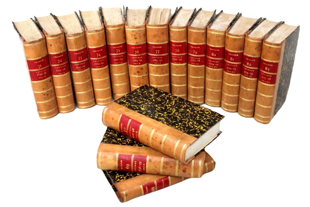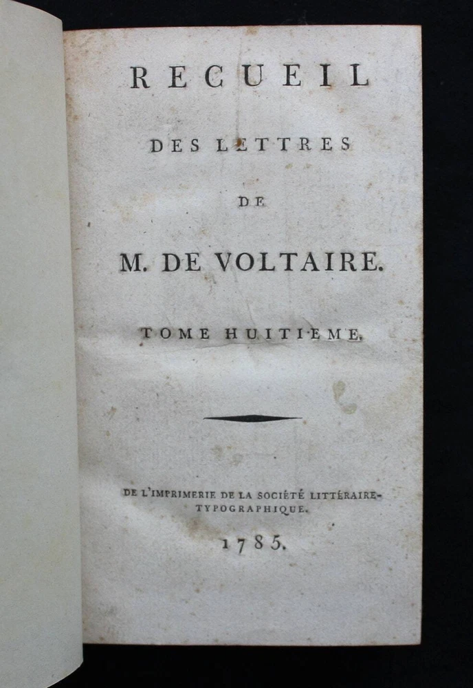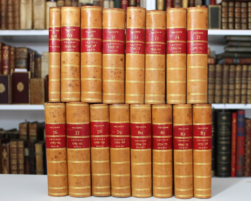 Step into the world of one of the Enlightenment era's greatest minds with this extraordinary collection of "Collection of Letters from Mr. de Voltaire". Published in 1785, this comprehensive 16-volume set comprises a total of 7,636 pages and offers a profound insight into the literary correspondence of Voltaire. "Recueil de Lettres de M. de Voltaire". Kehl, Imprimerie de la Société Littéraire-Typographique, 1785. 18 x 12 cm. (212 + 70 + 46) + 467 + 487 + 528 + 479 + 480 + 479 + 527 + 547 + 515 + 478 + 468 + 467 + 480 + 442 + 464 pages. Text in French. Original half leather bindings. Very good condition. These volumes, titled 'Recueil de Lettres de M. de Voltaire,' correspond to volumes 68 through 83 of the Complete Works of Voltaire. Please note that volumes 2 through 7 of this collection are missing the title pages. Additionally, it's important to note that volume 1 in this set doesn't correspond to the 1785 collection but contains the titles 'Monsieur de Voltaire Peint par Lui-Même, ou Lettres de Cet Ecrivain. Premier Partie. Second Partie' (Lausanne, 1766) and 'Le Docteur Pansophe, ou Lettres de Monsieur de Voltaire' (London, 1767). Please examine the images carefully as they are part of the description! François-Marie Arouet (French: [fʁɑ̃swa maʁi aʁwɛ]; 21 November 1694 - 30 May 1778), known by his nom de plume M. de Voltaire, was a French Enlightenment writer, philosopher (philosophe), satirist, and historian. Famous for his wit and his criticism of Christianity (especially of the Roman Catholic Church) and of slavery, Voltaire was an advocate of freedom of speech, freedom of religion, and separation of church and state. Voltaire was a versatile and prolific writer, producing works in almost every literary form, including plays, poems, novels, essays, histories, but also scientific expositions. He wrote more than 20,000 letters and 2,000 books and pamphlets. Voltaire was one of the first authors to become renowned and commercially successful internationally. He was an outspoken advocate of civil liberties and was at constant risk from the strict censorship laws of the Catholic French monarchy. His polemics witheringly satirized intolerance and religious dogma, as well as the French institutions of his day. His best-known work and magnum opus, Candide, is a novella which comments on, criticizes and ridicules many events, thinkers and philosophies of his time, most notably Gottfried Leibniz and his belief that our world is the "best of all possible worlds".