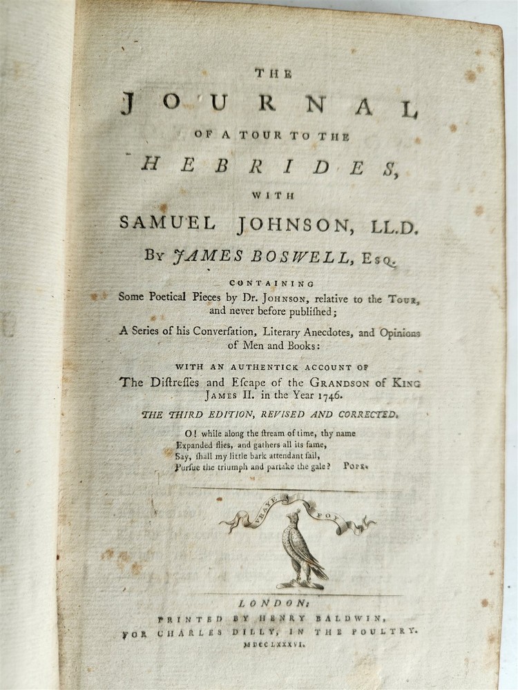 A JOURNAL of a TOUR to HEBRIDES with SAMUEL JOHNSON The Journal of a Tour to the Hebrides, with Samuel Johnson, LL.D. By James Boswell, Esq. Containing Some Poetical Pieces by Dr. Johnson, relative to the Tour, and never before published; A Series of his Conversation, Literary Anecdotes, and Opinions of Men and Books: With an Authentick Account of the Distresses and Escape of the Grandson of King James II. In the Year 1746... by JAMES BOSWELL London; 1786 Size: 5 3/4 by 8 3/4" 412 pp. Original full calf, worn, marbled endpapers, occasional foxing, some margins cut short Otherwise good condition Text in English ===================== The Journal of a Tour to the Hebrides with Samuel Johnson, LL.D. is a travel journal by Scotsman James Boswell first published in 1785. In 1773, Boswell enticed his English friend Samuel Johnson to accompany him on a tour through the highlands and western islands of Scotland. Johnson was then in his mid-sixties and well known for his literary works and his Dictionary. The two travellers set out from Edinburgh and skirted the eastern and northeastern coasts of Scotland, passing through St Andrews, Aberdeen and Inverness. They then passed into the highlands and spent several weeks on various islands in the Hebrides, including Skye, Coll, and Mull. After a visit to Boswell's estate at Auchinleck, the travellers returned to Edinburgh. Johnson published his Journey to the Western Islands of Scotland on 18 January 1775. It was widely read, discussed and criticised, especially for some sceptical remarks Johnson made questioning the authenticity of the Ossian poems, which were then all the rage. After Johnson's death in 1784, Boswell published his Journal of a Tour to the Hebrides. This work was based on a diary Boswell had kept during the 1773 tour and included detailed descriptions of where he and Johnson had gone and what Johnson had said. The Journal served as a teaser for the longer biography Boswell was preparing for publication, his Life of Samuel Johnson, which would exhibit the same qualities. Boswell's Journal and Johnson's Journey make an interesting study in contrasts. Johnson considers things philosophically and maintains a high level of generality. Boswell's approach is more anecdotal, even gossipy, and succeeds in large part because of Boswell's keen eye and ear for detail. Both accounts are still widely read and admired today. ===================== Please see my other auctions Thank You Refund Policy: We will issue a FULL REFUND, 100% money back if you are not satisfied with your purchase. Items must be returned to us within 20 days in order to receive a refund or replacement. Buyer is responsible for shipping costs. Powered by SixBit's eCommerce Solution