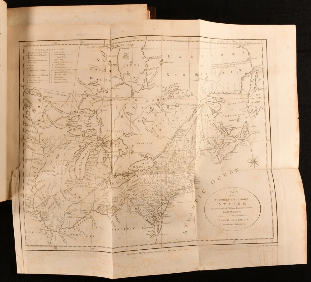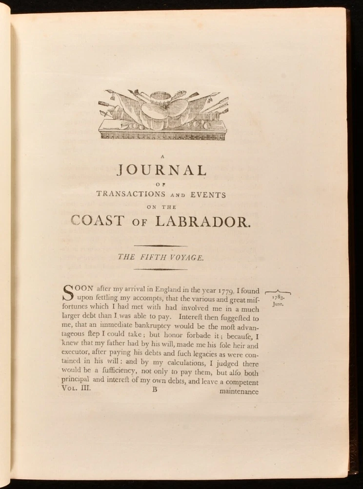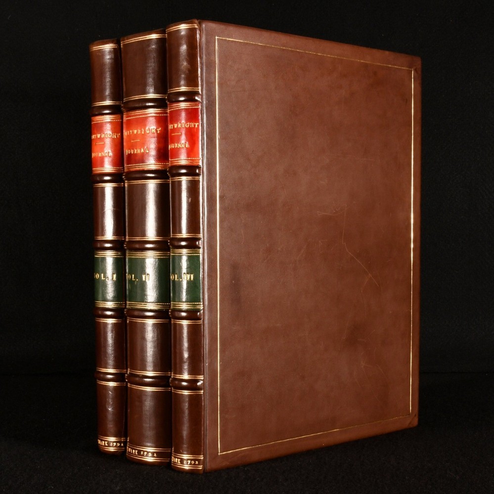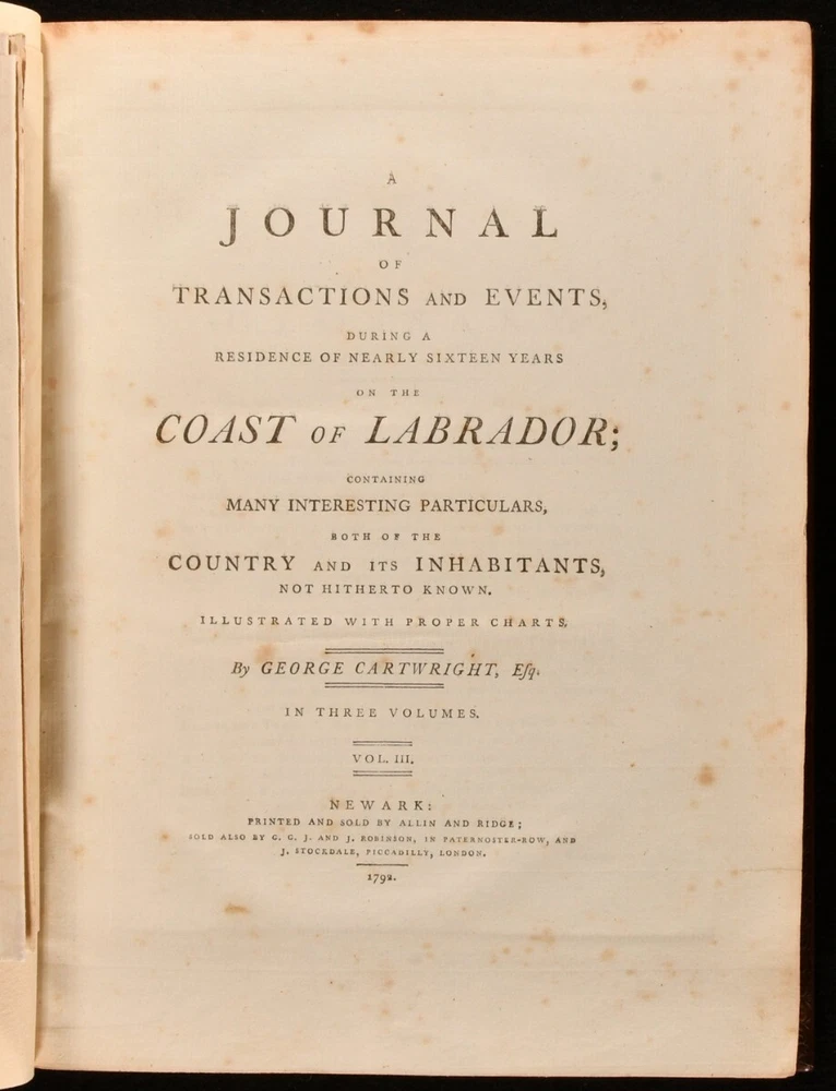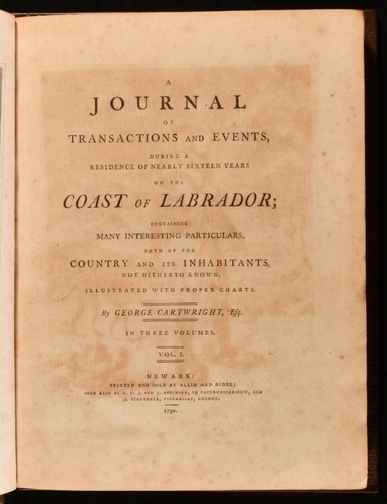 Click here to see our other books! A Journal of Transactions and Events, During a Residence of Nearly Sixteen Years on the Coast of Labrador George Cartwright 1792 Printed and sold by Allin and Ridge : Newark 12.5" by 10.5" xvi [7], 2-287; 505; 248 [1], 2-15pp SUMMARY An exceptional copy of the three volume first edition of English army officer, trader and explorer George Cartwright's journal relaying his sixteen year exploration of Labrador and Newfoundland. An Important Work,First Edition,Folding Plates,Illustrated,Leather Binding Overall Condition: Near Fine This book weighs 6 KG when packed UK Postage: £ 4.49 US Postage: £ 47.99 EU Postage : £ 28.99 European Postage: £ 49.99 Asia Postage: £ 79.99 Worldwide Postage: £ 159.99 DESCRIPTION One of the earliest authoritative works on Labrador, in excellent full calf bindings. Illustrated with a portrait frontispiece to volume I, and two folding maps, printed on three sheets. Collated, complete. Cartwright, a former British army officer, was engaged by a group of British merchants to trade with the native Canadian Esquimaux. Between 1770 and 1786, he made six fishing and trapping expeditions to Labrador, establishing posts near Sandwich Bay. Cartwright's journal provides a detailed account of the fur trade, the native North American population, and observations on the natural history and meteorology of Labrador, along with a glossary of English language words particular to Canadian life at the time. The ordinary paper issue, ESTC reference no. T133714 Written in an unadorned style, Cartwright informs his readers: ''Tho I have often slept whole nights on mountains as high as that of famed Parnassus, yet, never having taken a nap on its sacred summit, it cannot be expected, that I should have awoke a Poet'. CONDITION Rebound in full calf, with endpapers renewed. Externally, excellent, with minor rubbing to boards. Internally, firmly bound. Pages bright, with scattered light spotting throughout each volume, and more significant spotting to the rear of volume I. The odd light pencil marginal notation. Overall Condition: Near Fine GLOSSARY OF TERMS Overall Condition (Dustwrapper condition rating is shown after that for the book itself, where a dustwrapper is present) Fine - Very well preserved copy showing very little wear Very Good Indeed - Only one or two minor faults, really a very attractive copy Very Good - Quite a wide term meaning no major faults but probably several smaller ones often expected given the age of the book, but still a respectable copy Good - Meaning not very good. Some more serious faults as will be described in the condition report under 'condition' Good Only - Meaning one or more faults that could really do with repair Fair - As with good only above but with other faults leaving a compromised copy even after repair Poor - Really bad and possibly seriously incomplete. We only sell books in this condition where their rarity or value makes them attractive none the less. Major defects will be described. GUARANTEE We offer a full money back guarantee on our descriptions. Please ask for details and conditions. We prefer PAYPAL. If you pay via PAYPAL we will post the item off the same or the next working day with the postage you have selected. Please note we cannot accept USD cheques
