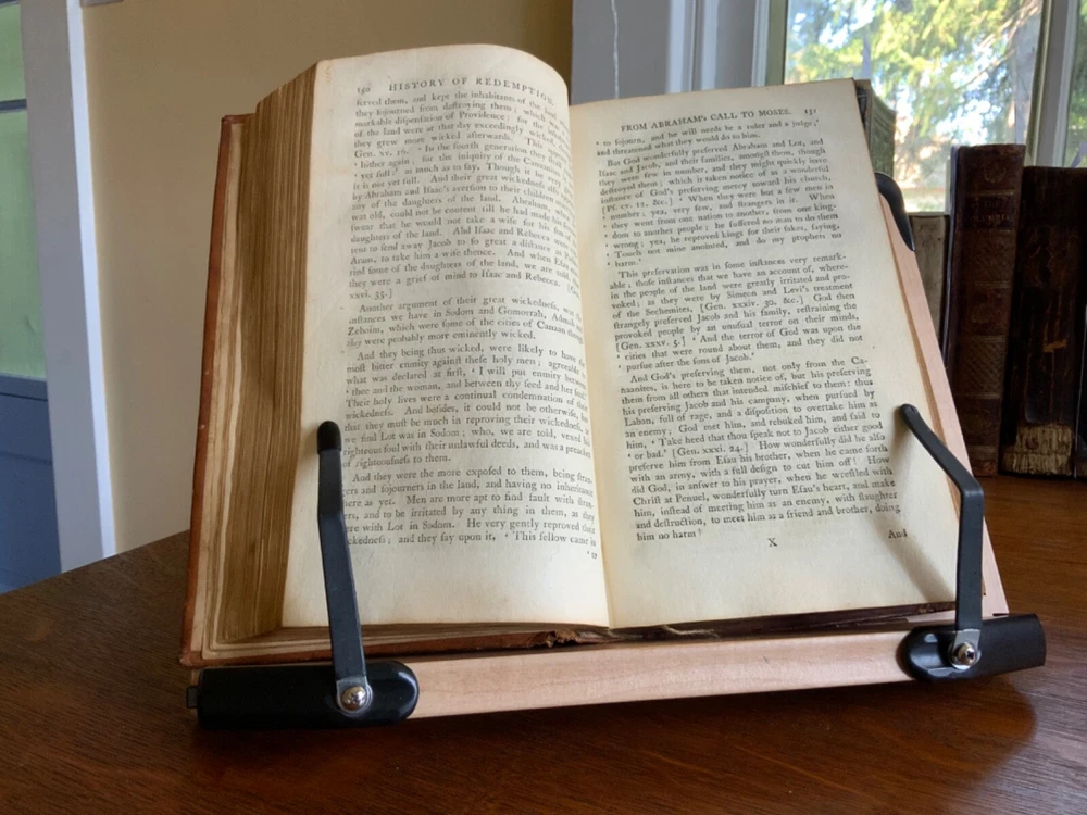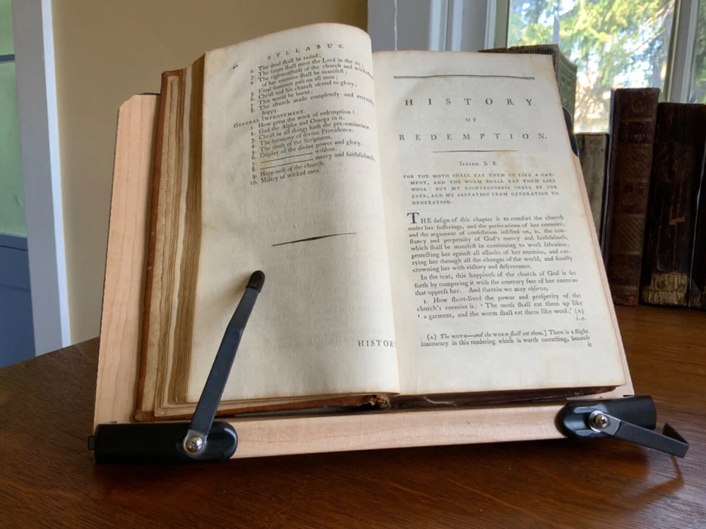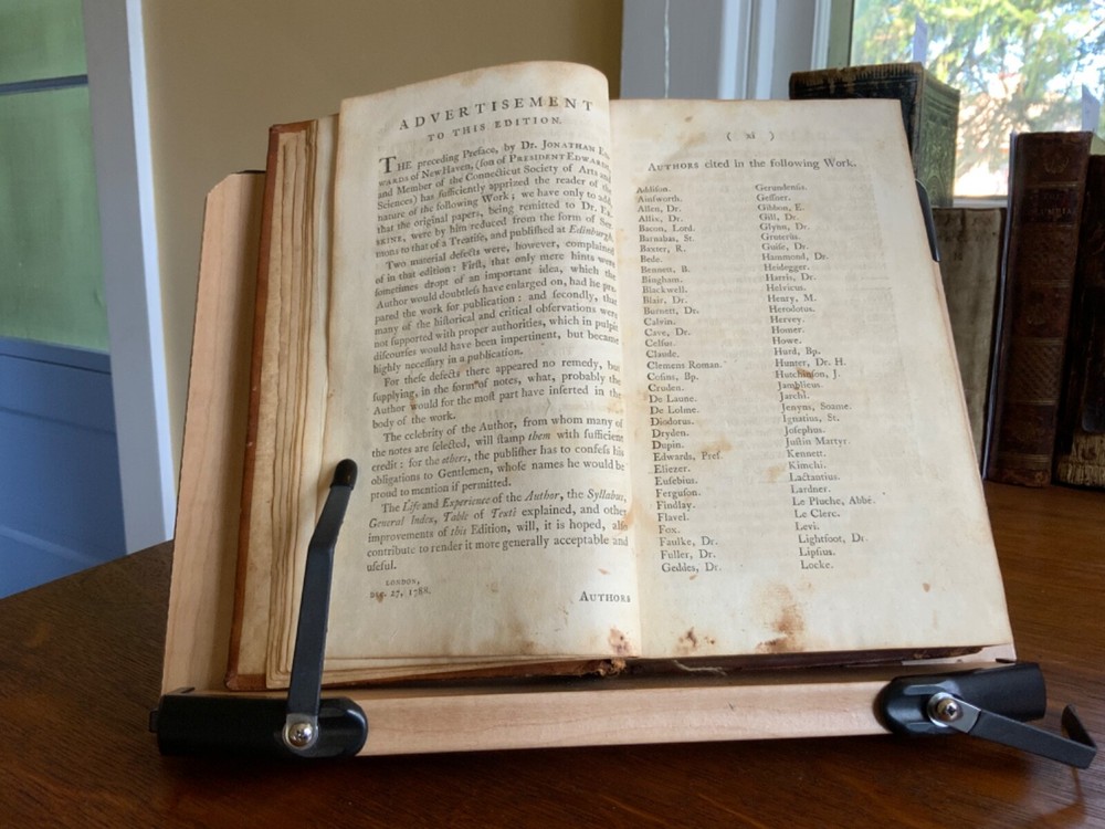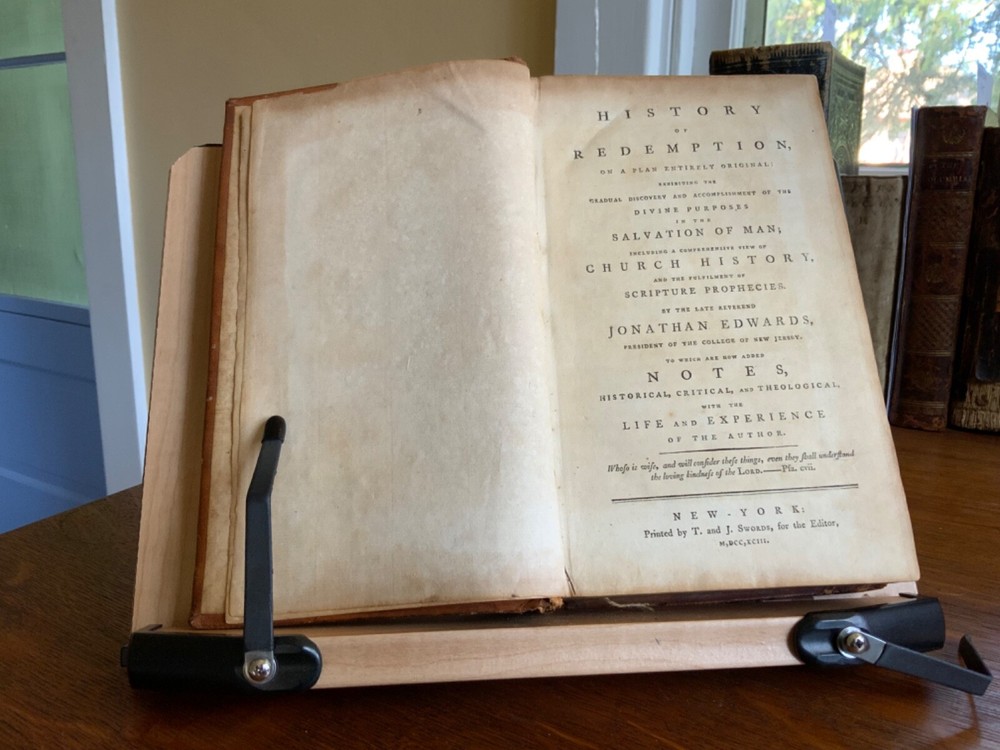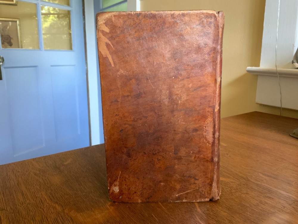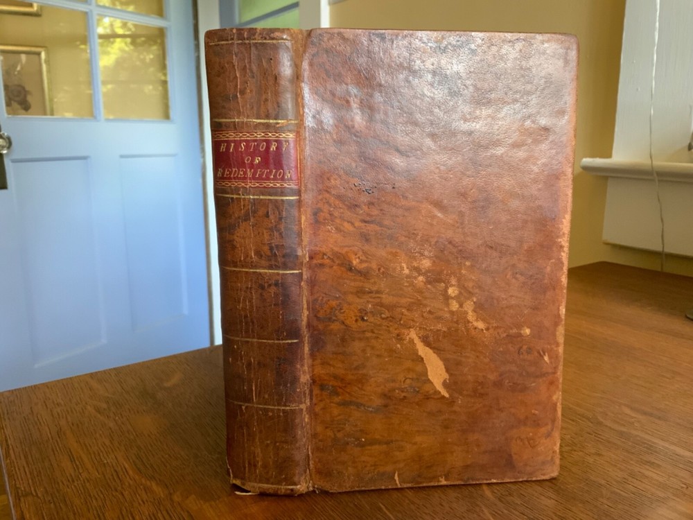 History of Redemption, on a Plan Entirely Original: Exhibiting the Gradual Discovery and Accomplishment of the Divine Purposes in the Salvation of Man; Including a Comprehensive View of Church History, and the Fulfilment of Scripture Prophecies. By The Late Reverend Jonathan Edwards, President of the College of New Jersey. To Which are Now Added Notes, Historical, Critical and Theological with the Life and Experience of the Author, Printed by T. & J. Swords, for the Editor, New York, 1793, 573 pp plus index, full mottled leather, 8.5 x 5.5”, 8vo. In good condition. Lacking frontis. Light wear to extremities with minor scuffing to corners and edges. Small abrasions to surface of leather, as to be expected. Leather remains soft and rich in color. Slight peeling at edges of rear boards. Light creasing down center of spine with small patch of loss at foot. Gilt tooling and ruling clean and bright. Old hand ownership on pastedown dated Oct. 1905. Evidence of a previous bookplate present. Dampness staining to pastedown and edge of fly. Fly nearly detached with worming to gutter. Light toning to edges of text block with minor instances of age stain. Free of known marginalia. Please see photos. Jonathan Edwards (the younger) (1745-1801) was an American theological and linguist. As a theologian, his fame rest upon his reply to Charles Chauncey upon the salvation of all men, in which he defended the orthodox evangelical doctrine. A great deal of religious controversy raged in New England during his lifetime. He supported abolition of the slave trade and of slavery, unlike his slave owning father. He wrote “Some Observations upon the Slavery of Negroes” in the Connecticut Journal .. it was this work along with his other sermons that were among the first, along with Samuel Hopkins’ writings, to question the freedoms of slaves in the New England ministry. COLR1793FLMX-1023