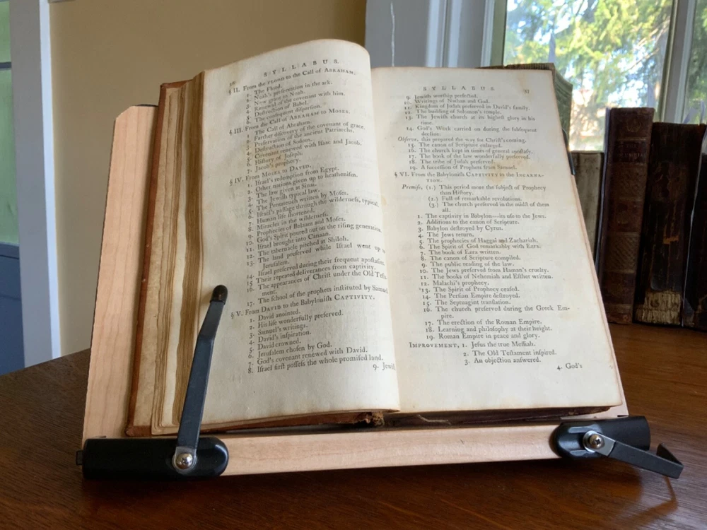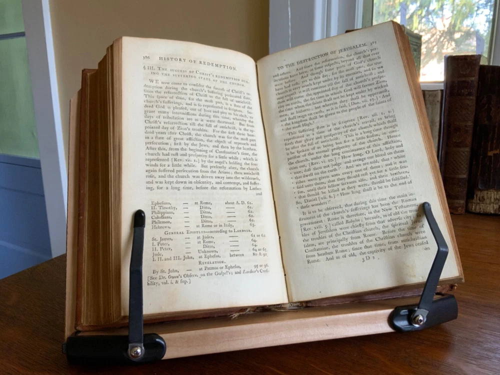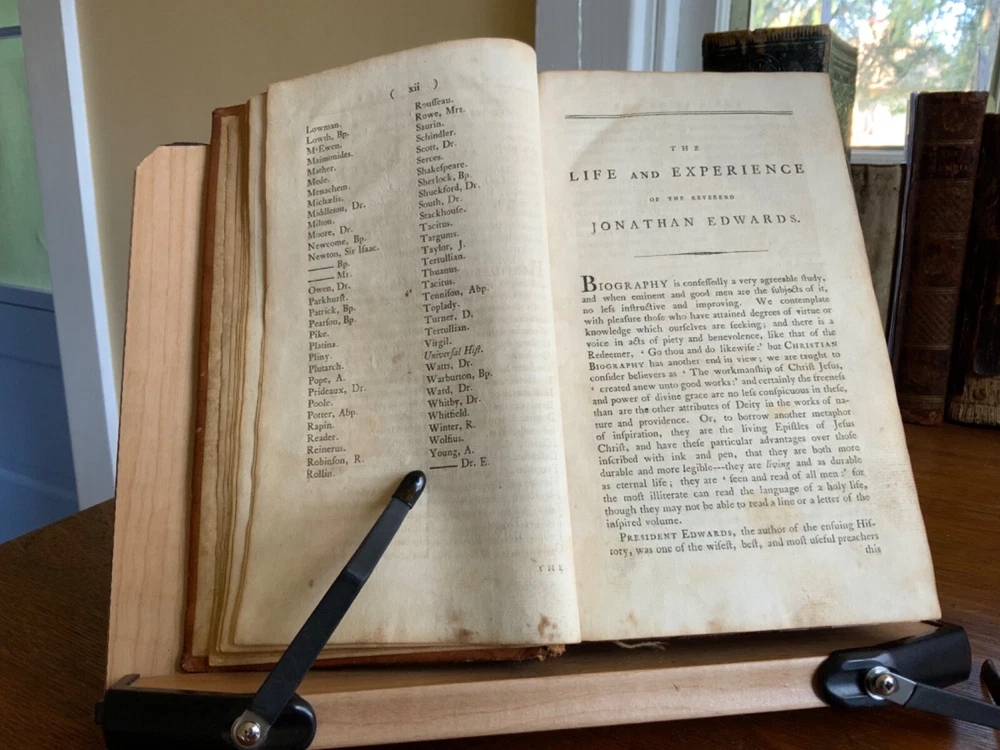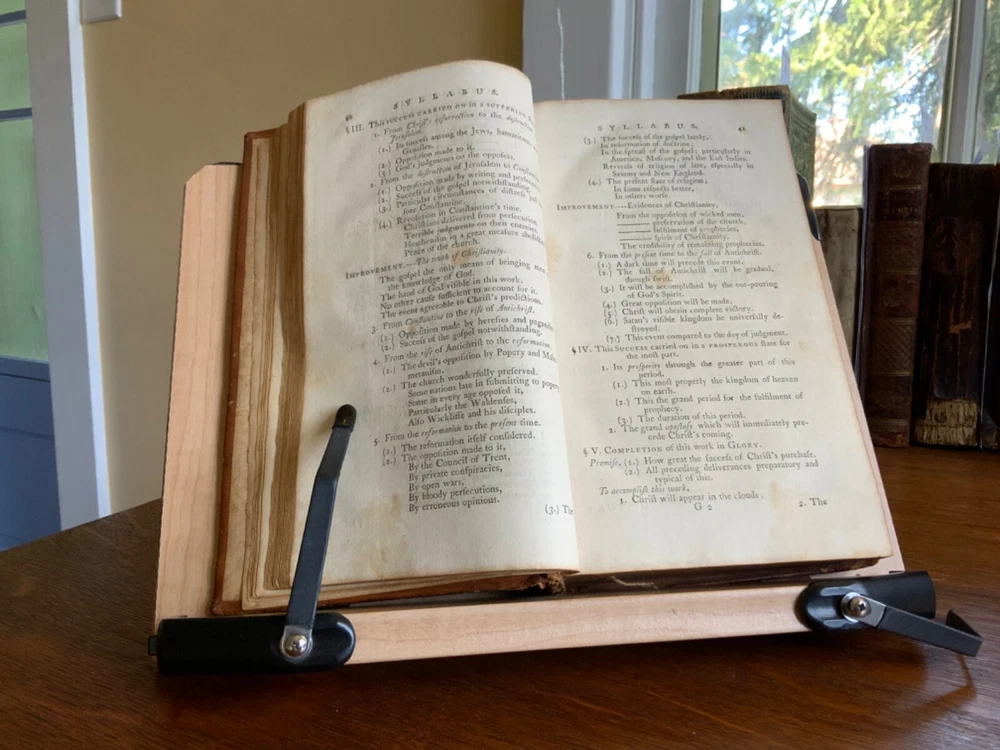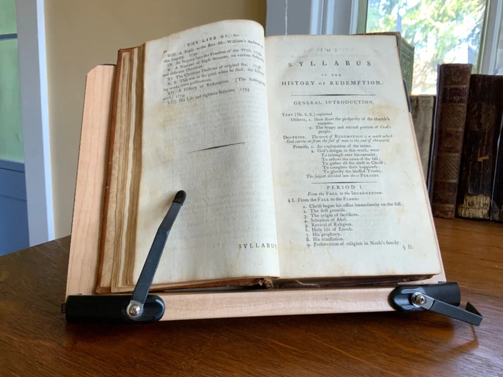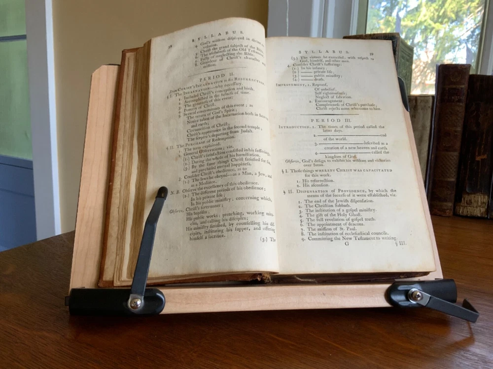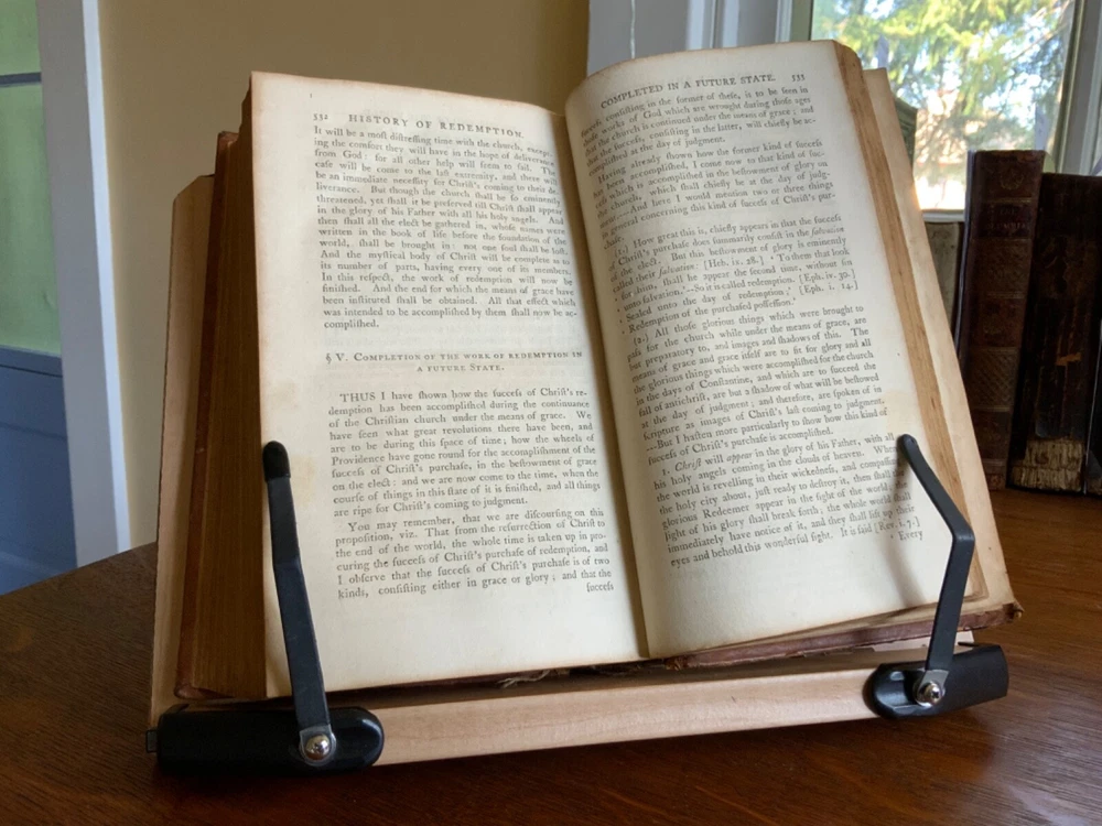 History of Redemption, on a Plan Entirely Original: Exhibiting the Gradual Discovery and Accomplishment of the Divine Purposes in the Salvation of Man; Including a Comprehensive View of Church History, and the Fulfilment of Scripture Prophecies. By The Late Reverend Jonathan Edwards, President of the College of New Jersey. To Which are Now Added Notes, Historical, Critical and Theological with the Life and Experience of the Author, Printed by T. & J. Swords, for the Editor, New York, 1793, 573 pp plus index, full mottled leather, 8.5 x 5.5”, 8vo. In good condition. Lacking frontis. Light wear to extremities with minor scuffing to corners and edges. Small abrasions to surface of leather, as to be expected. Leather remains soft and rich in color. Slight peeling at edges of rear boards. Light creasing down center of spine with small patch of loss at foot. Gilt tooling and ruling clean and bright. Old hand ownership on pastedown dated Oct. 1905. Evidence of a previous bookplate present. Dampness staining to pastedown and edge of fly. Fly nearly detached with worming to gutter. Light toning to edges of text block with minor instances of age stain. Free of known marginalia. Please see photos. Jonathan Edwards (the younger) (1745-1801) was an American theological and linguist. As a theologian, his fame rest upon his reply to Charles Chauncey upon the salvation of all men, in which he defended the orthodox evangelical doctrine. A great deal of religious controversy raged in New England during his lifetime. He supported abolition of the slave trade and of slavery, unlike his slave owning father. He wrote “Some Observations upon the Slavery of Negroes” in the Connecticut Journal .. it was this work along with his other sermons that were among the first, along with Samuel Hopkins’ writings, to question the freedoms of slaves in the New England ministry. COLR1793FLMX-1023
