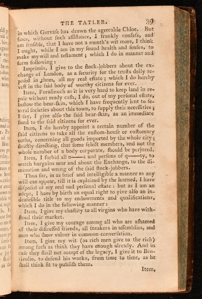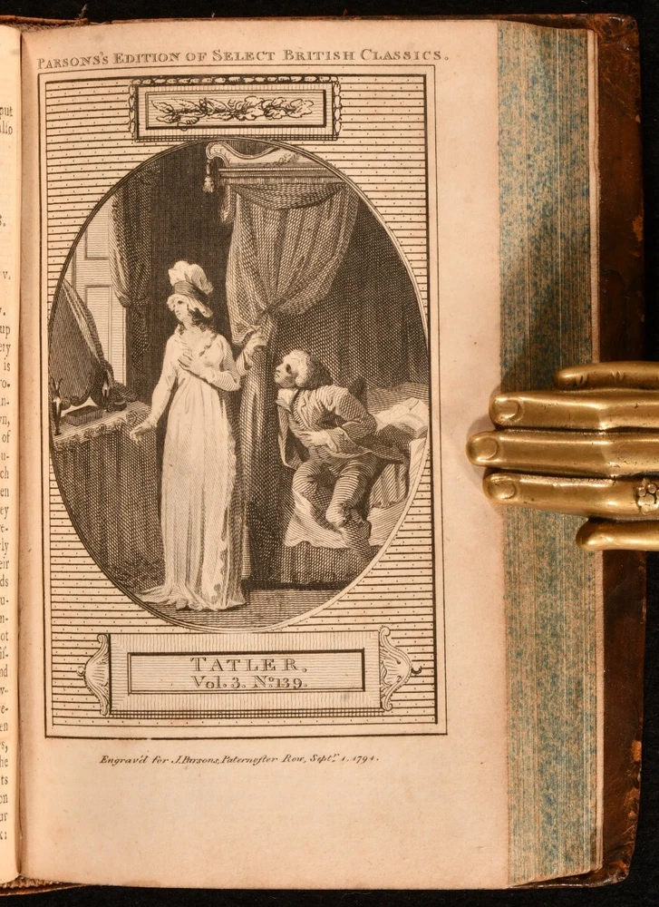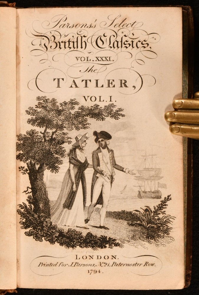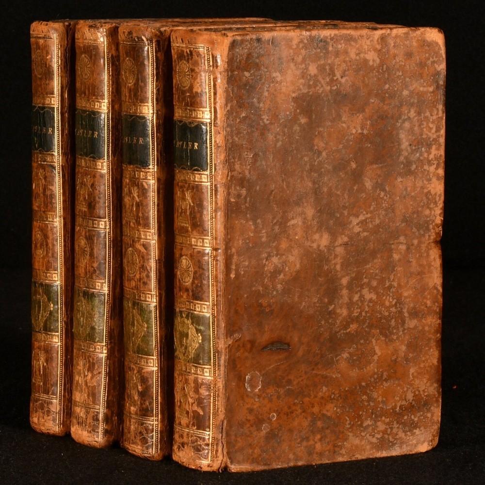Click here to see our other books! The Tatler Isaac Bickerstaff [Richard Steele] 1794 J. Parsons : London 6" by 3.5" v, 302, (9); iv, 331, (11); 316, (16); x, 310, (11)pp. SUMMARY A scarce complete four volume set of The Tatler literary and society journal as part of Parson's Select British Classics Series. Leather Binding,Scarce Overall Condition: Very Good This book weighs 2 KG when packed UK Postage: £ 3.99 US Postage: £ 29.99 EU Postage : £ 21.99 European Postage: £ 23.99 Asia Postage: £ 37.99 Worldwide Postage: £ 38.99 DESCRIPTION Four volume set. Parson's Select British Classics Series. The Tatler, a British literary and society journal begun in 1709 and published for two years. It insighted a new approach to journalism, featuring cultivated essays on contemporary manners. This format is said to have been copied in classics like The Spectator, The Rambler, and The Idler. Volume one is illustrated with five plates. Volume two is illustrated with five plates. Volume three is illustrated with four plates. Volume four is illustrated with three plates. Collated complete. CONDITION Bound in full tree calf. Externally, smart with light rubbing and bumping to the extremities. The odd mark to the board. Front joint starting but firm on volumes one and four. Internally, firmly bound. Pages are very bright and clean with the odd handling mark and light spotting to the endpapers. Contemporary ink inscription to the front endpaper. Overall Condition: Very Good GLOSSARY OF TERMS Overall Condition (Dustwrapper condition rating is shown after that for the book itself, where a dustwrapper is present) Fine - Very well preserved copy showing very little wear Very Good Indeed - Only one or two minor faults, really a very attractive copy Very Good - Quite a wide term meaning no major faults but probably several smaller ones often expected given the age of the book, but still a respectable copy Good - Meaning not very good. Some more serious faults as will be described in the condition report under 'condition' Good Only - Meaning one or more faults that could really do with repair Fair - As with good only above but with other faults leaving a compromised copy even after repair Poor - Really bad and possibly seriously incomplete. We only sell books in this condition where their rarity or value makes them attractive none the less. Major defects will be described. GUARANTEE We offer a full money back guarantee on our descriptions. Please ask for details and conditions. We prefer PAYPAL. If you pay via PAYPAL we will post the item off the same or the next working day with the postage you have selected. Please note we cannot accept USD cheques