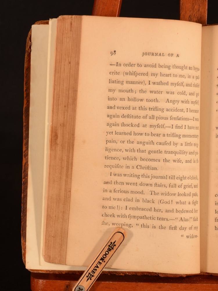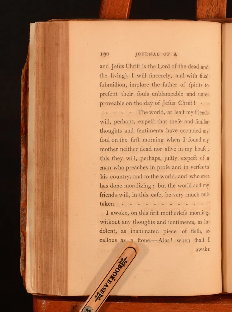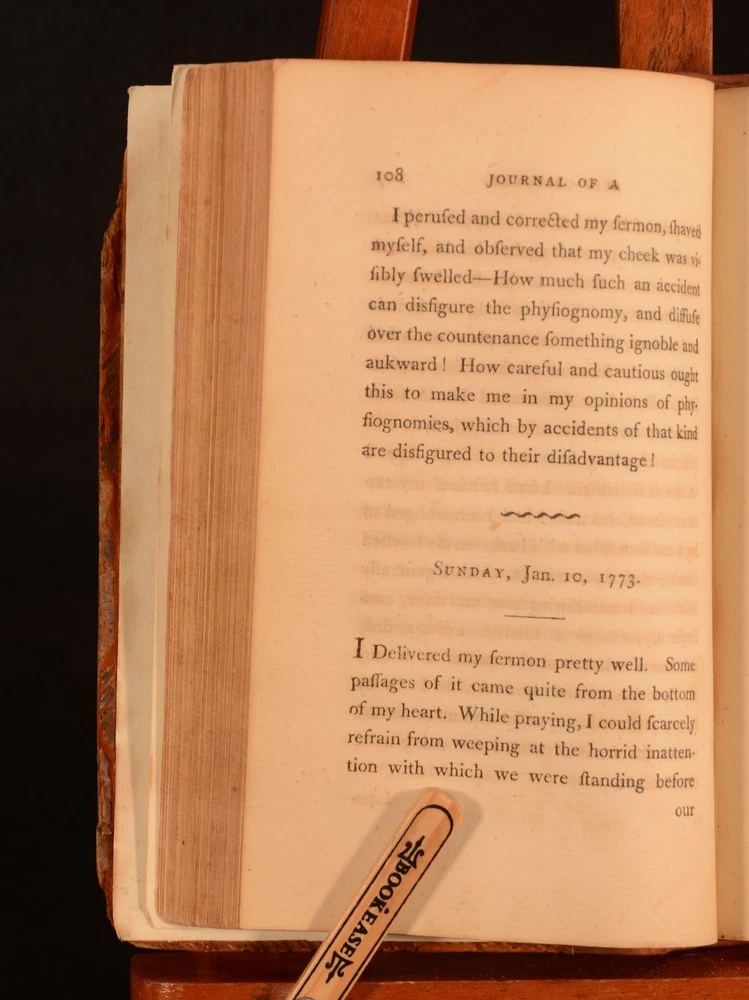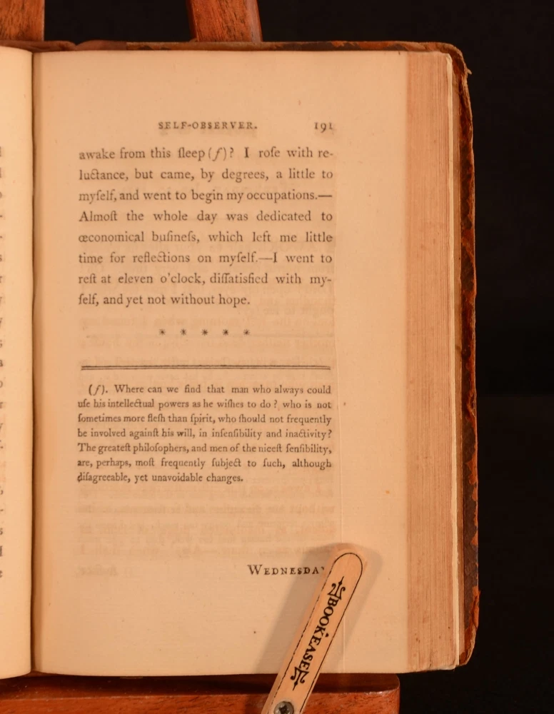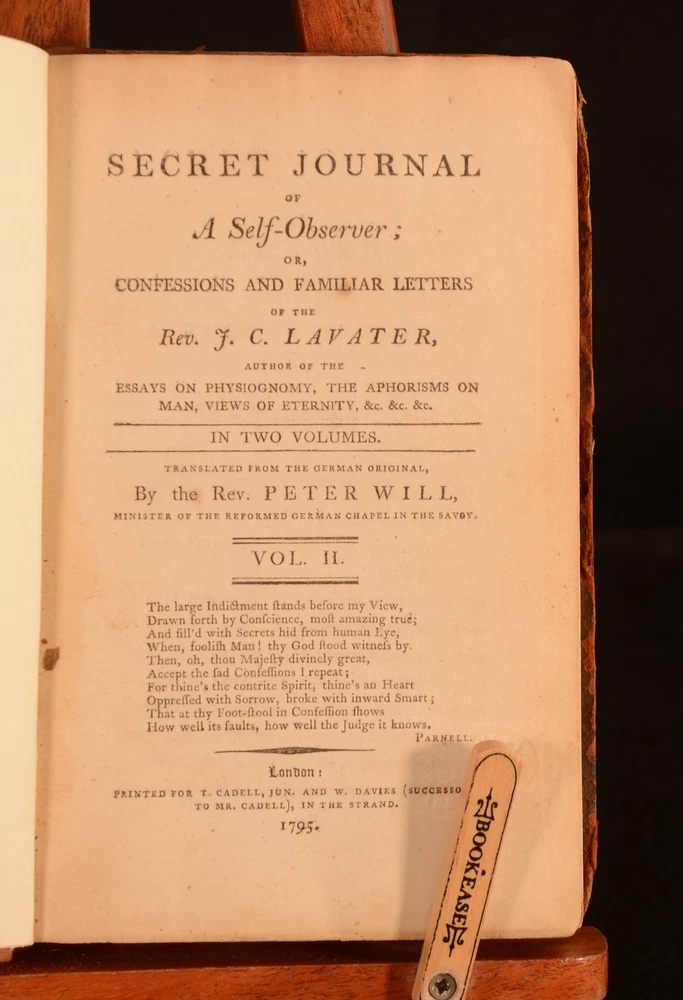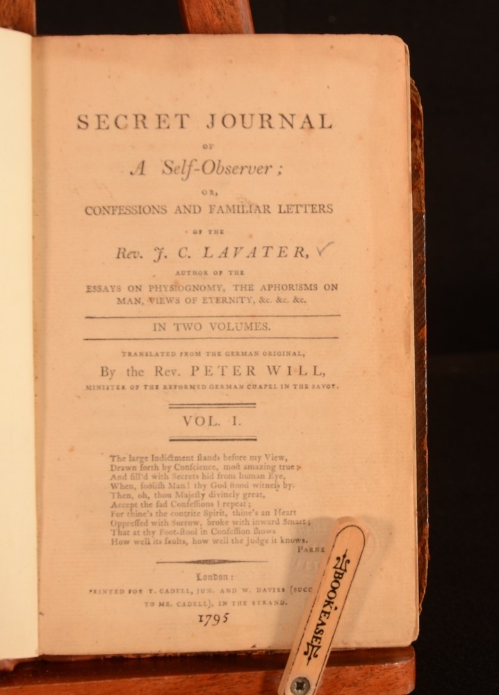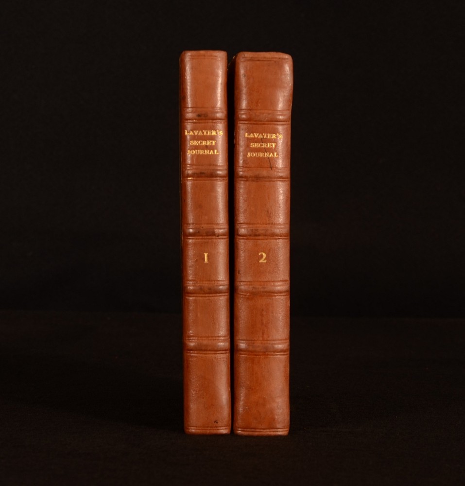 Click here to see our other books! Secret Journal of a Self-observer Or, Confessions and Familiar Letters of the Rev. J.C. Lavater J C Lavater; Peter Will 1795 T Cadell and W Davies : London 7.5" by 5" viii, 280pp; xxxv, 372pp SUMMARY An English translation of the Swiss poet, writer and philosopher Johann Kaspar Lavater's journal. Complete in two volumes. First thus, the first English translation. First Edition,Leather Binding Overall Condition: Very Good This book weighs 1 KG when packed UK Postage: £ 3.99 US Postage: £ 22.99 EU Postage : £ 16.99 European Postage: £ 17.99 Asia Postage: £ 22.99 Worldwide Postage: £ 28.99 DESCRIPTION J C Lavater was a pastor in the Zwinglian Church. Following his Holy Orders Lavater was consulted as a casuist. This was due to his genuine depth of conviction. As a casuist Lavater travelled throughout Germany and was widely received. Lavater's writings on mysticism were extremely popular. However, He was best known for his physiognomy works. Lavater had the early belief that physiognomy related to the specific character traits of individuals. These ideas were outlined in his 'Physiognomische Fragmente zur Beforderung der Menschenkenntnis' which was first published between 1775 and 1778. This work was translated by Rev Peter Will, the minister of the reformed German chapel in the Savoy. This is the first English translation of this work. ESTC no. T137189. A fascinating insight into this important figure's mind. CONDITION In full calf bindings. Rebacked, with original boards preserved. Externally, rubbed to the boards, heavier to the extremities. Internally, firmly bound. Peabody Institute library blind-stamp to the title page. Item number stamped to the verso of title page. Prior owner's copperplate inscription to the margin of page 129 to volume II. Internally, both volumes are firmly bound. Pages are generally bright, with occasional scattered spots. Heavier to pages 120-121 of volume I. Overall Condition: Very Good GLOSSARY OF TERMS Overall Condition (Dustwrapper condition rating is shown after that for the book itself, where a dustwrapper is present) Fine - Very well preserved copy showing very little wear Very Good Indeed - Only one or two minor faults, really a very attractive copy Very Good - Quite a wide term meaning no major faults but probably several smaller ones often expected given the age of the book, but still a respectable copy Good - Meaning not very good. Some more serious faults as will be described in the condition report under 'condition' Good Only - Meaning one or more faults that could really do with repair Fair - As with good only above but with other faults leaving a compromised copy even after repair Poor - Really bad and possibly seriously incomplete. We only sell books in this condition where their rarity or value makes them attractive none the less. Major defects will be described. GUARANTEE We offer a full money back guarantee on our descriptions. Please ask for details and conditions. We prefer PAYPAL. If you pay via PAYPAL we will post the item off the same or the next working day with the postage you have selected. Please note we cannot accept USD cheques