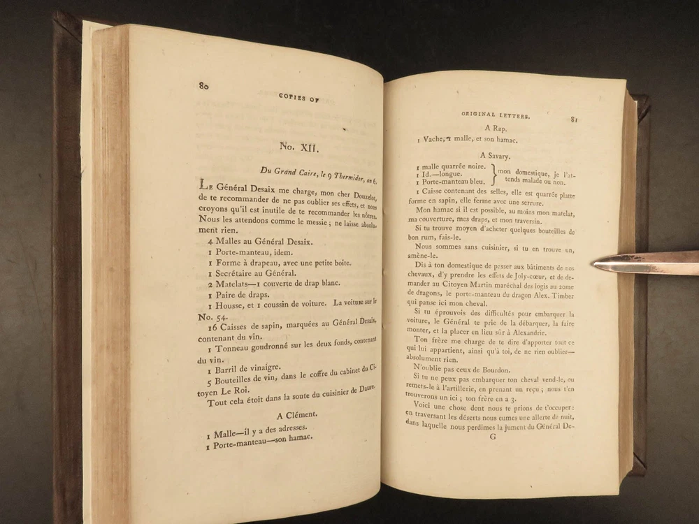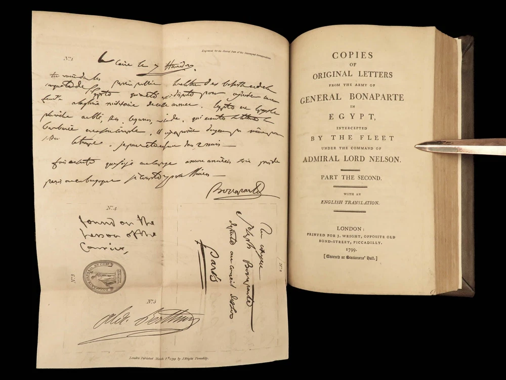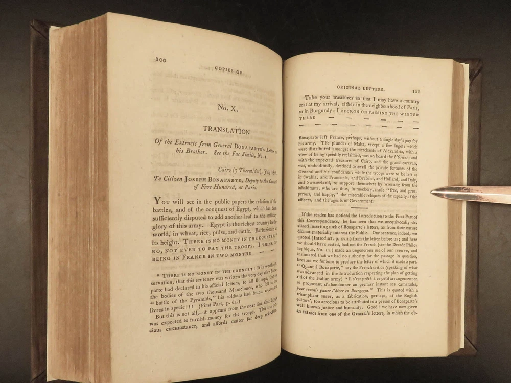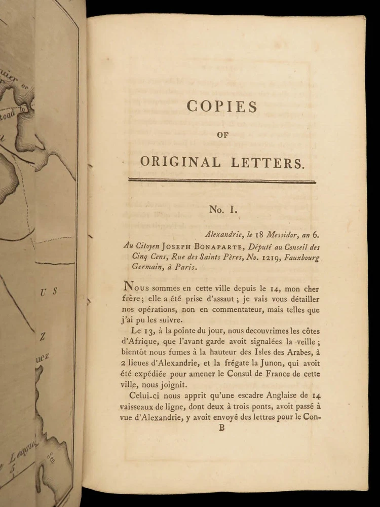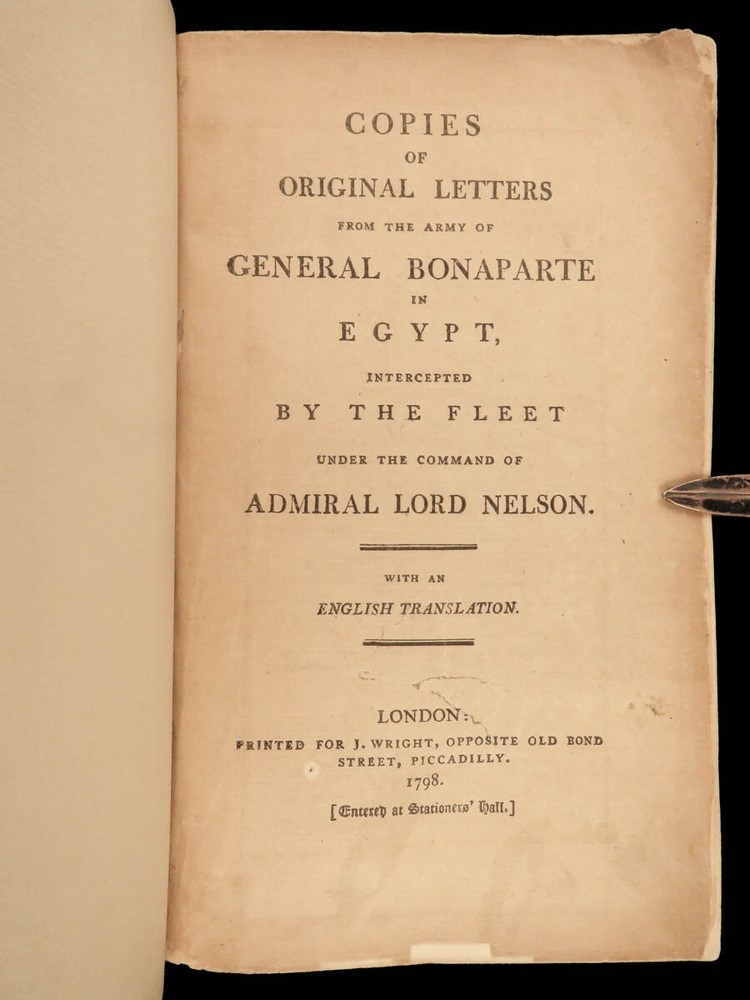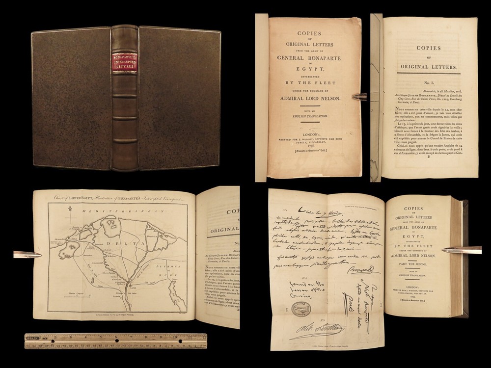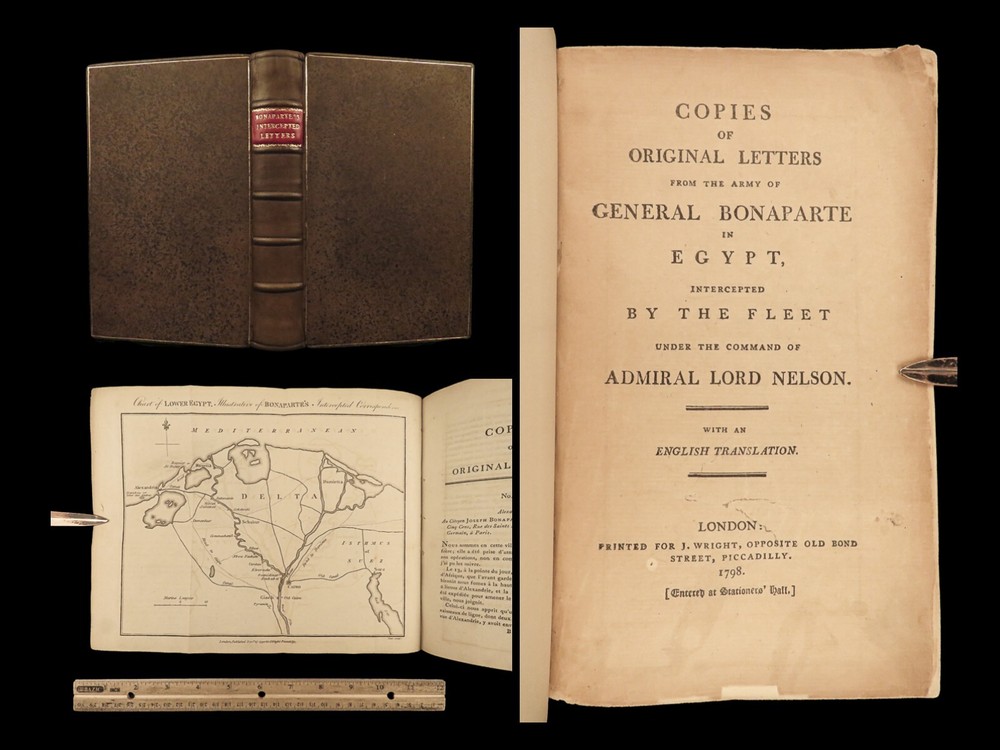 1798 Napoleonic War Letters 1 ed Napoleon Propaganda Admiral Nelson EGYPT Map Early in the Napoleon Wars, the British Navy, led by Lord Horatio Nelson, intercepted French intelligence and seized numerous letters detailing motives and direction of the French army. These letters were published as a strong piece of anti-French propaganda and served as an affront to the French campaign in Egypt. This two-part first edition was an important piece of Napoleonic War memorabilia and has proved to be a highly desirable work since it was first published. Item number: #24371 Price: $750 various Copies of original letters from the army of General Bonaparte in Egypt intercepted by the fleet under the command of Admiral Lord Nelson London: Printed for J. Wright, 1798. 1 st edition Details : · Collation: Complete with all pages; 2 parts in 1 o Part I – [2], xxiii, [1], 248 o Part II – [4], xxxi, [1], 236 o 2 folding plates · Language: English · Binding: Leather; tight and secure · Size : ~8.25in X 5.5in (21cm x 13.5cm) Our Guarantee: Very Fast. Very Safe. Free Shipping Worldwide. Customer satisfaction is our priority! Notify us with 7 days of receiving, and we will offer a full refund without reservation! 24371
