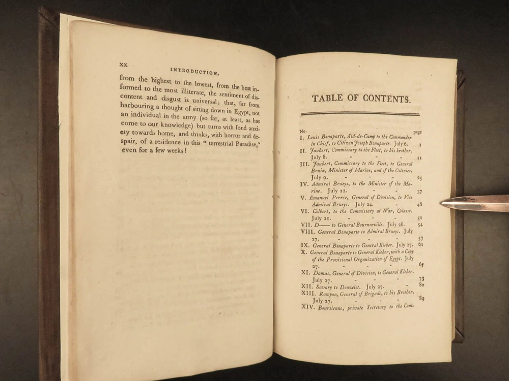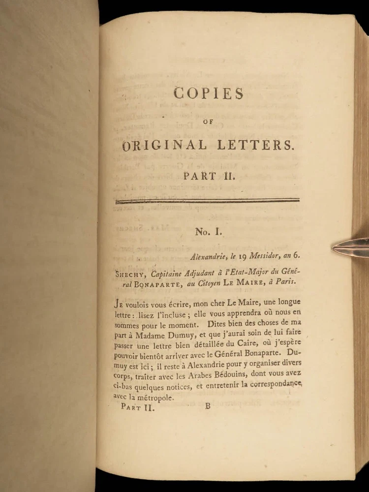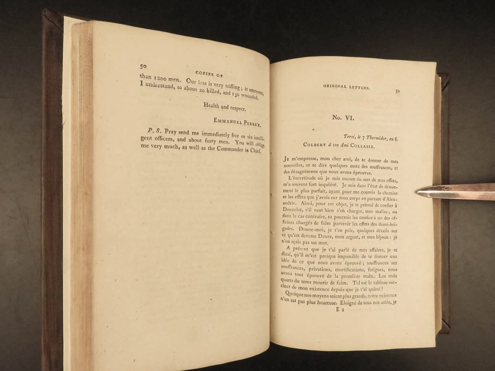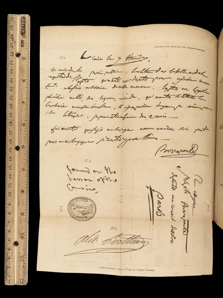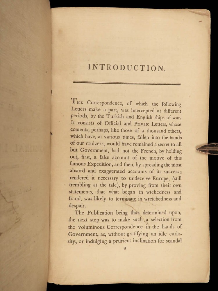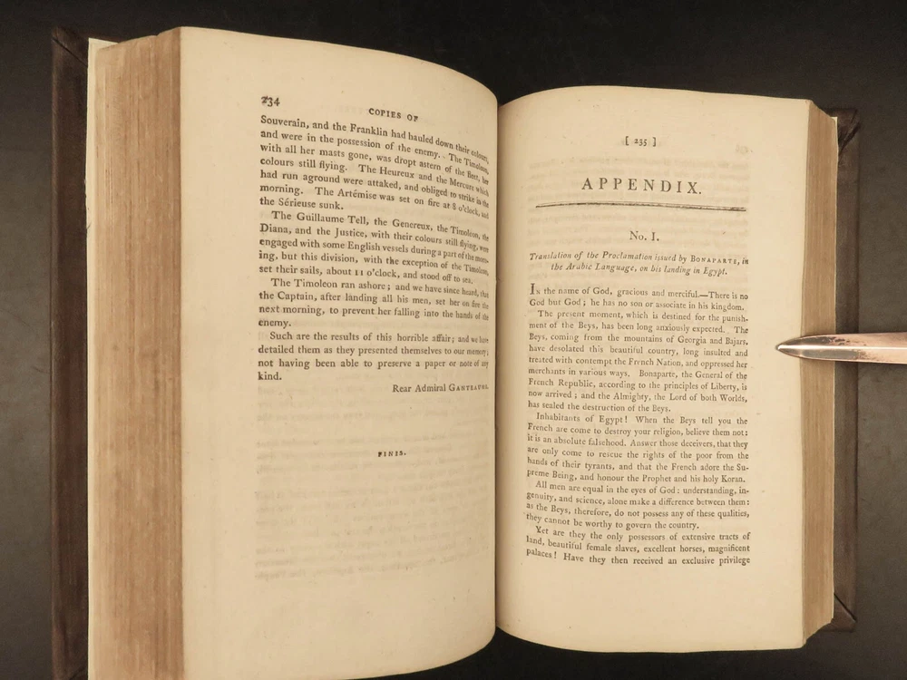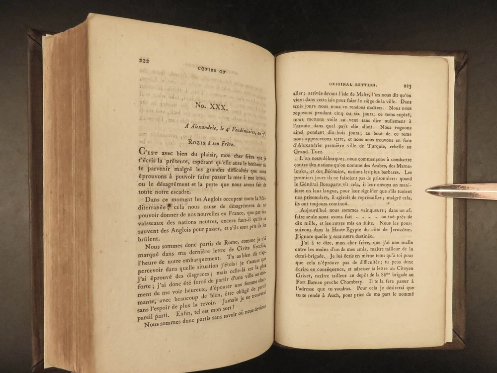 1798 Napoleonic War Letters 1 ed Napoleon Propaganda Admiral Nelson EGYPT Map Early in the Napoleon Wars, the British Navy, led by Lord Horatio Nelson, intercepted French intelligence and seized numerous letters detailing motives and direction of the French army. These letters were published as a strong piece of anti-French propaganda and served as an affront to the French campaign in Egypt. This two-part first edition was an important piece of Napoleonic War memorabilia and has proved to be a highly desirable work since it was first published. Item number: #24371 Price: $750 various Copies of original letters from the army of General Bonaparte in Egypt intercepted by the fleet under the command of Admiral Lord Nelson London: Printed for J. Wright, 1798. 1 st edition Details : · Collation: Complete with all pages; 2 parts in 1 o Part I – [2], xxiii, [1], 248 o Part II – [4], xxxi, [1], 236 o 2 folding plates · Language: English · Binding: Leather; tight and secure · Size : ~8.25in X 5.5in (21cm x 13.5cm) Our Guarantee: Very Fast. Very Safe. Free Shipping Worldwide. Customer satisfaction is our priority! Notify us with 7 days of receiving, and we will offer a full refund without reservation! 24371
