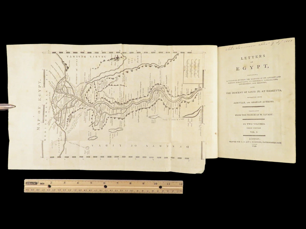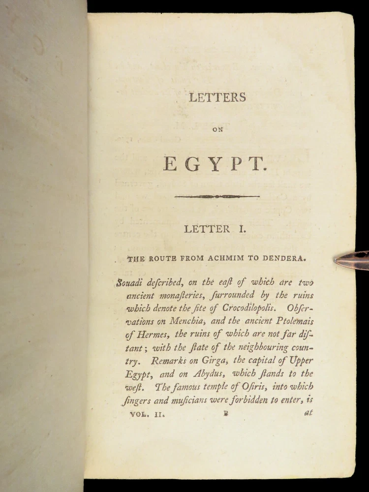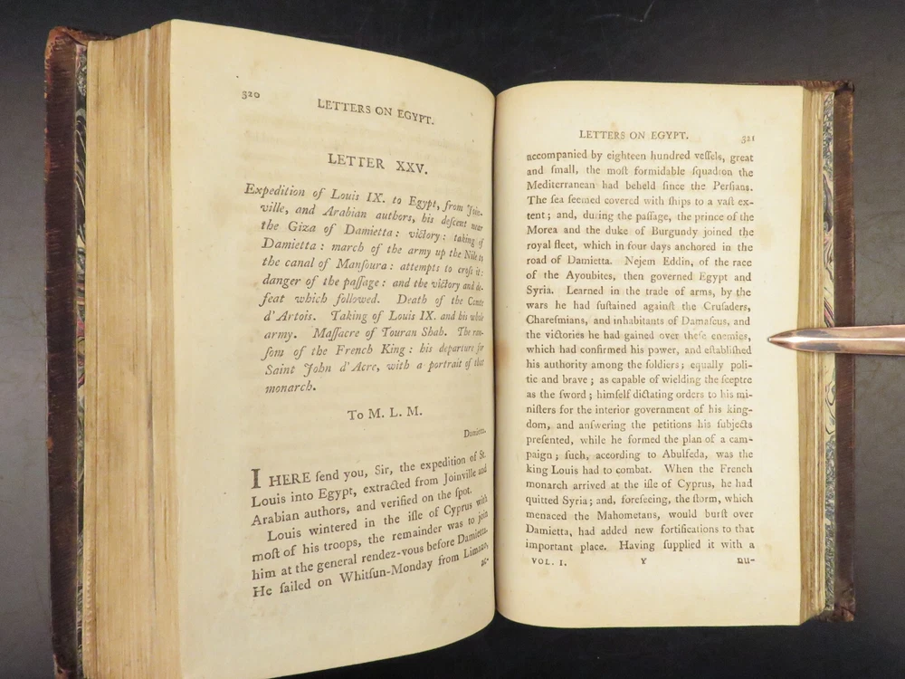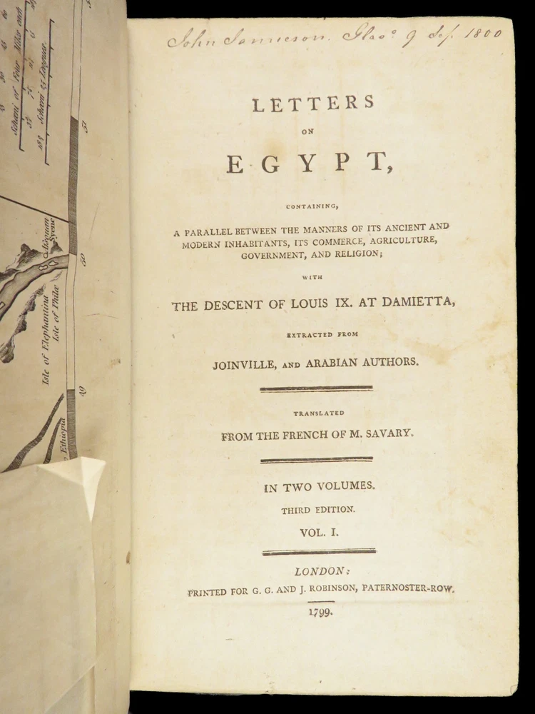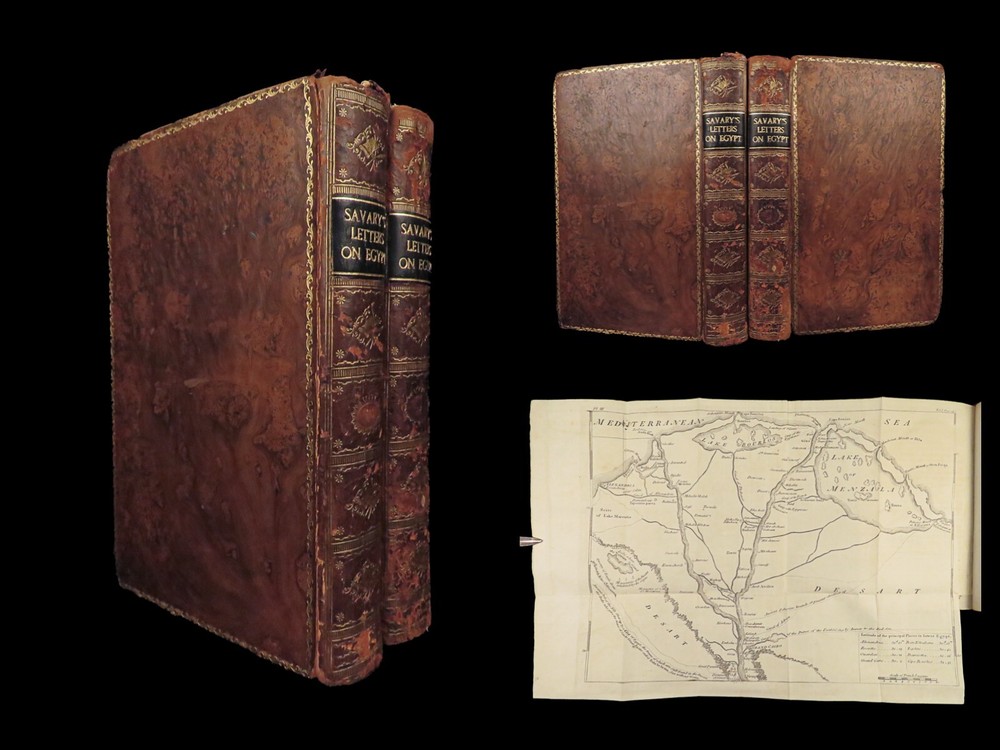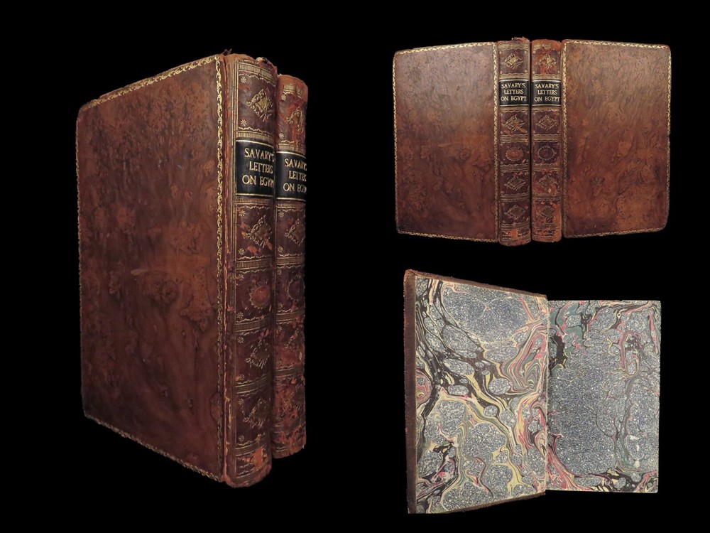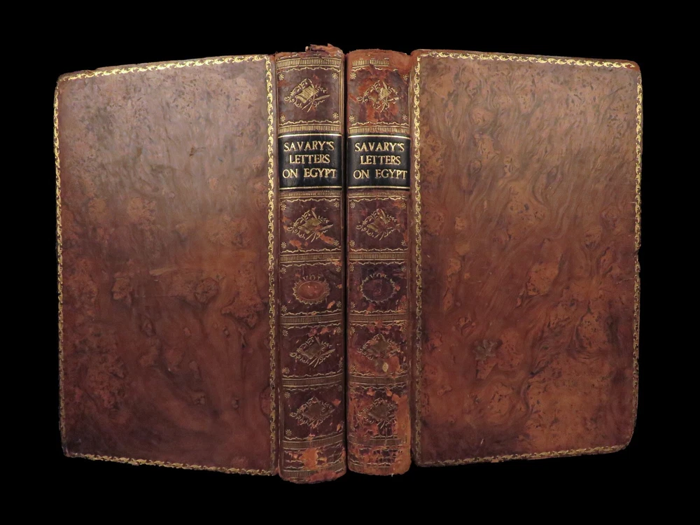 1799 EGYPT Savary Letters Pagan MAPS Mythology Illustrated Egyptian Arabs 2v Claude Savary was an 18 th -century French orientalist and a leading provider of Egyptology, though today he is most-known for his translation of the Qu’ran. In addition to the Qu’ran itself, he translated the writings of Mahomet and the maxims within the Qu’ran, adding his own commentary and notes. Savary also wrote a large collection of letters while he was traveling in Egypt. ‘ Lettres sur l’Egypte’ gives an account of his journey and the last devoted solely to the study of Egyptian religion, mythology, and paganism based on Arabic texts. Each of the letters, which are addressed to his friend Lemonnier, were extremely popular and were met with high praise and acclaim by periodicals and critics. This 1799 English edition includes numerous folding engravings! Item number: #27184 Price: $599 SAVARY, Claude Letters of Egypt London: G.G.J. and J. Robinson, 1799. Details : · Collation: Complete with all pages o Vol. 1 – xv, [1], 440 o Vol. 2 – [4], 460, [14] o 4 folding engravings incl. 3 maps · References: OCLC 11848904 · Provenance: Handwritten o John Jamieson, 1800 § Possibly John Jamieson (1759–1838), a Scottish minister of religion, lexicographer, philologist, and antiquary. His most important work is the Etymological Dictionary of the Scottish Language, which is largely credited with preventing the decline or extinction of the language. The union of the Burgher and Anti-Burgher "New Licht" churches to form the United Secession Church in 1820 was largely due to his exertions. Jamieson was elected a Fellow of the Royal Society of Edinburgh in 1803, and a member of the American Antiquarian Society in 1816. He was also a friend of Scottish poet Sir Walter Scott and was elected a member of the Bannatyne Club. o John J. Johnston, 1835 · Language: English · Binding: Leather; tight and secure · Size : ~8.5in X 5.75in (21.5cm x 14cm) Our Guarantee: Very Fast. Very Safe. Free Shipping Worldwide. Customer satisfaction is our priority! Notify us with 7 days of receiving, and we will offer a full refund without reservation!