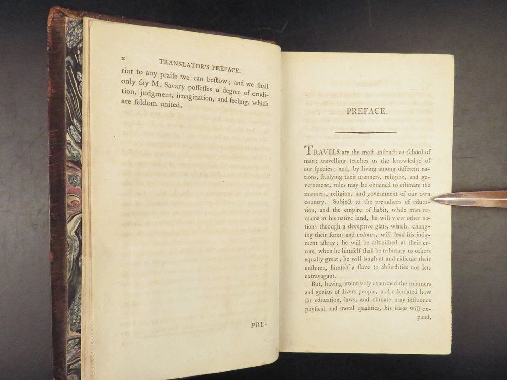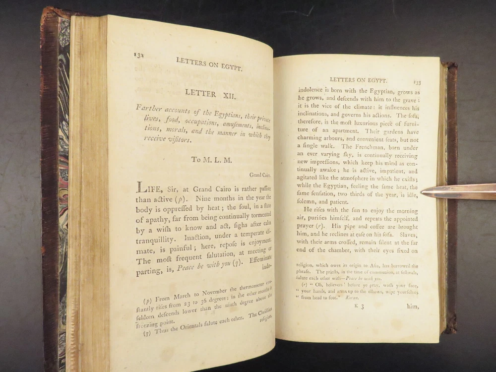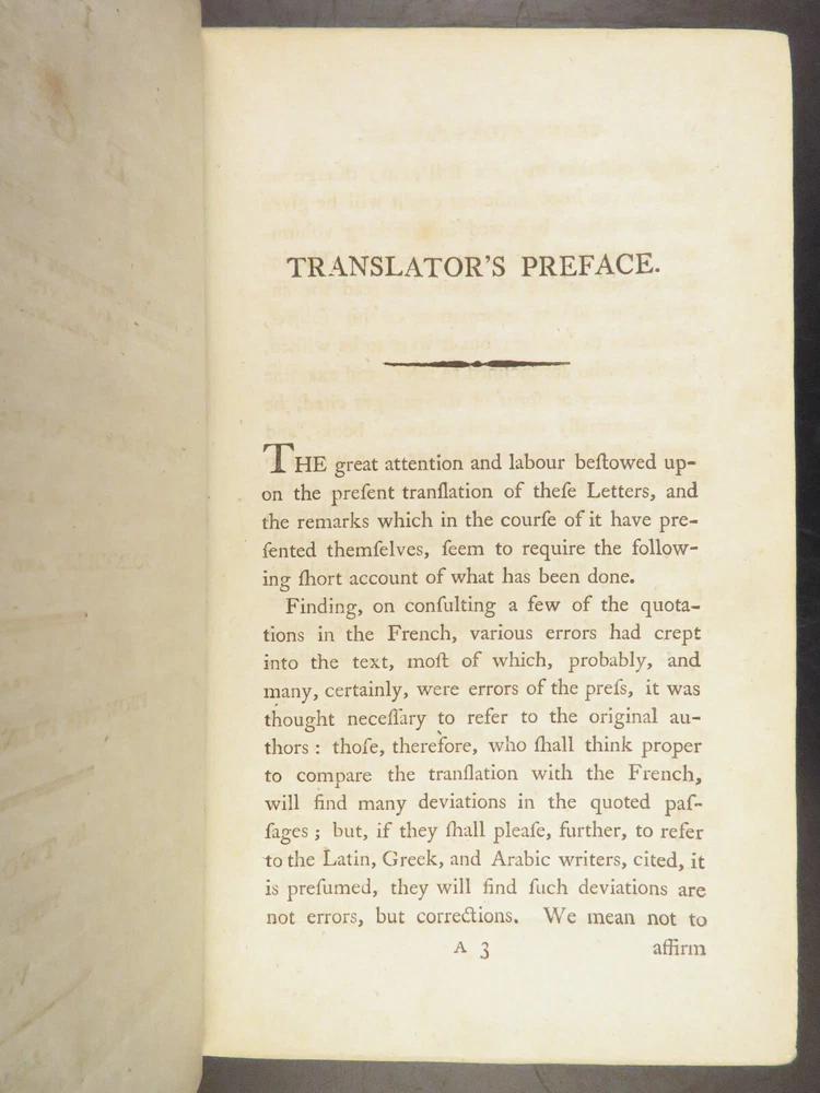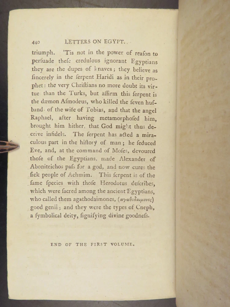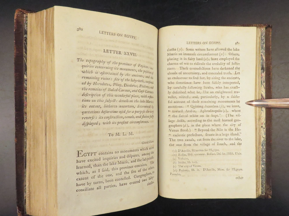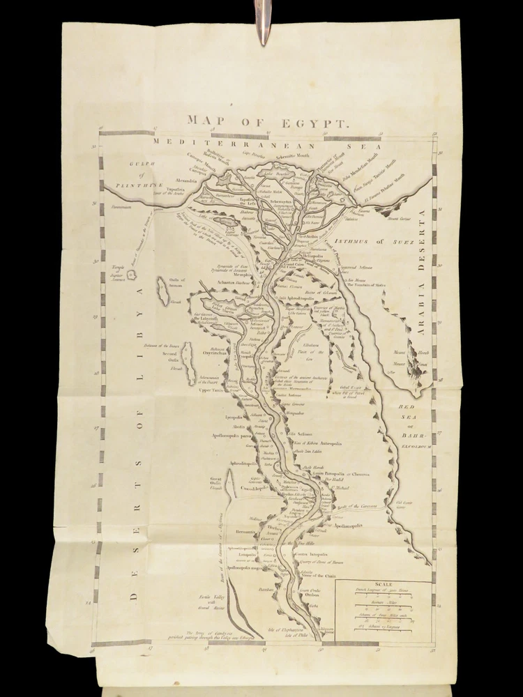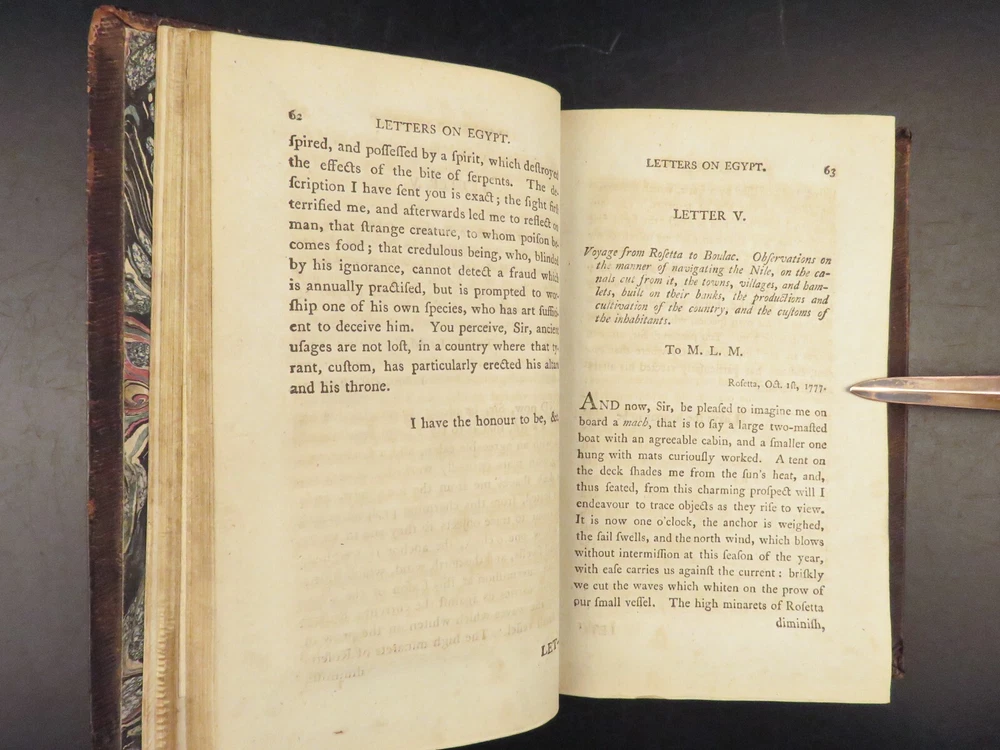 1799 EGYPT Savary Letters Pagan MAPS Mythology Illustrated Egyptian Arabs 2v Claude Savary was an 18 th -century French orientalist and a leading provider of Egyptology, though today he is most-known for his translation of the Qu’ran. In addition to the Qu’ran itself, he translated the writings of Mahomet and the maxims within the Qu’ran, adding his own commentary and notes. Savary also wrote a large collection of letters while he was traveling in Egypt. ‘ Lettres sur l’Egypte’ gives an account of his journey and the last devoted solely to the study of Egyptian religion, mythology, and paganism based on Arabic texts. Each of the letters, which are addressed to his friend Lemonnier, were extremely popular and were met with high praise and acclaim by periodicals and critics. This 1799 English edition includes numerous folding engravings! Item number: #27184 Price: $599 SAVARY, Claude Letters of Egypt London: G.G.J. and J. Robinson, 1799. Details : · Collation: Complete with all pages o Vol. 1 – xv, [1], 440 o Vol. 2 – [4], 460, [14] o 4 folding engravings incl. 3 maps · References: OCLC 11848904 · Provenance: Handwritten o John Jamieson, 1800 § Possibly John Jamieson (1759–1838), a Scottish minister of religion, lexicographer, philologist, and antiquary. His most important work is the Etymological Dictionary of the Scottish Language, which is largely credited with preventing the decline or extinction of the language. The union of the Burgher and Anti-Burgher "New Licht" churches to form the United Secession Church in 1820 was largely due to his exertions. Jamieson was elected a Fellow of the Royal Society of Edinburgh in 1803, and a member of the American Antiquarian Society in 1816. He was also a friend of Scottish poet Sir Walter Scott and was elected a member of the Bannatyne Club. o John J. Johnston, 1835 · Language: English · Binding: Leather; tight and secure · Size : ~8.5in X 5.75in (21.5cm x 14cm) Our Guarantee: Very Fast. Very Safe. Free Shipping Worldwide. Customer satisfaction is our priority! Notify us with 7 days of receiving, and we will offer a full refund without reservation!
