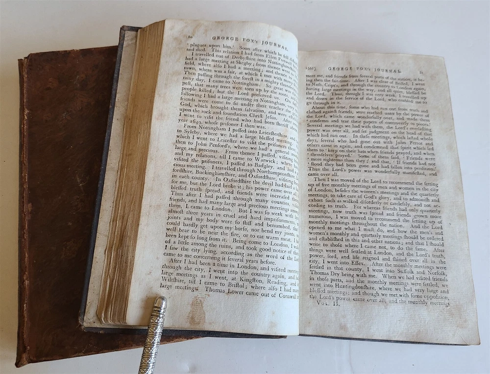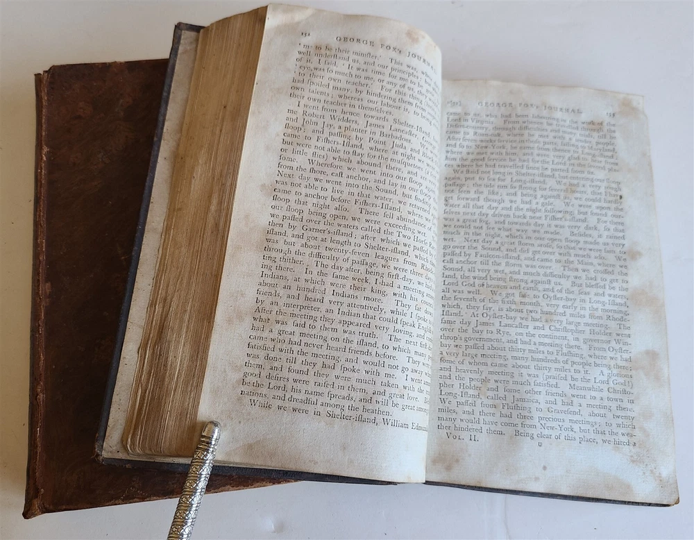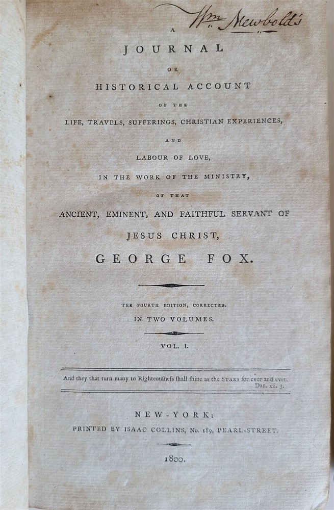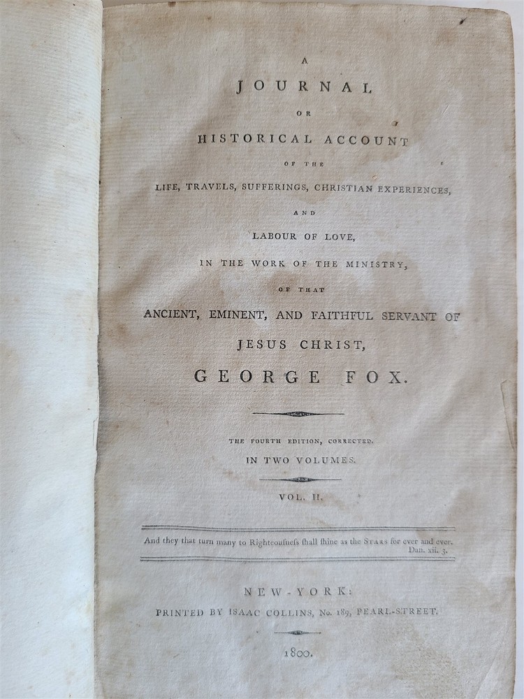 A Journal or Historical Account of the Life, Travels, Sufferings, Christian Experiences, and Labour of Love in the Work of the Ministry, of That Ancient, Eminent, and Faithful Servant of Jesus Christ, George Fox. by Fox, George (preface by William Penn) 2 volumes , complete set. New York, 1800 Size 5 3/4 by 9" Original calf. Front cover of Vol. I a bit shaking. Some toning, foxing. Good Condition. Text in English =============================================== Please see my other auctions Thank You Refund Policy: We will issue a FULL REFUND, 100% money back if you are not satisfied with your purchase. Items must be returned to us within 20 days in order to receive a refund or replacement. Buyer is responsible for shipping costs. Powered by SixBit's eCommerce Solution