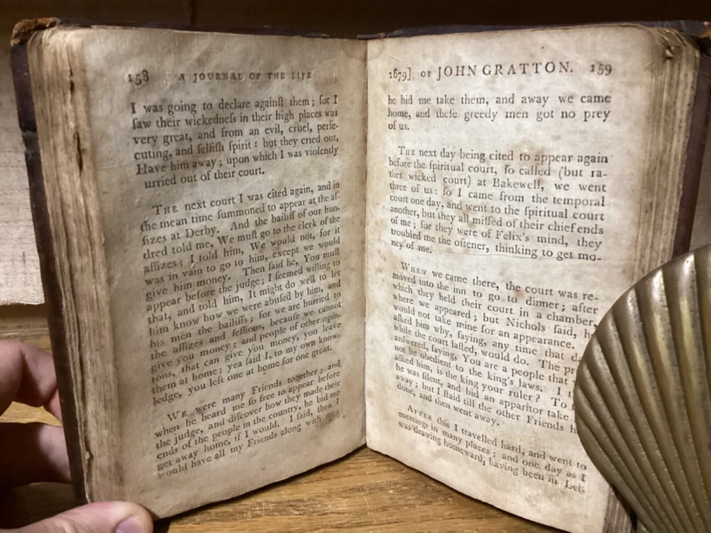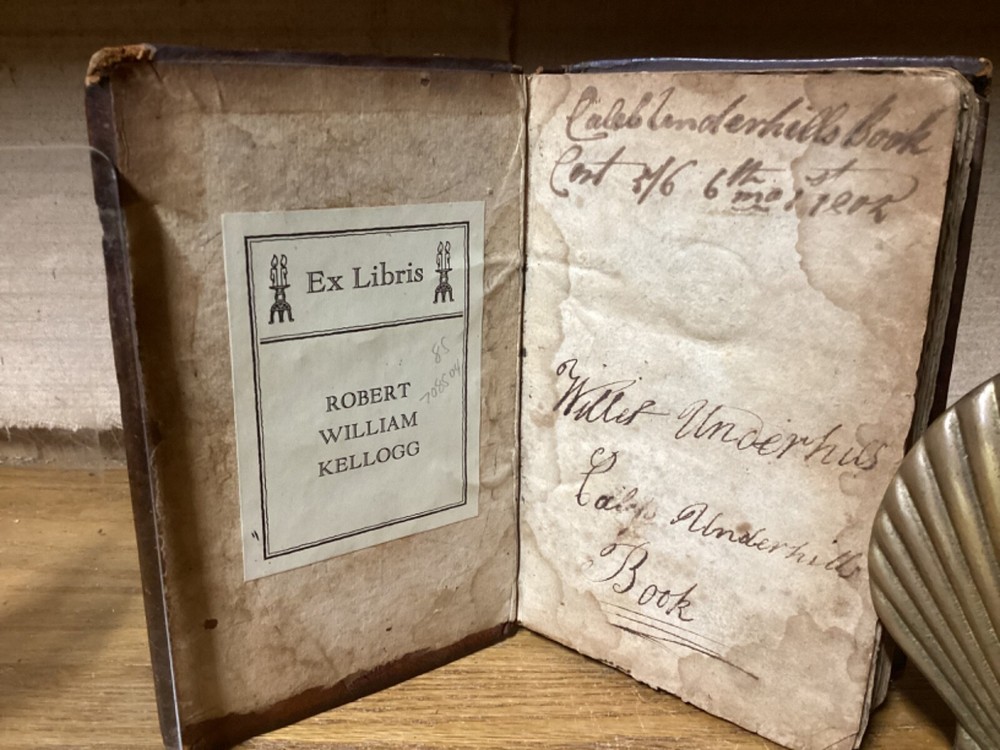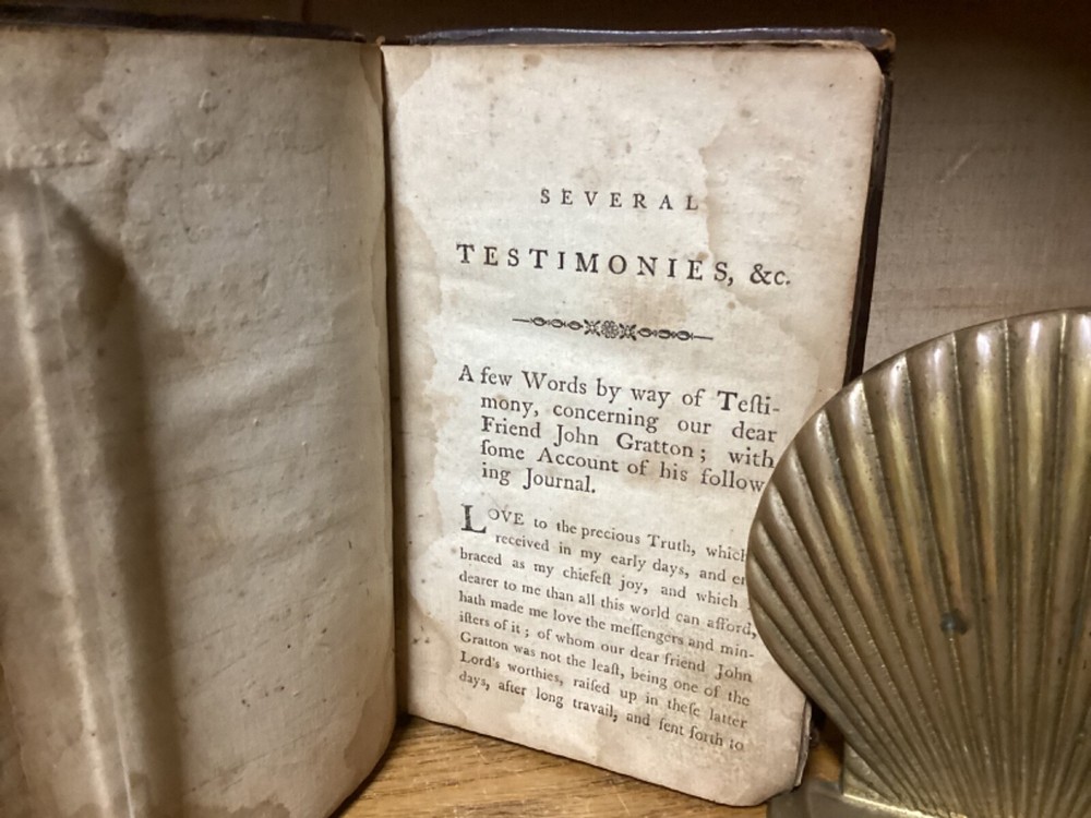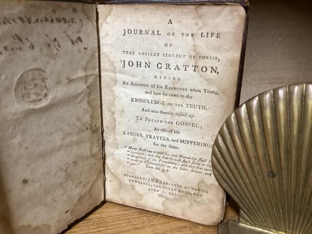 A Journal of the Life of that Ancient Servant of Christ, John Gratton, Giving an Account of His Exercises when Young, and how He Came to the Knowledge of the Truth, and was Thereby Raised up the Preach the Gospel, and also of his Labors, Travels, and Sufferings for the Same. Printed in Stanford, New York by Daniel Lawrence. 1805. 224 pp. 6.75” x 4.25”. 8vo. Hardcover contemporary full leather. In fair condition, with scuffing and wear to boards and spine. Some chipping and losses to leather on spine, along with title label. Cracking to hinges at front and rear. Text block remains bound well with light wear. Staining remnants throughout text block. Ex-libris bookplate to front pastedown, along with early 19th Century inscriptions from the Underhill family at front. General age-related toning to pages, along with periodic foxing and wear. Please see photographs and ask any questions prior to purchasing. A scarce piece on the life, travels, and beliefs of John Gratton (1641-1711), an early Quaker preacher described in a letter by William Penn as “one of my dear and choice friends.” Pencil drawing of flowers to rear end page. An extremely rare imprint from Stanford, Dutchess County, New York. COLR1805ABDX