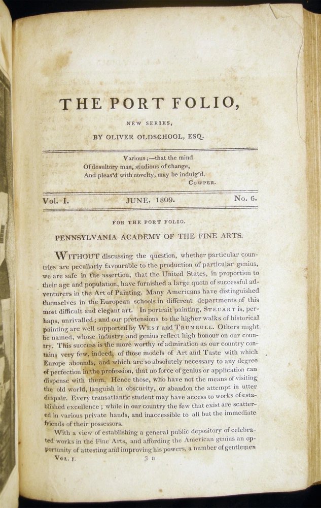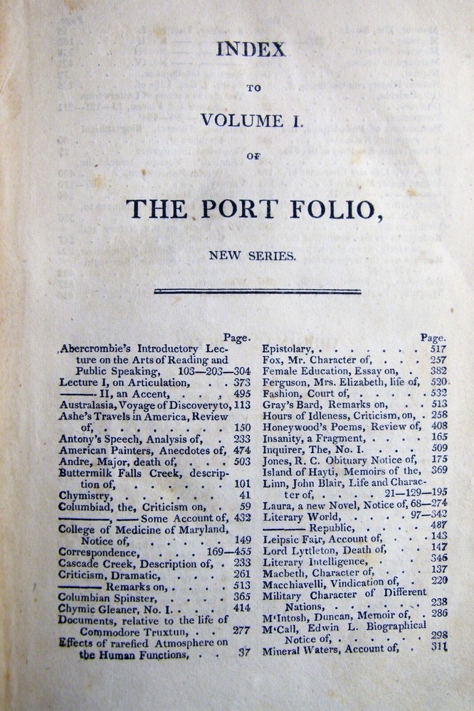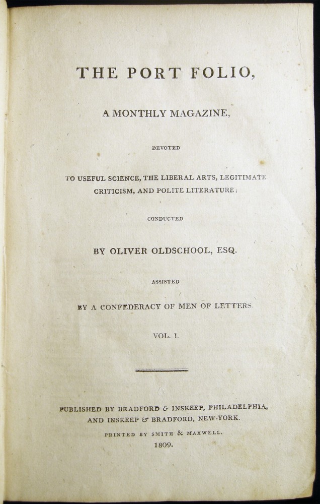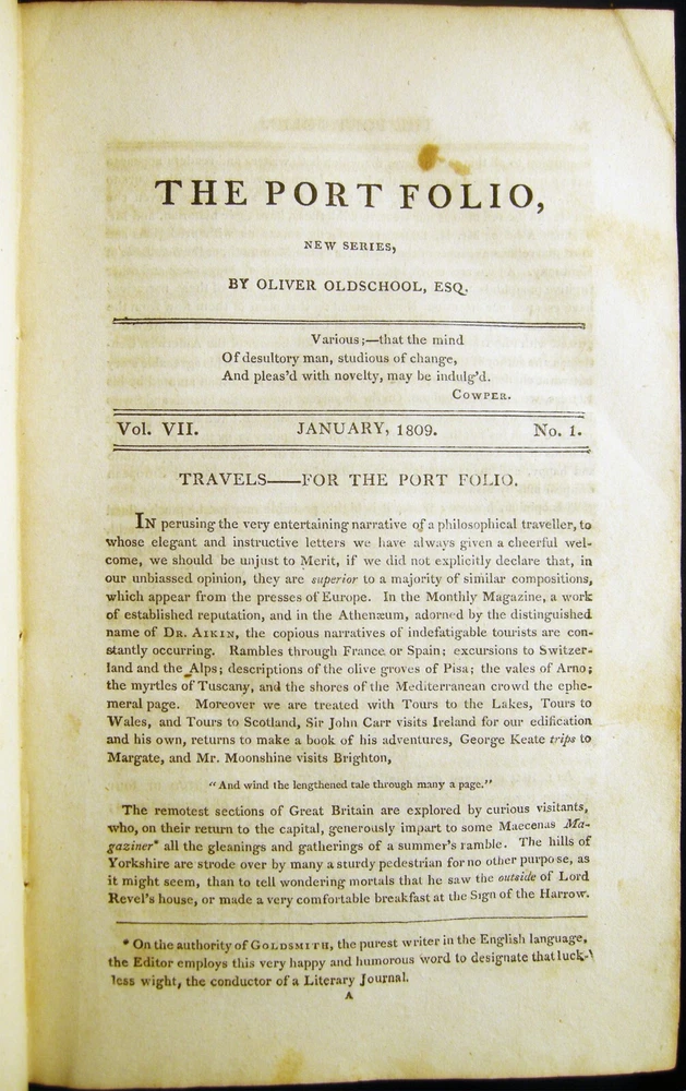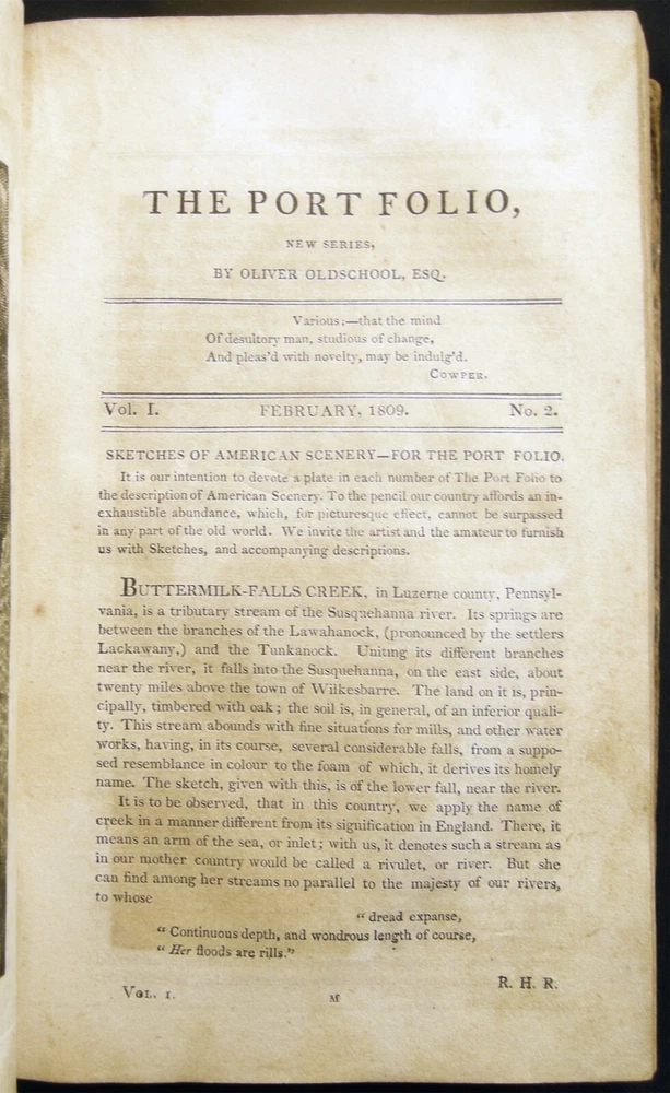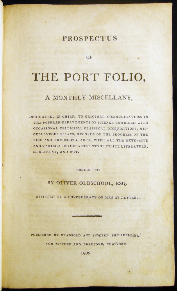 [029202] (Americana – 19 th century - Literary History - Periodical - The Port Folio). The Port Folio, A Monthly Magazine, Devoted to Useful Science, the Liberal Arts, Legitimate Criticism, and Polite Literature; Conducted By Oliver Oldschool, Esq. Assisted By a Confederacy of Men of Letters. Philadelphia, Pennsylvania: Bradford & Inskeep, 1809. First Edition 552 + 88 pages; with useful index at front. This monthly periodical was considered the foremost American literary publication of its kind, with reviews, poetry, essays on various topics, world and domestic news, travel, scientific discoveries and speculations, law & politics, biographies and obituaries. In 1809, it was under the editorship of Joseph Dennie (1768 – 1812) An essayist & critic: “…Despite his serious doubts about the fate of the country, Dennie began in 1801 the work that would make him famous in his time. In January of that year he published the inaugural issue of Port Folio , which became under his guidance the most influential and longest-lasting literary journal of its time. Styling himself Oliver Oldschool, Esq., Dennie used the magazine to praise Goldsmith-like “simplicity” in style and to express contempt for the language of common people and their leader Jefferson… Although deliberately out of step with his times, Dennie nonetheless stayed in print by cultivating a theory of taste that appealed to a continuing Anglophilia among the literary elite…” (Jeffrey H. Richards in the ANB) Bound volume includes the Prospectus & issues for Vol. I of the “New Series” ie., Vol. VII January, 1809 No. 1, February, March, April (misbound after) May, June and Vol. II July, 1809 No. 1 July. Embellished with various engravings, including a frontispiece of the Port Folio open on the globe of the Earth; Buttermilk Falls by G. Murray; a portrait of William Penn by Edwin; Mr. Brides Machine for gunning, carding & Spinning Cotton at one operation by B. Tanner after J. Cist; View of the Botanic Garden at Elgin, in the vicinity of the City of New York by Leney after Simond; a portrait of Gen. Anthony Wayne by Edwin; a profile likeness (silhouette) of Duncan McIntosh; the Pennsylvania Academy of the Fine Arts, B. Tanner after J.J. Barralet; two ‘fashion plates,’ Evening Dresses in Jan’y 1809 and Full Dress; and a plate of the Egypto-classical Monument to Sir Ralph Abercrombie erected in St. Pauls Cathedral, by B. Tanner after Westmacott (Half of the plate gone). Articles include a review of Freycinet “A Voyage of Discovery…”; notice of the College of Medicine of Maryland; Vindication of Machiavelli; an Account of Mineral Waters; Memoirs of Hayti; Essay on the Nature and Use of Wine; ‘Sporting Intelligence’ and Travels in a series of Letters from Geneva and France. Poetry on the eruption of Mt. Etna, Ode on Spring, On singing the pathetic Ballad of Mozart’s “Vergiss me Micht”; Verses written on beholding the miniature of Miss Mary C-, a lady whom the writer has never seen. Printed by Smith & Maxwell. Approx. 5 1/2" x 8 3/4" size; bound in paper covered boards, leather spine, gilt spine titles and simple line-rules. Some edge & tips wear to the binding; some foxing and spotting; in good condition.