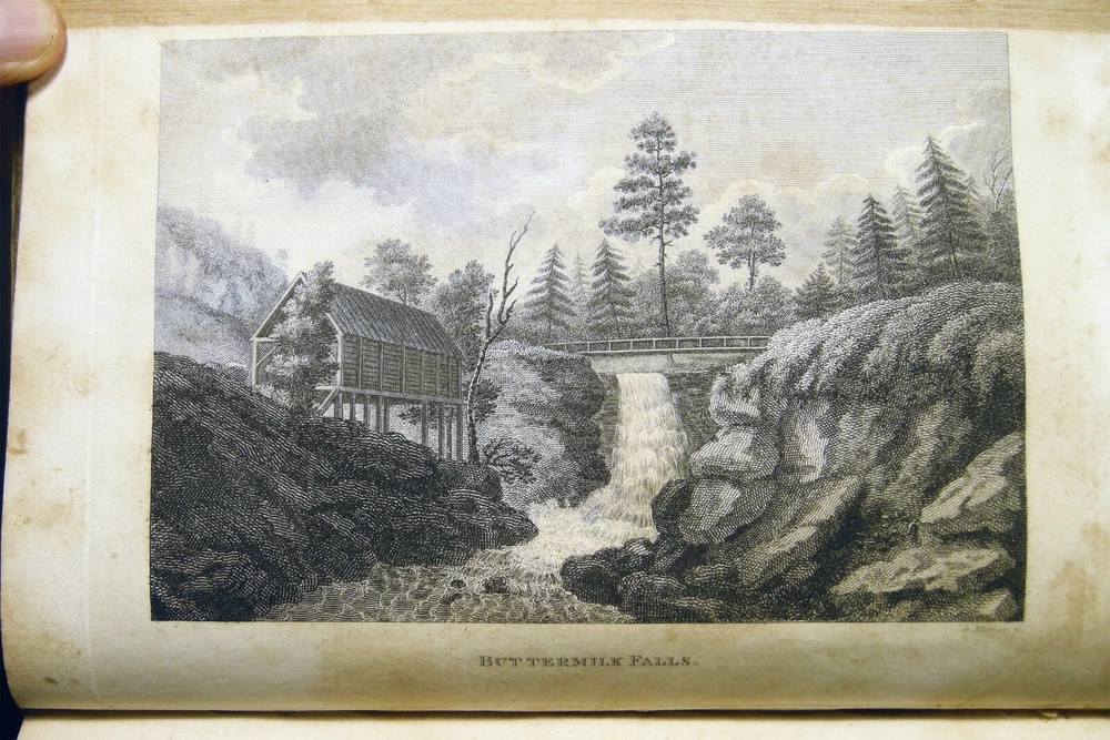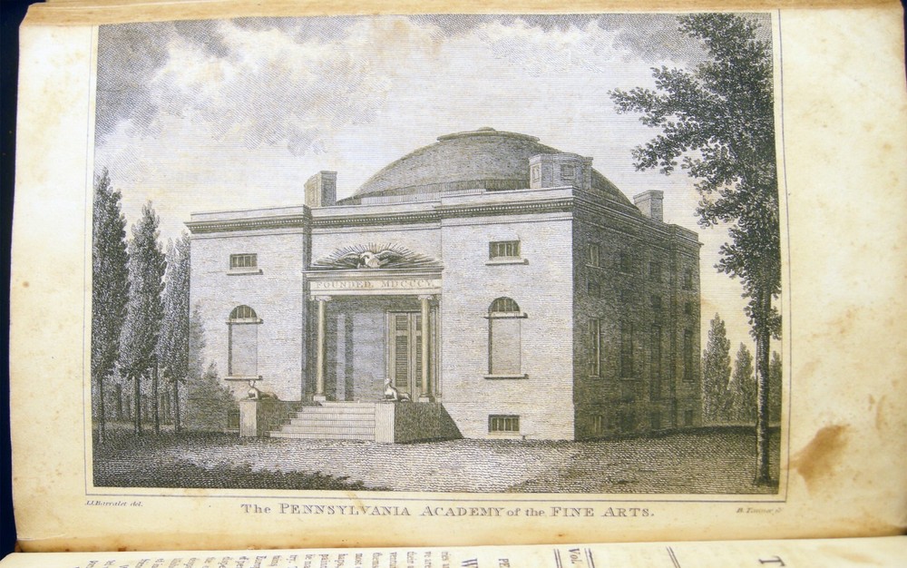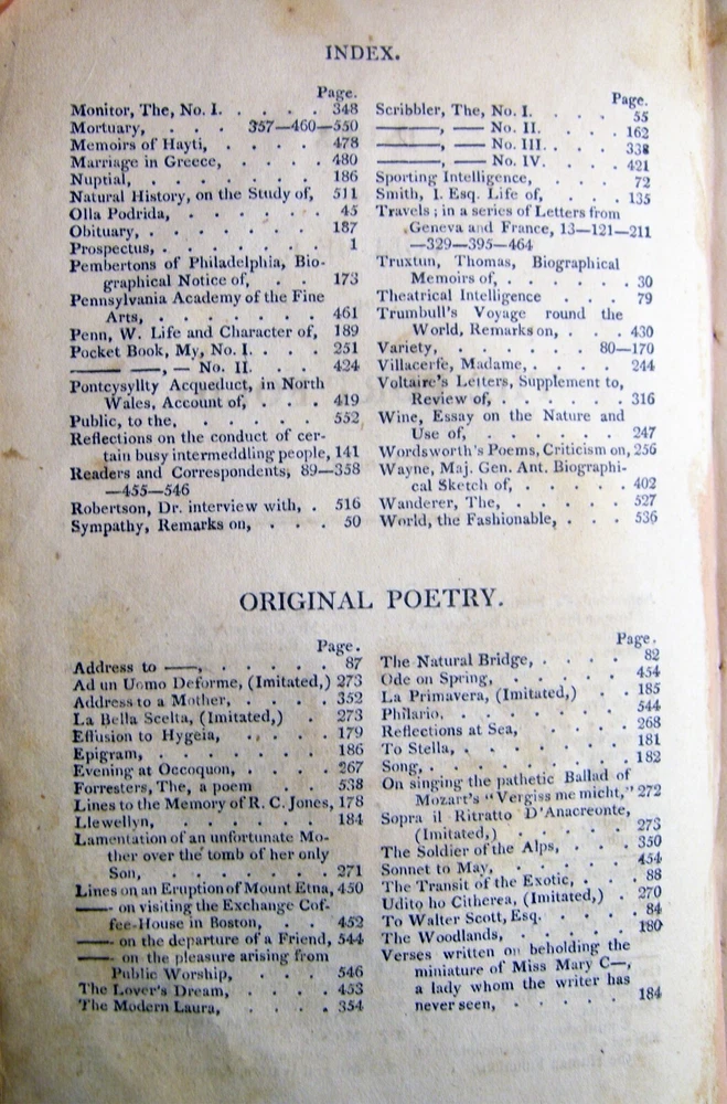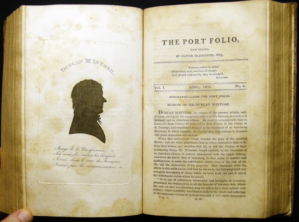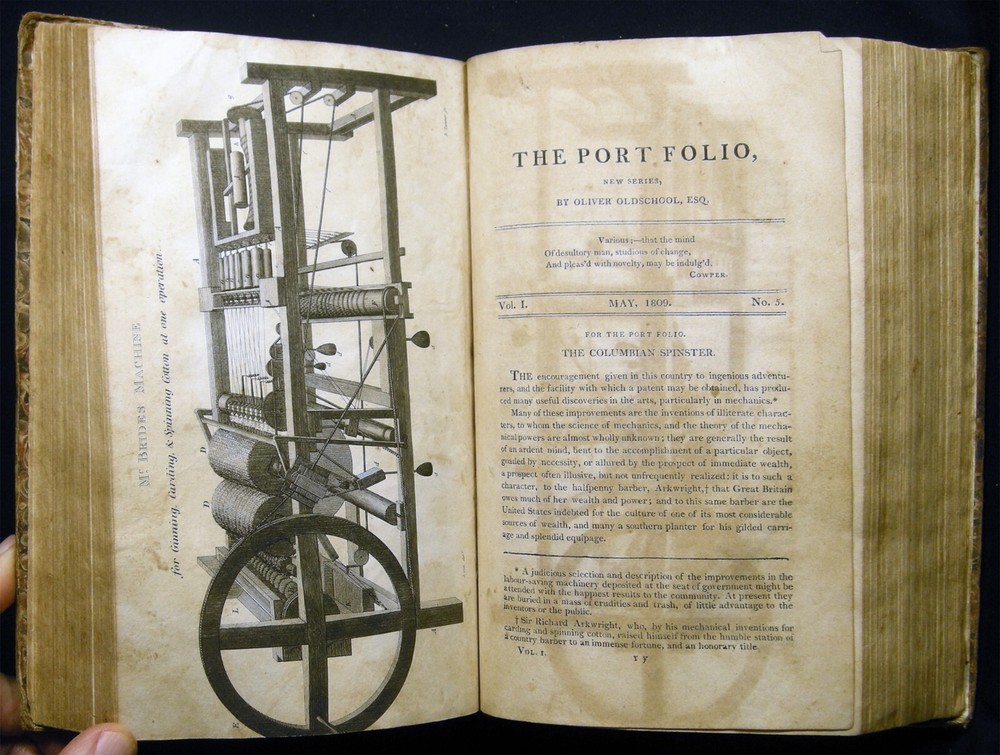 [029202] (Americana – 19 th century - Literary History - Periodical - The Port Folio). The Port Folio, A Monthly Magazine, Devoted to Useful Science, the Liberal Arts, Legitimate Criticism, and Polite Literature; Conducted By Oliver Oldschool, Esq. Assisted By a Confederacy of Men of Letters. Philadelphia, Pennsylvania: Bradford & Inskeep, 1809. First Edition 552 + 88 pages; with useful index at front. This monthly periodical was considered the foremost American literary publication of its kind, with reviews, poetry, essays on various topics, world and domestic news, travel, scientific discoveries and speculations, law & politics, biographies and obituaries. In 1809, it was under the editorship of Joseph Dennie (1768 – 1812) An essayist & critic: “…Despite his serious doubts about the fate of the country, Dennie began in 1801 the work that would make him famous in his time. In January of that year he published the inaugural issue of Port Folio , which became under his guidance the most influential and longest-lasting literary journal of its time. Styling himself Oliver Oldschool, Esq., Dennie used the magazine to praise Goldsmith-like “simplicity” in style and to express contempt for the language of common people and their leader Jefferson… Although deliberately out of step with his times, Dennie nonetheless stayed in print by cultivating a theory of taste that appealed to a continuing Anglophilia among the literary elite…” (Jeffrey H. Richards in the ANB) Bound volume includes the Prospectus & issues for Vol. I of the “New Series” ie., Vol. VII January, 1809 No. 1, February, March, April (misbound after) May, June and Vol. II July, 1809 No. 1 July. Embellished with various engravings, including a frontispiece of the Port Folio open on the globe of the Earth; Buttermilk Falls by G. Murray; a portrait of William Penn by Edwin; Mr. Brides Machine for gunning, carding & Spinning Cotton at one operation by B. Tanner after J. Cist; View of the Botanic Garden at Elgin, in the vicinity of the City of New York by Leney after Simond; a portrait of Gen. Anthony Wayne by Edwin; a profile likeness (silhouette) of Duncan McIntosh; the Pennsylvania Academy of the Fine Arts, B. Tanner after J.J. Barralet; two ‘fashion plates,’ Evening Dresses in Jan’y 1809 and Full Dress; and a plate of the Egypto-classical Monument to Sir Ralph Abercrombie erected in St. Pauls Cathedral, by B. Tanner after Westmacott (Half of the plate gone). Articles include a review of Freycinet “A Voyage of Discovery…”; notice of the College of Medicine of Maryland; Vindication of Machiavelli; an Account of Mineral Waters; Memoirs of Hayti; Essay on the Nature and Use of Wine; ‘Sporting Intelligence’ and Travels in a series of Letters from Geneva and France. Poetry on the eruption of Mt. Etna, Ode on Spring, On singing the pathetic Ballad of Mozart’s “Vergiss me Micht”; Verses written on beholding the miniature of Miss Mary C-, a lady whom the writer has never seen. Printed by Smith & Maxwell. Approx. 5 1/2" x 8 3/4" size; bound in paper covered boards, leather spine, gilt spine titles and simple line-rules. Some edge & tips wear to the binding; some foxing and spotting; in good condition.