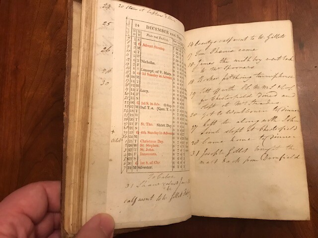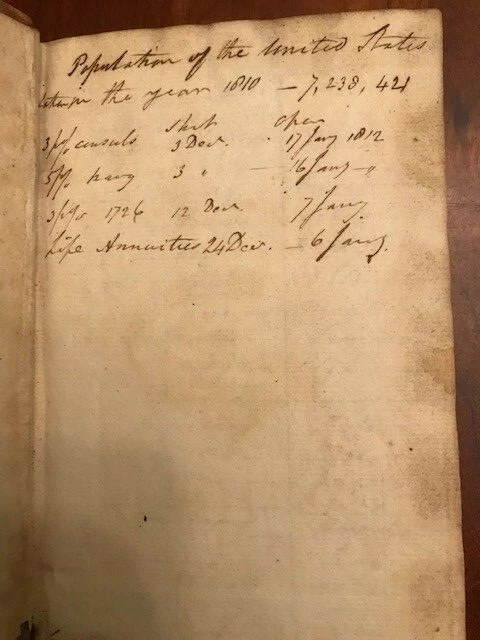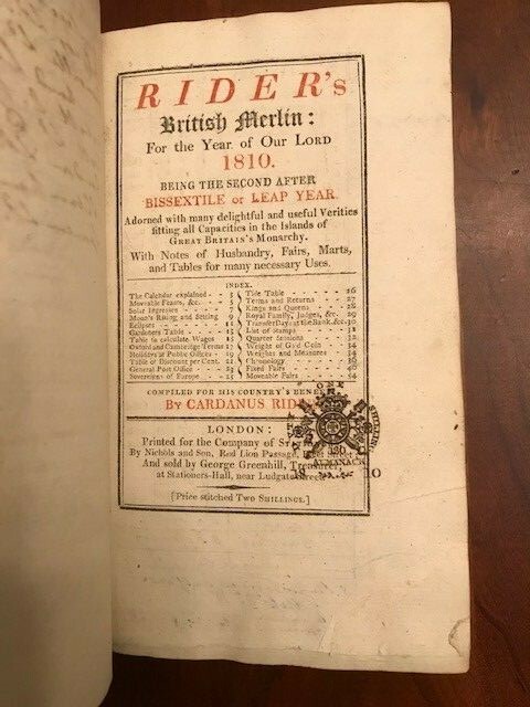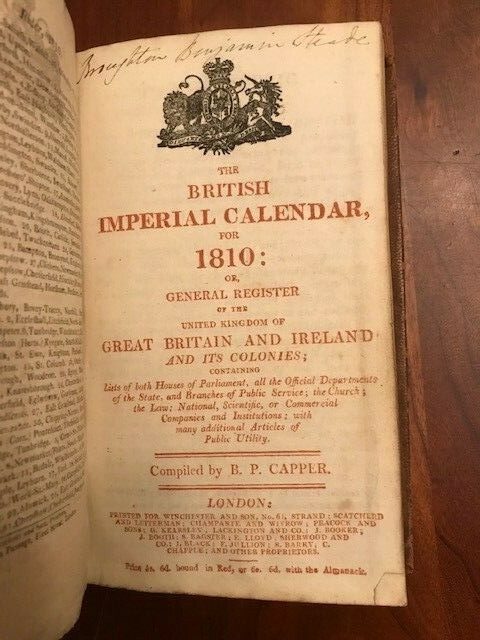 1810 Antique DIARY Farming JOURNAL Estate CALENDAR Beauchief Hall ENGLAND UK Published by B.P Capper, 1810. The British Imperial Calendar for 1810: or the General Register of the United Kingdom of Great Britain and Ireland and Its Colonies; Containing Lists of Both Houses of Parliament; all the Official Departments, of the State and Branches of Public Service; the Church, the Law, National, Scientific, or Commercial Companies and Institutions; with Many Additional Articles of Public Utility. Compiled by B.P. Capper - LONDON: 1810 The diary is a farming diary written on the estate of Beauchief Hall (pronounced Bee-chiff) in 1810. The estate descended, through marriage, to Edward Pegge who built a new mansion in 1671 on a site to the south-west of the abbey described as `a gentle descent on the brow of the hanging wood, the bellum caput or Beau Chef (ibid). This site is also thought to be the site of the Grange where the monks formerly made their butter and cheese (Tilley 1899). Stone from the abbey, by then ruinous, was used for the new mansion and Pegge, at about the same time, restored a part of the abbey chapel for use as a church (Glover 1833). After the death of Edward Pegge in 1679 the estate remained in the ownership of the family, by direct descent, until the death of Edward's great-grandson Peter in 1836. Excerpts: March 1, 1810 Plowing with the new illegible in the paddock March 3 - Day fixed for Bradfield Consent to be signed March 4 - First lambs, 2 born March 5 - Burchill very ill March 7 - Very winterly, one lamb died March 10 - went to Windbourne May 8 - Turned the ground some more, put the sheep behind the house June 12 - at the Newark Fair June 13 - turned the milking cows to the great paddock June 19 - at the Sheffield Fair, dined with my Aunt July 1 - very severe thunderstorm; the outer cliff chapel has been damaged July 9 - Income tax paid July 15 - Gillet had six lambs Aug 4 - Poor Stanley found dead this morning; Aunt and Mary Ann left Beauchief Sept 2 - began the harvest of the barley Sept 13 - did the last of the barley and sheared the sheep Sept 17 - killed a lamb Oct 22 - began plowing up behind the abbey for wheat Oct 24 - Harvest supper Nov 2 - Princess Amelia died today Returned home and during my absence, three acres were sown in the upper paddock Dec 14 - Beautys calf went to W. Gillets Dec 18 - James the milk boy went back to Mr. Spooners Dec 20 - Went to Windbourne for dinner CONDITION: This 209-year-old book measures 7x4 and is 404 pages long with about 39 pages written on and used for a diary. The leather is in fairly good condition; there is some chipping to the front cover and bottom of the spine. The binding is still tight with covers intact. Foxing and toning are minimal. I've done my best to describe the book, but if you have additional questions, please don't hesitate to send me an e-mail.