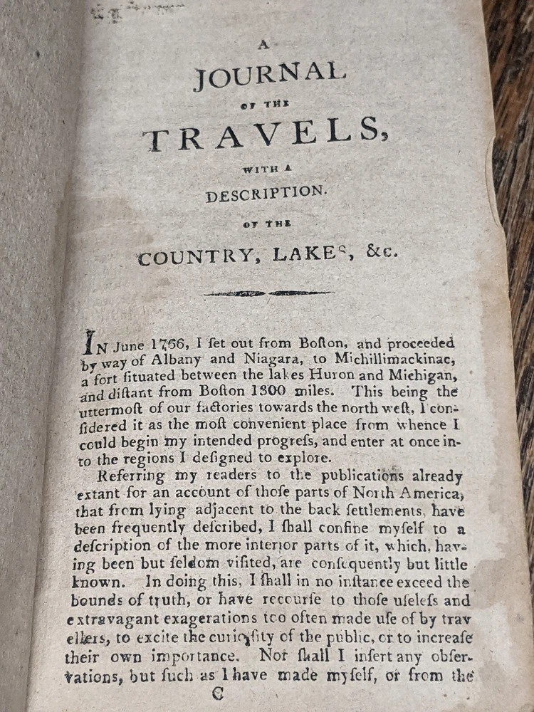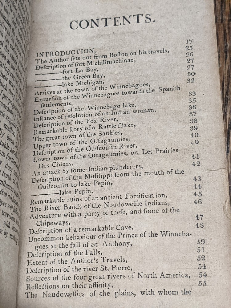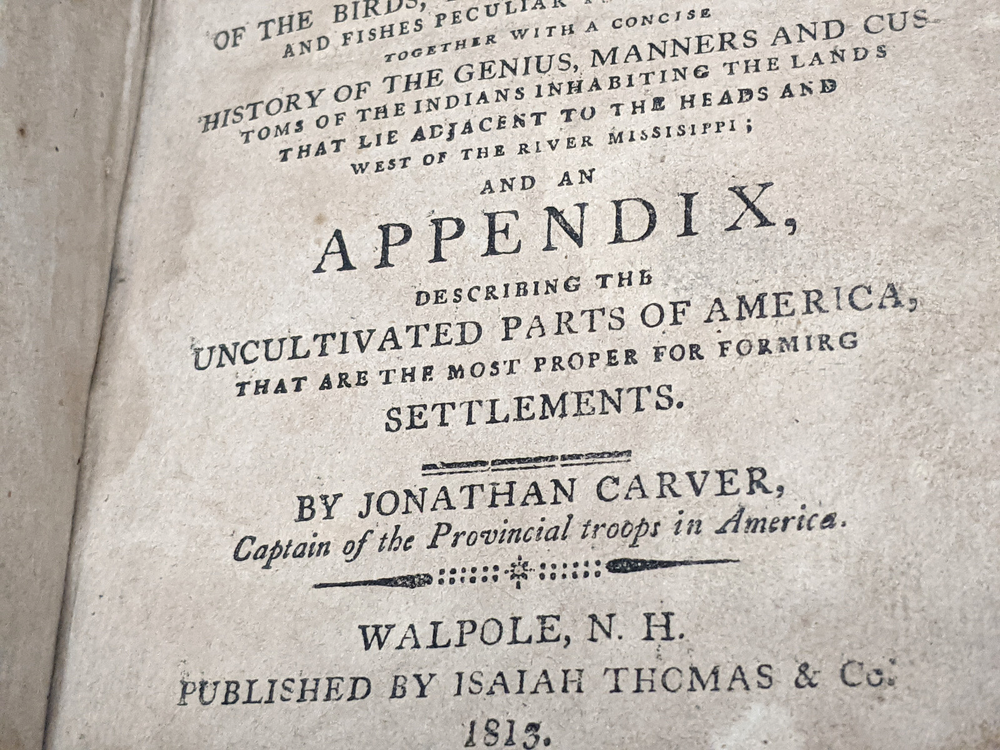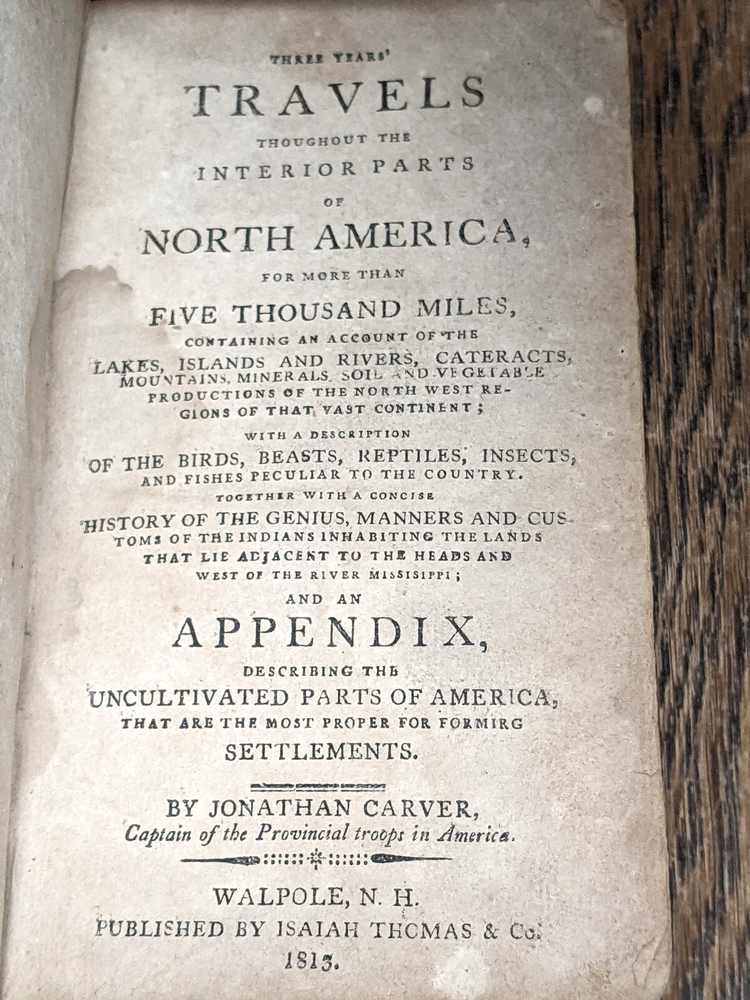 Great antique book "Three Years' Travels Through the Interior Parts of North-America, for More than Five Thousand Miles"; Containing an Account of the Great Lakes, and all the Lakes, Islands, and Rivers, Cataracts, Mountains, Minerals, Soil and Vegetable Productions of the North-West Regions of that Vast Continent; with a Description of the Birds, Beasts, Reptiles, Insects and Fishes Peculiar to the Country. Together with a Concise History of the Genius, Manners, and Customs of the Indians Inhabiting the Lands that Lie Adjacent to the Heads and to the Westward of the Great River Mississippi; and an Appendix, Describing the Uncultivated Parts of America that are the most Proper for Forming Settlements. By Capt. Jonathan Carver, of the Provincial Troops in America. Walpole, N.H. Published by Isaiah Thomas & Co. 1813. Original full leather covered boards. xvi, 280 pp. Measures 6 3/4" x 4 1/4". Rare book. Long out-of-print. Carver penetrated the interior of North America describing insights into the geography, flora, fauna, and Indian customs. He explored the Northwest, Green Bay, Great Lakes, Up the Mississippi River, Northern Minnesota, and back. He traveled for 2 years and 5 months, covering 5,000+ miles. The first part of the book covers his journal and his travels and the second part covers the indigenous people he met, their manners, customs, religion, language, methods of war, hunting, prisoners, etc. Absolutely fabulous accounts. Book is in good condition. Pages display moderate tanning, stain on lower part of about 15 pages. Dark foxing spot on pp. 109-115. Lower corner of pp. 21-22 chipped with loss of a couple words. Otherwise page are generally clean. No musty or loose pages. Chipping on endpaper edges. Corners and spine tips of binding are worn. Rubbing on main boards. Hinges are cracked on inside. Smoke-free home.