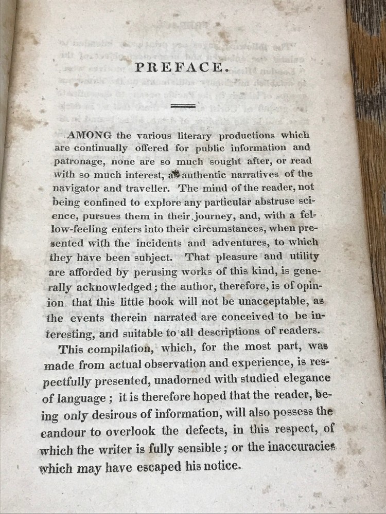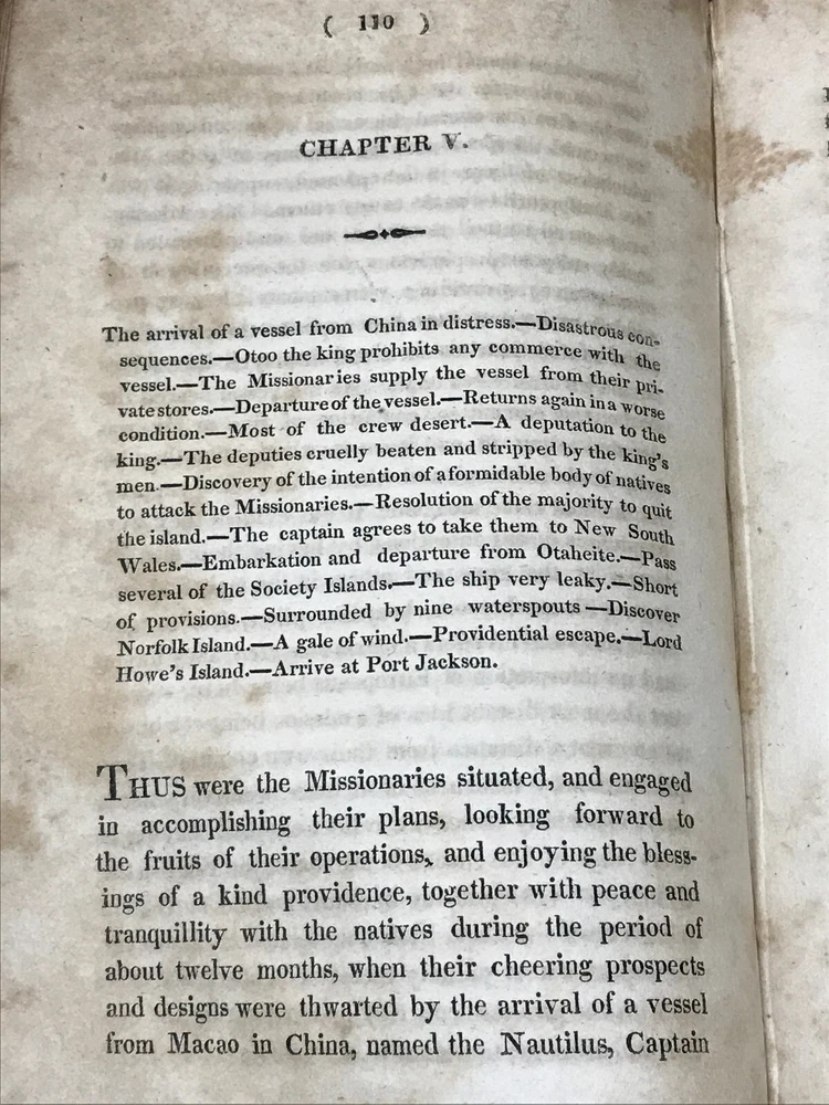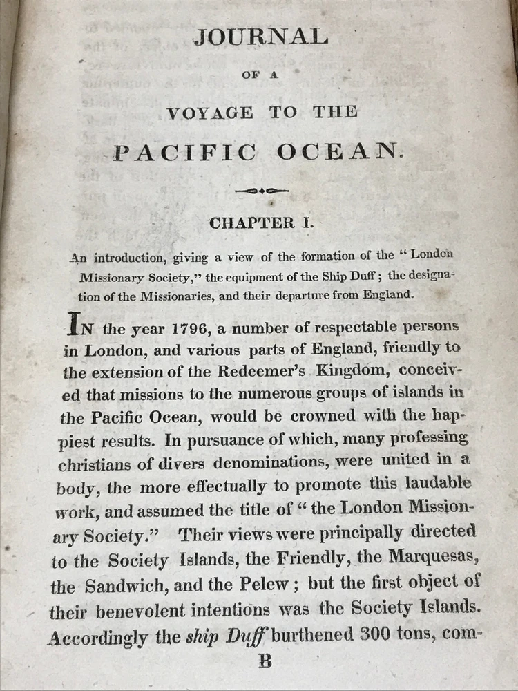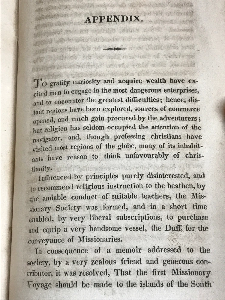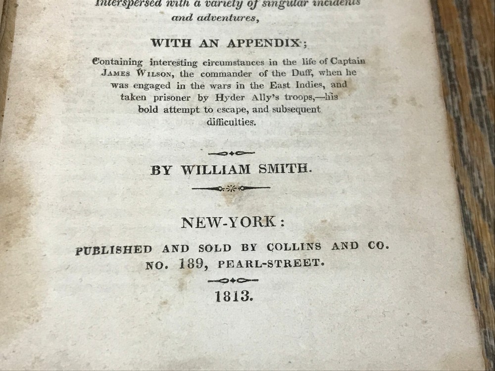 Journal Of A Voyage In The Missionary Ship Duff; To The Pacific Ocean In The Years 1796, 7, 8, 9, 1800, 1, 2, & c.: Comprehending Authentic And Circumstantial Narratives Of The Disasters Which Attended The First Effort of the "London Missionary Society." Interspersed with a Variety of Singular Incidents and Adventures, With An Appendix; containing interesting circumstances in the life of Captain James Wilson, the commander of the Duff, when he was engaged in the wars in the East Indies, and taken prisoner by Hyder Ally's troops, - his bold attempt to escape, and subsequent difficulties. By William Smith. New-York: Published And Sold By Collins And Co. 1813. First Edition. Publisher's full leather covered boards. iv, 288 pp. Measures 7" x 4 1/2". Rare book.