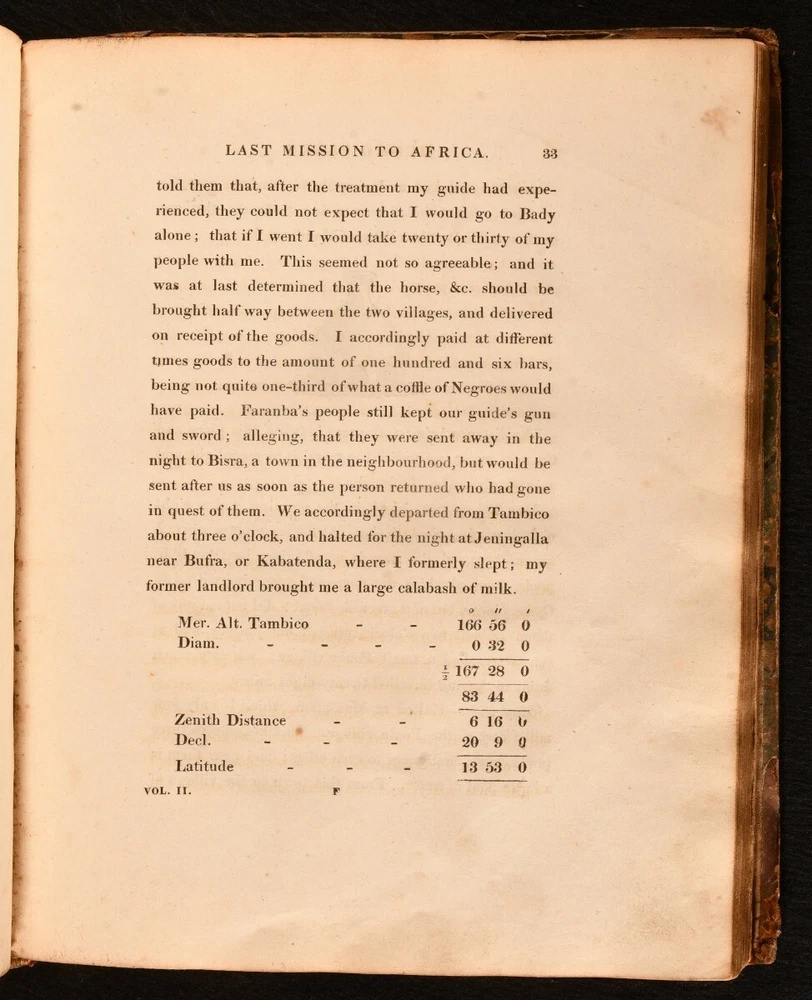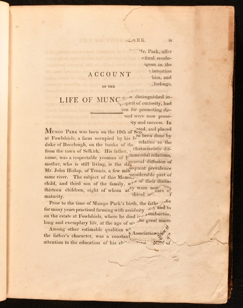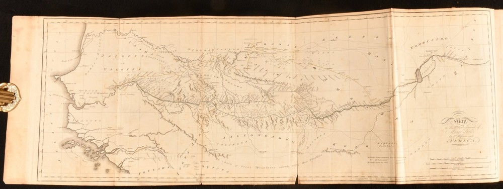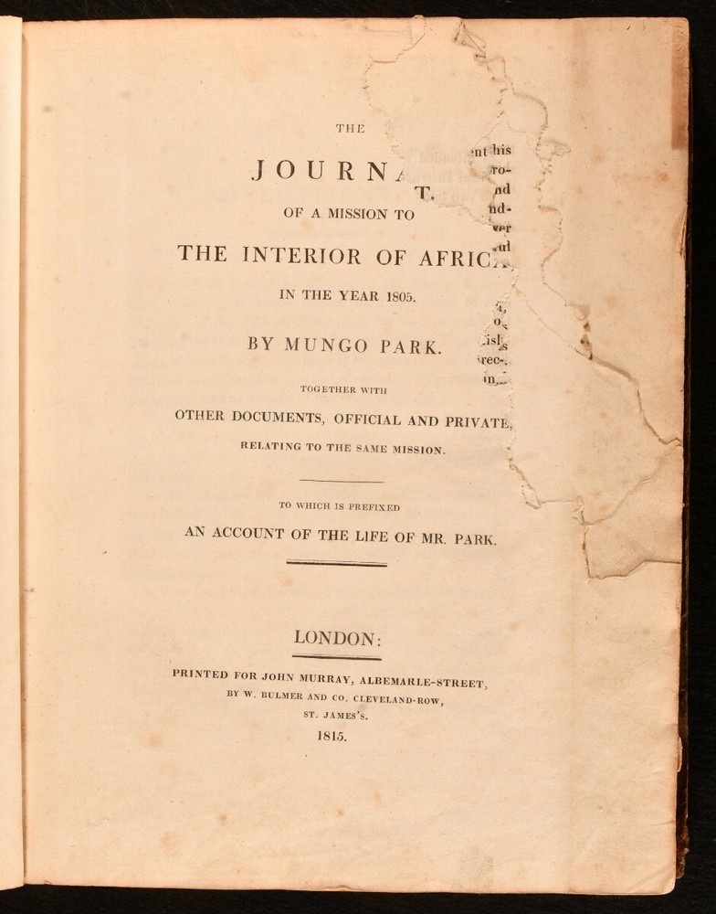 Click here to see our other books! The Journal of a Mission the Interior of Africa in the Year 1805 Mungo Park 1815 John Murray : London 11" by 9" [12], cxxx, [2], 219pp SUMMARY The scarce and sought after first edition of this account of Mungo Park's final mission to Africa, illustrated with a detailed folding map. First Edition,Folding Maps,Illustrated,Leather Binding,Scarce Overall Condition: Good Only This book weighs 1.5 KG when packed UK Postage: £ 3.99 US Postage: £ 23.99 EU Postage : £ 18.99 European Postage: £ 19.99 Asia Postage: £ 31.99 Worldwide Postage: £ 32.99 DESCRIPTION The sought after scarce first edition of this work. Half-title is present. Illustrated with a folding map. The important travel journal of Mungo Park, recounting Park's final expedition, compiled from a variety of original documents from Park's last mission into Africa. This work is the continuation of Park's earlier publication 'Travels in the Interior Districts of Africa'. Park was one of the first successful European explorers of Africa, the first Westerner recorded to travel to the center of the Niger. His travels inspired further Western exploration of the continent of Africa. He was killed during his second African expedition, after having travelled down two-thirds of the Niger River. This volume includes the journal of Isaaco, an African who was commissioned with trying to search for and find the fate of Park. Collated, bound without 'Addenda to the Account of the Life of Mungo Park' to the rear. Bookplate of Sir Felix Calvert Mackenzie to the front paste down. Mackenzie was a solicitor, knighted on the occasion of Queen Victoria's Diamond Jubilee in 1897. CONDITION In a half calf binding with marbled paper to the boards. Externally, front board is detached but present. Rubbing to the boards and spine, resulting in some loss of paper and leather. Rear joint is starting, with loss of leather. A small amount of loss to the head and tail of the spine, heavier to the tail. Loss to roughly half to the spine label. Minor bumping to the extremities. Rear hinge is reinforced. Bookplate to the front paste down. Blind stamp to the rear endpaper. Lacking the front endpaper. Internally, firmly bound. Pages are lightly age-toned with the occasional spot and ink mark. Small closed tears to the folds of the folding map. Heavy wear to the first few pages, from the half title to page viii, affecting a total of twenty pages; loss to part of the text to the title page, and loss to thirty-two lines of text to the first four pages of the advertisement; loss is significantly heavier to the two page contents, half-title of 'Account of the Life of Mungo Park', and to the first six pages of 'Life', with loss to about half of the pages. Overall Condition: Good Only GLOSSARY OF TERMS Overall Condition (Dustwrapper condition rating is shown after that for the book itself, where a dustwrapper is present) Fine - Very well preserved copy showing very little wear Very Good Indeed - Only one or two minor faults, really a very attractive copy Very Good - Quite a wide term meaning no major faults but probably several smaller ones often expected given the age of the book, but still a respectable copy Good - Meaning not very good. Some more serious faults as will be described in the condition report under 'condition' Good Only - Meaning one or more faults that could really do with repair Fair - As with good only above but with other faults leaving a compromised copy even after repair Poor - Really bad and possibly seriously incomplete. We only sell books in this condition where their rarity or value makes them attractive none the less. Major defects will be described. GUARANTEE We offer a full money back guarantee on our descriptions. Please ask for details and conditions. We prefer PAYPAL. If you pay via PAYPAL we will post the item off the same or the next working day with the postage you have selected. Please note we cannot accept USD cheques
