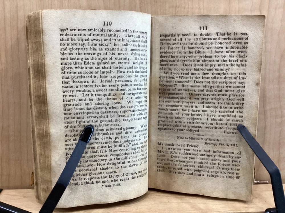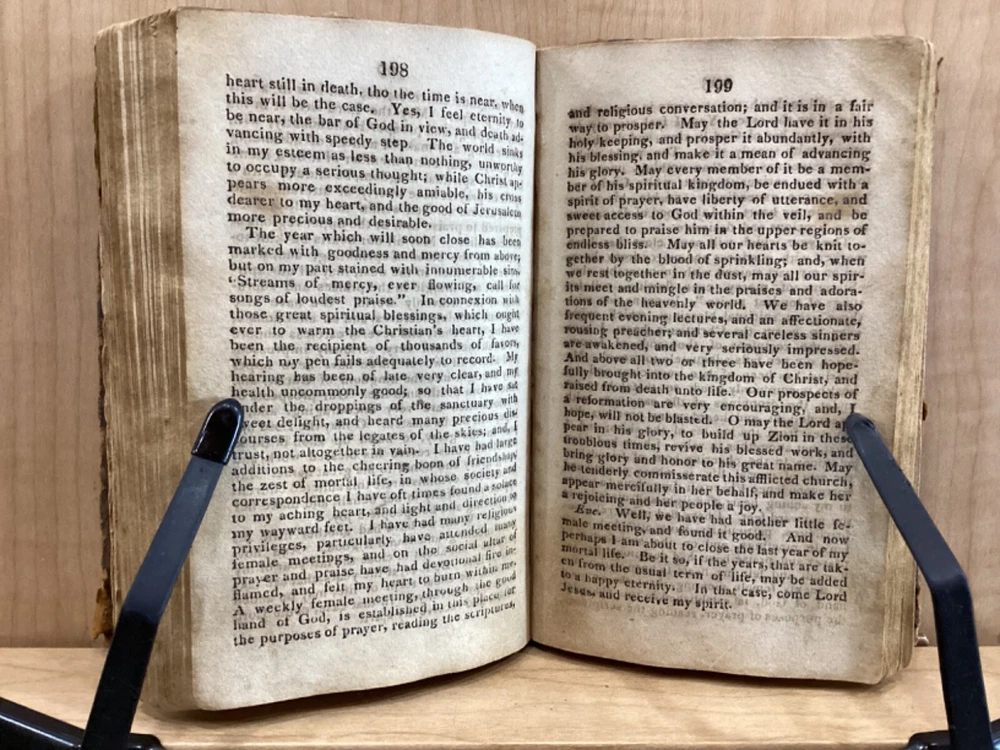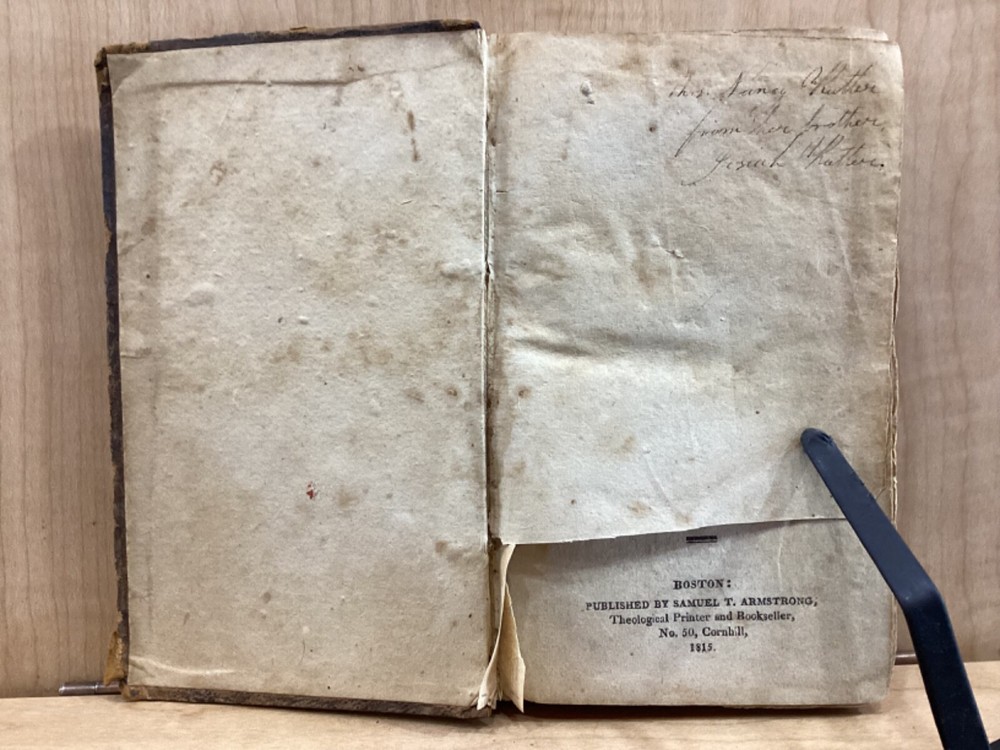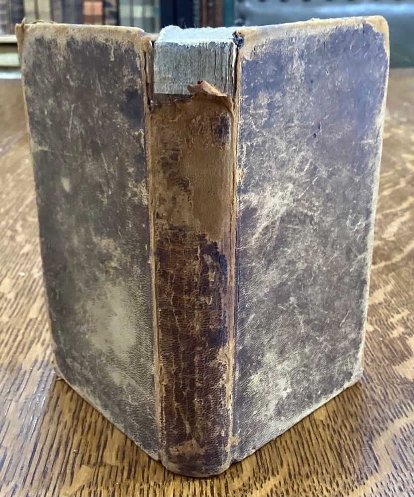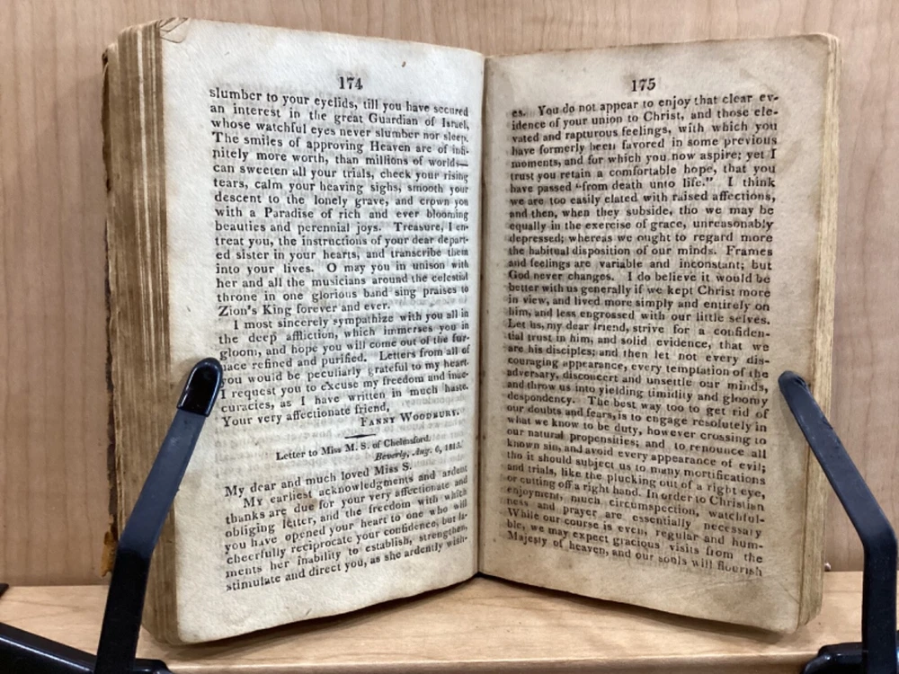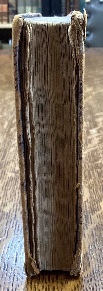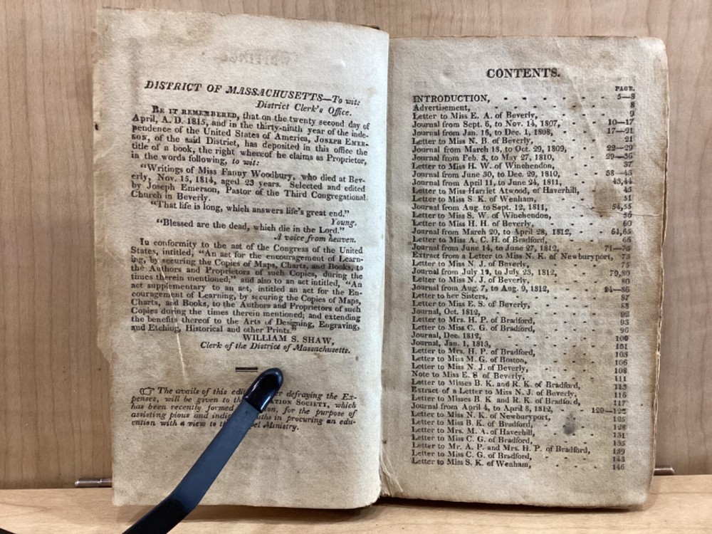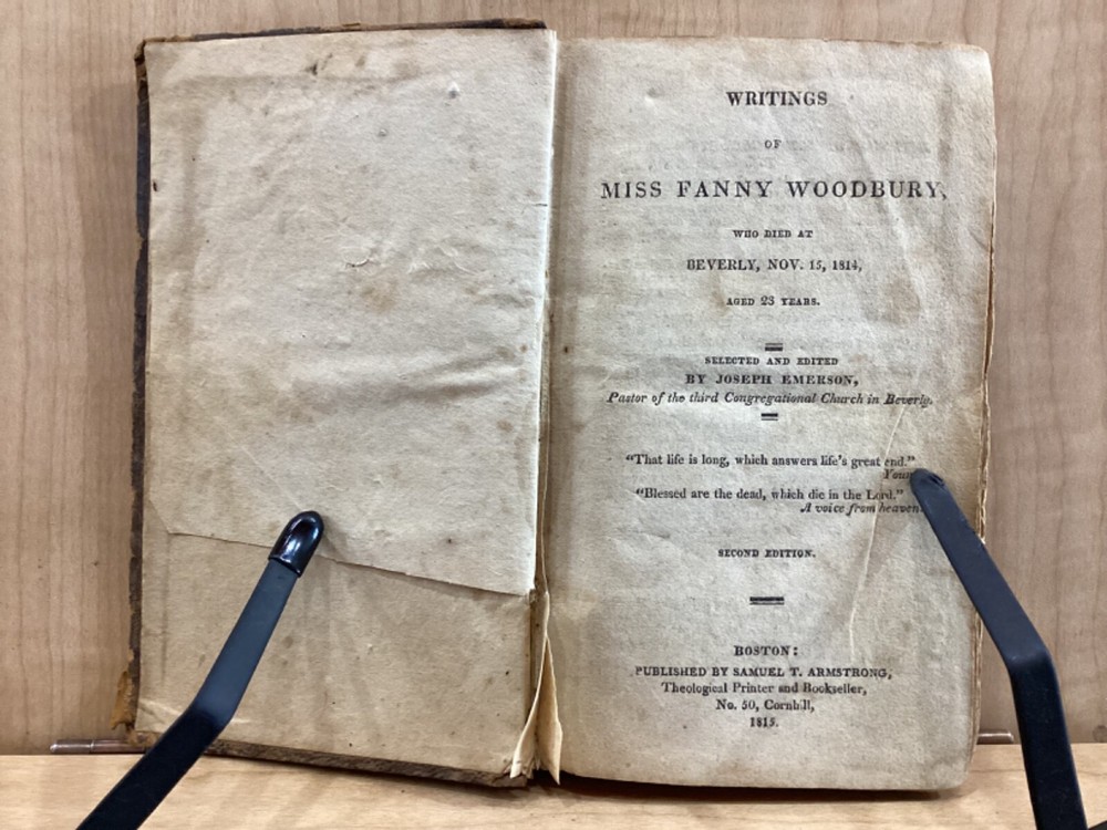 Writings of Miss Fanny Woodbury, Who Died at Beverly, Nov. 15, 1814, Aged 23 Years, Selected and Edited by Joseph Emerson, Second Edition, Samuel T. Armstrong, Boston, 1815, 288pp, leather, 3.5 x 6", 32mo Fair condition. Wear and chipping to boards. Tips are bumped with exposed boards. Edges are scuffed. Cracking and chipping to spine. Headcap is lacking; binding exposed. Bottom half of flyleaf is torn off. Endpapers are torn out. Gift inscription on top half of flyleaf. Toning, age-staining, and foxing throughout textblock. Binding intact. Please see photos. Journal extracts and letters written by Miss Fanny Woodbury (September 10, 1791 - November 15, 1814) of Hamilton, Massachusetts. Woodbury had a weak constitution and was rendered near deaf at the age of three due to a fever. She was deeply ensconced in her religion and was regarded as having a great sense of humility and often used her time to visit and assist others suffering from medical afflictions. FORN-TUB-0041-BB-2405-JC779