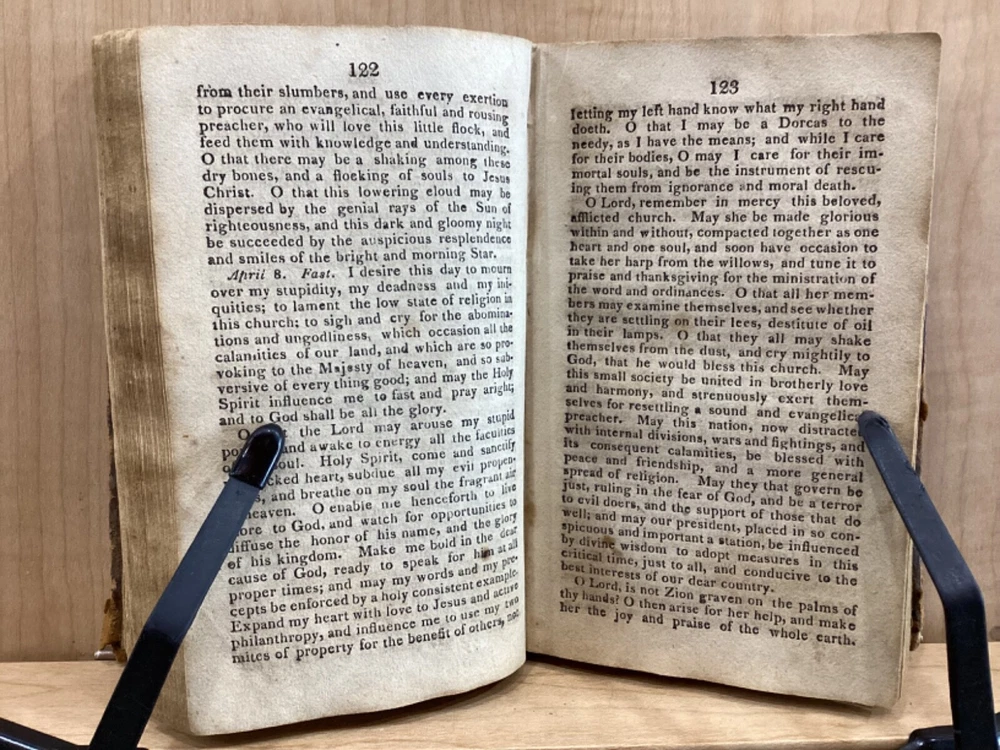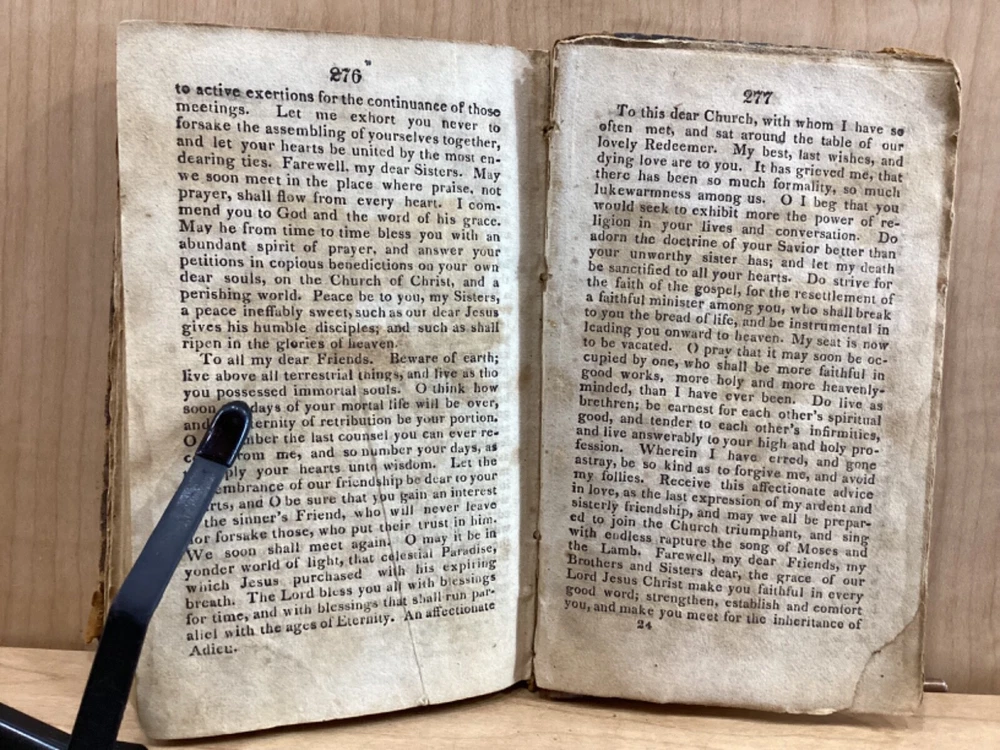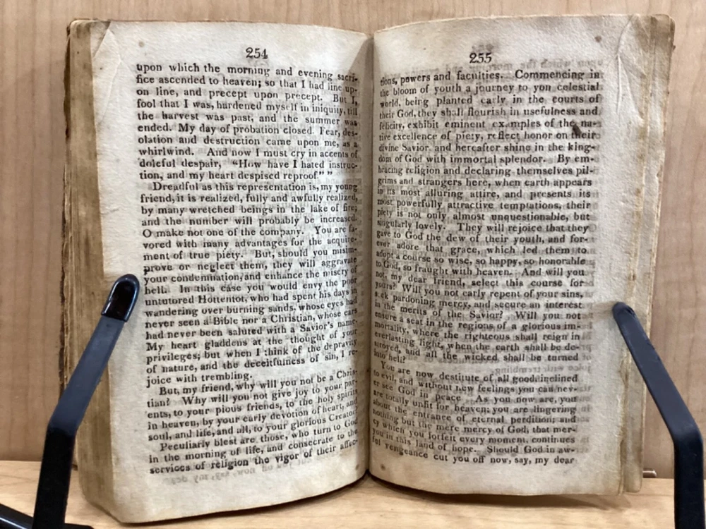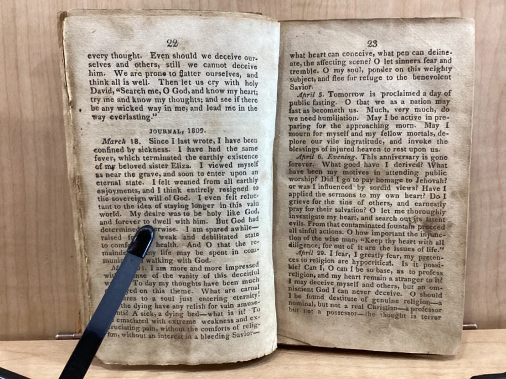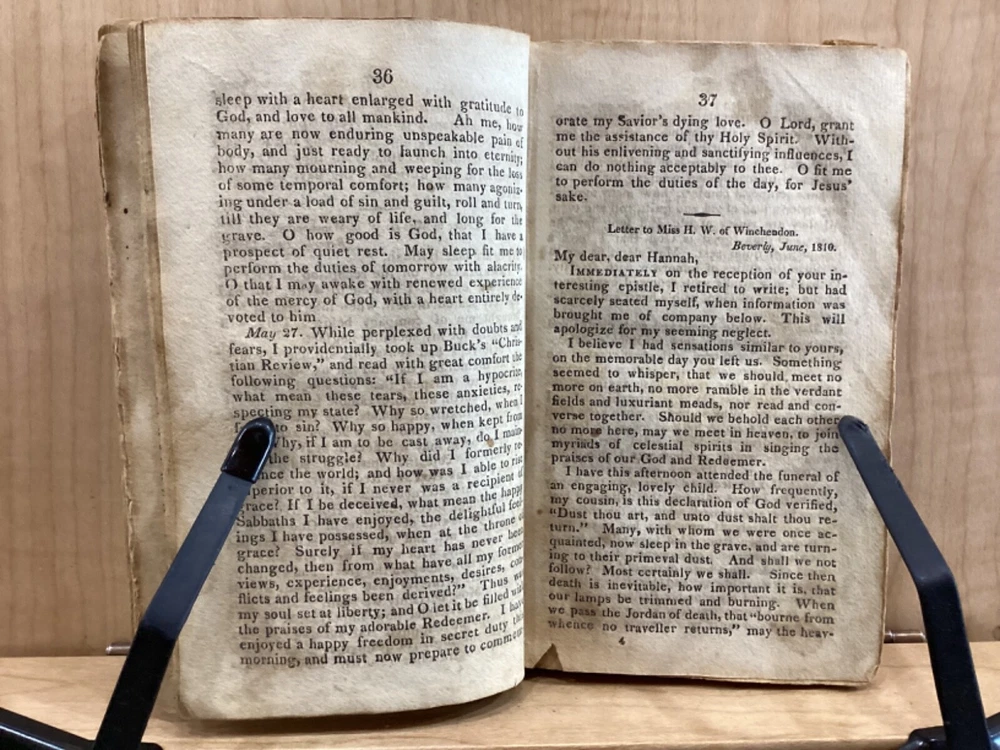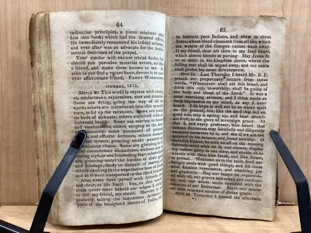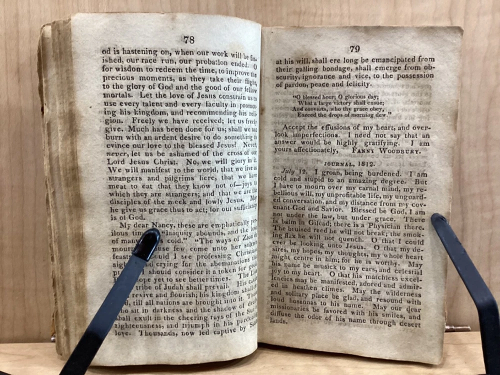 Writings of Miss Fanny Woodbury, Who Died at Beverly, Nov. 15, 1814, Aged 23 Years, Selected and Edited by Joseph Emerson, Second Edition, Samuel T. Armstrong, Boston, 1815, 288pp, leather, 3.5 x 6", 32mo Fair condition. Wear and chipping to boards. Tips are bumped with exposed boards. Edges are scuffed. Cracking and chipping to spine. Headcap is lacking; binding exposed. Bottom half of flyleaf is torn off. Endpapers are torn out. Gift inscription on top half of flyleaf. Toning, age-staining, and foxing throughout textblock. Binding intact. Please see photos. Journal extracts and letters written by Miss Fanny Woodbury (September 10, 1791 - November 15, 1814) of Hamilton, Massachusetts. Woodbury had a weak constitution and was rendered near deaf at the age of three due to a fever. She was deeply ensconced in her religion and was regarded as having a great sense of humility and often used her time to visit and assist others suffering from medical afflictions. FORN-TUB-0041-BB-2405-JC779