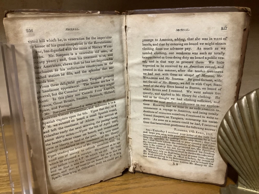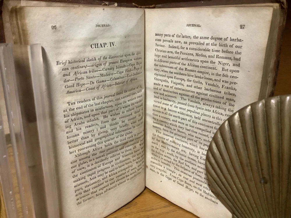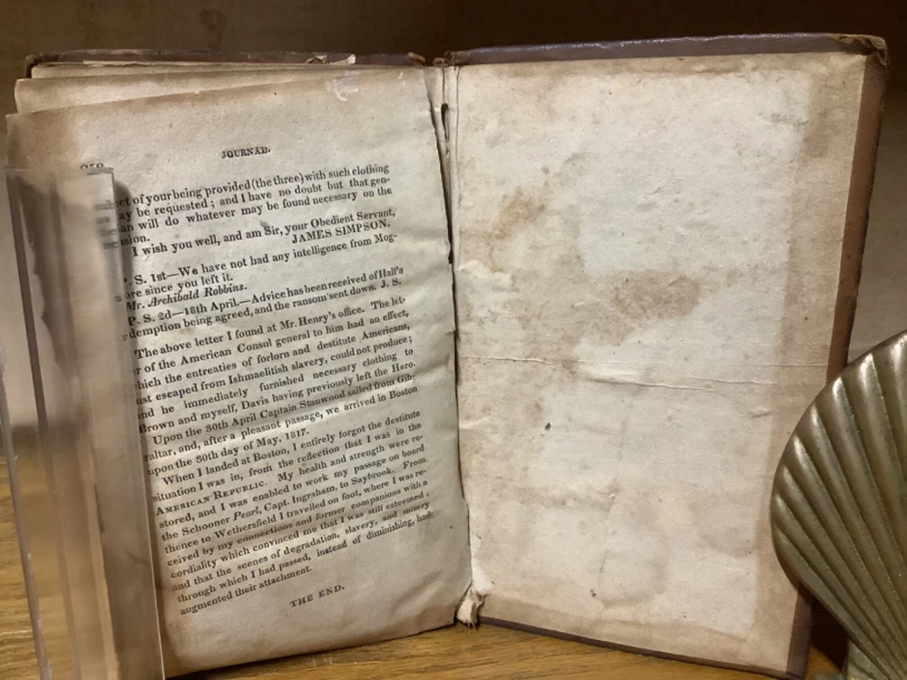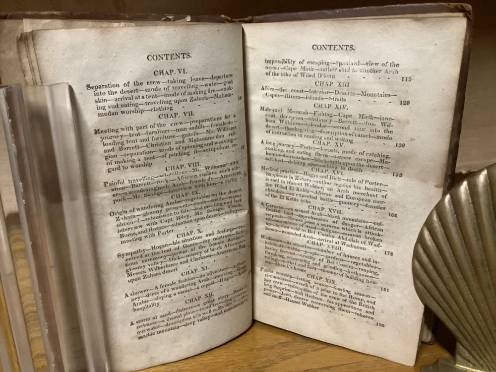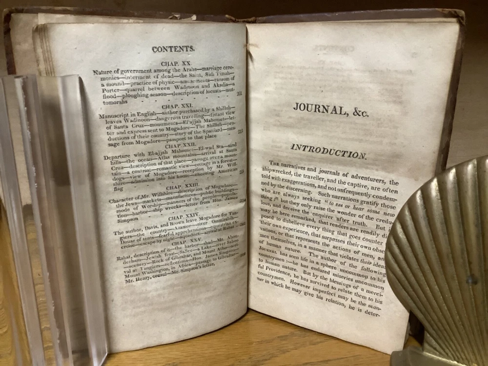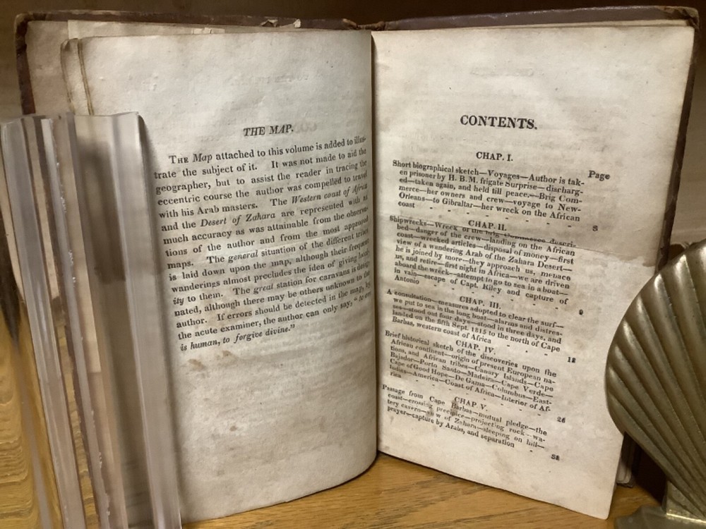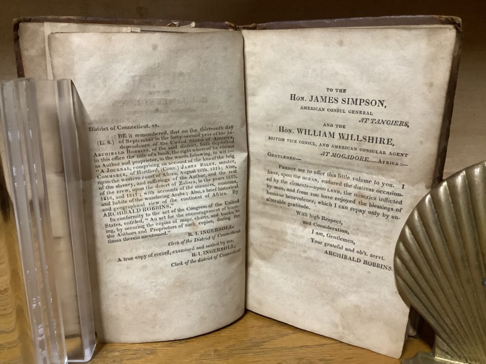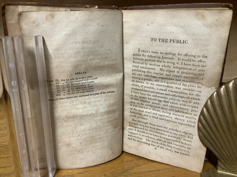 A Journal, Comprising an Account of the Loss of the Brig Commerce, of Hartford (Con.) James Riley, Master, Upon the Western Coast of Africa, August 23, 1815. By Archibald Robbins and printed in Hartford by F.D. Bolles. 1817, 258 pp, 7” x 4.5”, 8vo, full leather hardcover. In fair condition, with rubbing and wear to boards. Loss to binding along edges of spine. Cracking to boards, notably between frontispiece and title page. Text block remains bound well, save for first and last several pages, which are loose or torn. Loss to part of frontispiece map. Staining to some pages, along with assorted marginalia and markings. General age-related toning to pages, along with periodic foxing and wear. Please see photographs and ask any questions prior to purchasing. A scarce examination of the wreck of the Commerce, an American whaling ship that ran aground off the Moroccan coast in 1815, leading to the survivors ultimately being sold into slavery prior to being released with American and Moroccan diplomacy. A wonderful piece for preservation and restoration. COLU1817BJLS-0923-aj0532