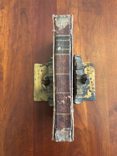 JOURNALS OF THE GENERAL CONVENTIONS OF THE PROTESTANT EPISCOPAL CHURCH, IN THE UNITED STATES OF AMERICA; FROM THE YEAR 1784, TO THE YEAR 1814, INCLUSIVE. ALSO, FIRST APPENDIX, CONTAINING THE CONSTITUTION AND CANONS. AND SECOND APPENDIX, CONTAINING THREE PASTORAL LETTERS Published: John Bioren, Philadelphia, 1817 . Hardcover in full calf leather binding w/ black leather spine label, 5.5" x 8.75”, 381 pp. Boards are loose and nearly detached. Not Ex-Lib. I've done my best to describe the book, but if you have additional questions, please don't hesitate to send me an e-mail.