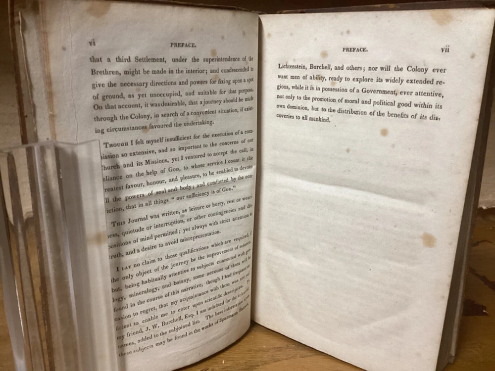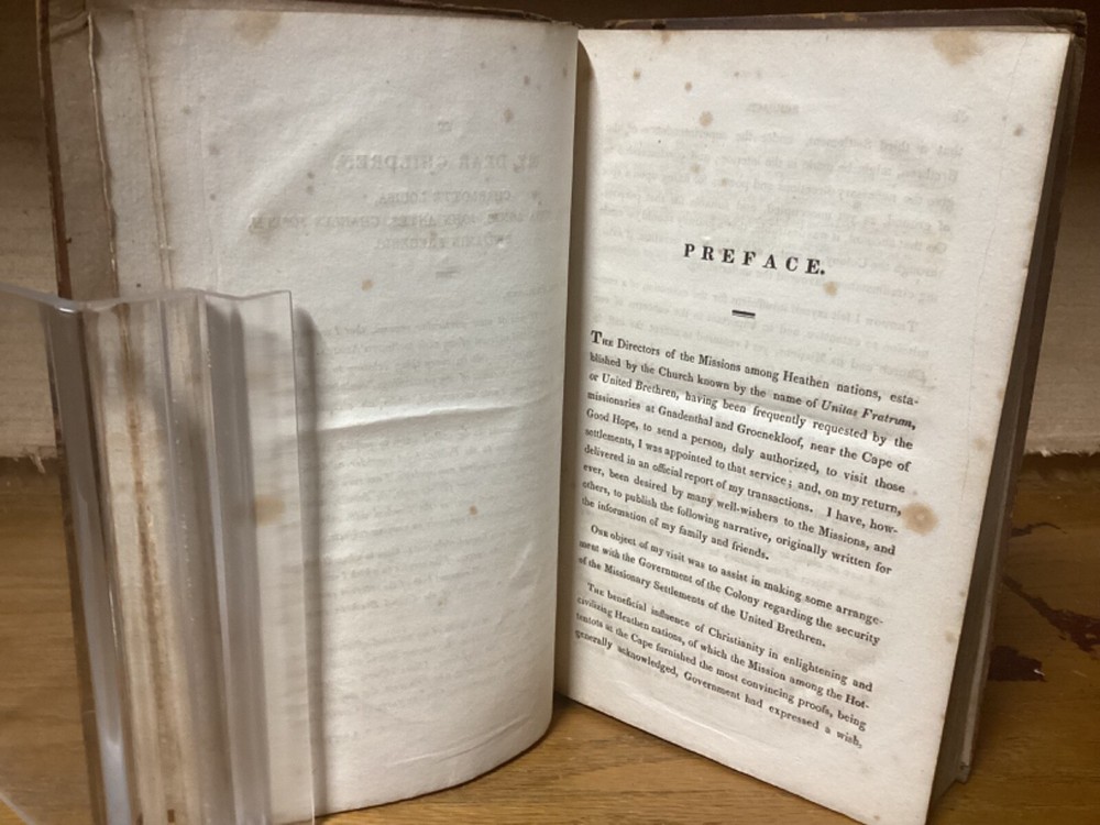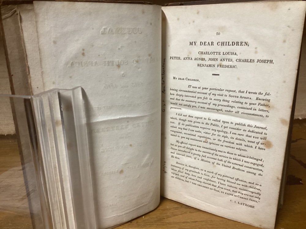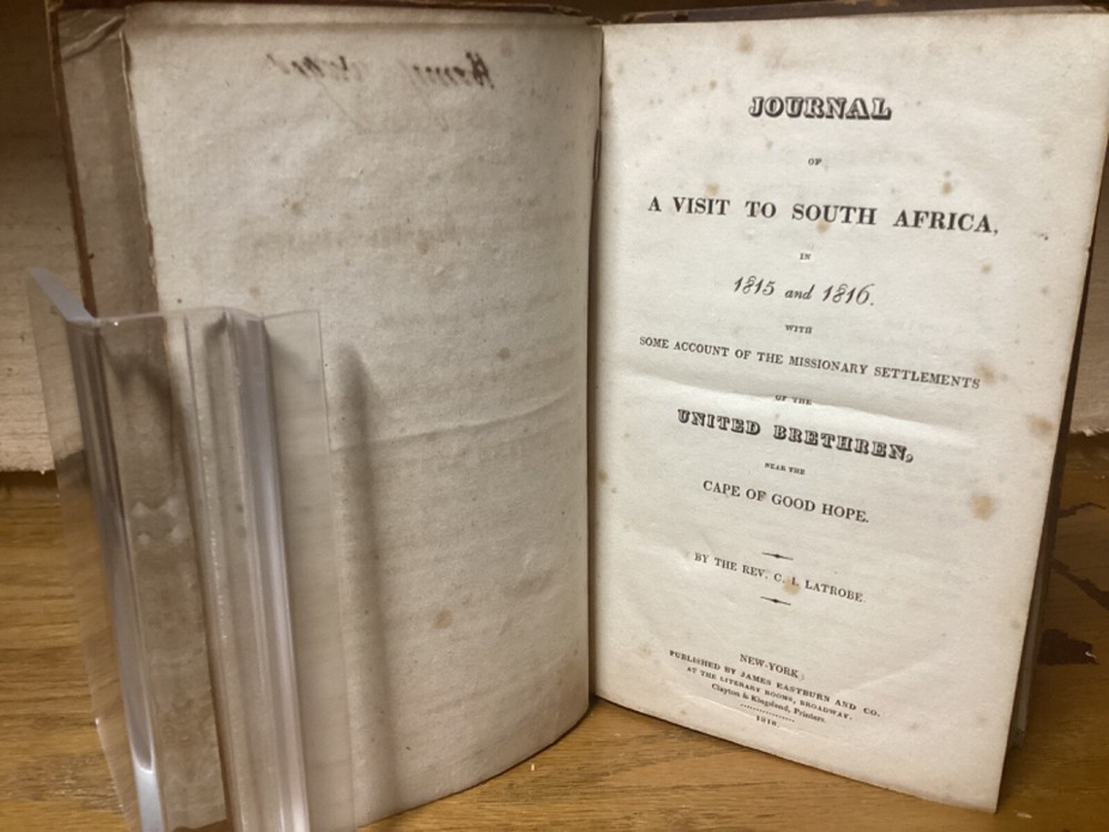 Journal of a Visit to South Africa, in 1815 and 1816, with Some Account of the Missionary Settlements of the United Brethren, Near the Cape of Good Hope. By Rev. C.I. Latrobe and printed in New York City by James Eastburn and Co. 1818, 395 pp, 8.5” x 5.5”, 8vo, hardcover full leather. As-is, with front board detached. Rubbing and wear to exterior of boards, primarily along edges and corners.Some smudging and loss to title label on spine. Text block remains bound well. Light markings and marginalia at front. Index at rear. General age-related toning to pages, along with periodic foxing and wear. Please see photographs and ask any questions prior to purchasing. A scarce volume on the author’s travels to modern-day South Africa. C.I. Latrobe (1758-1836) was an English clergyman of the Moravian Church, which was a proponent of mission work at the time. At this point, the Moravian Church was referenced to the Unitas Fratum, or the United Brethren, hence the title. A wonderful piece for restoration. COLT1818BFAW-0624-aj1747 FORN-TUB-0063-BB-2501-BSREV14