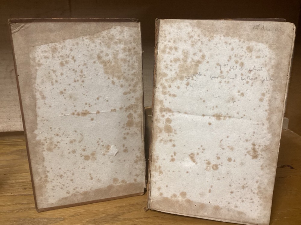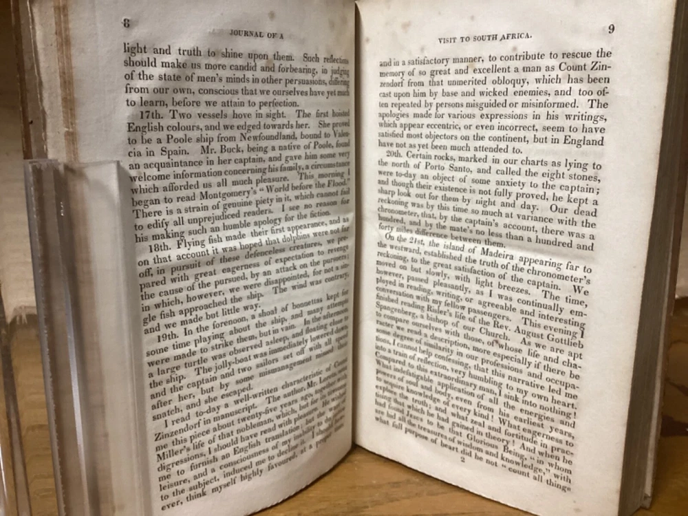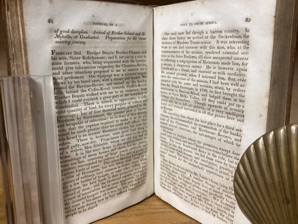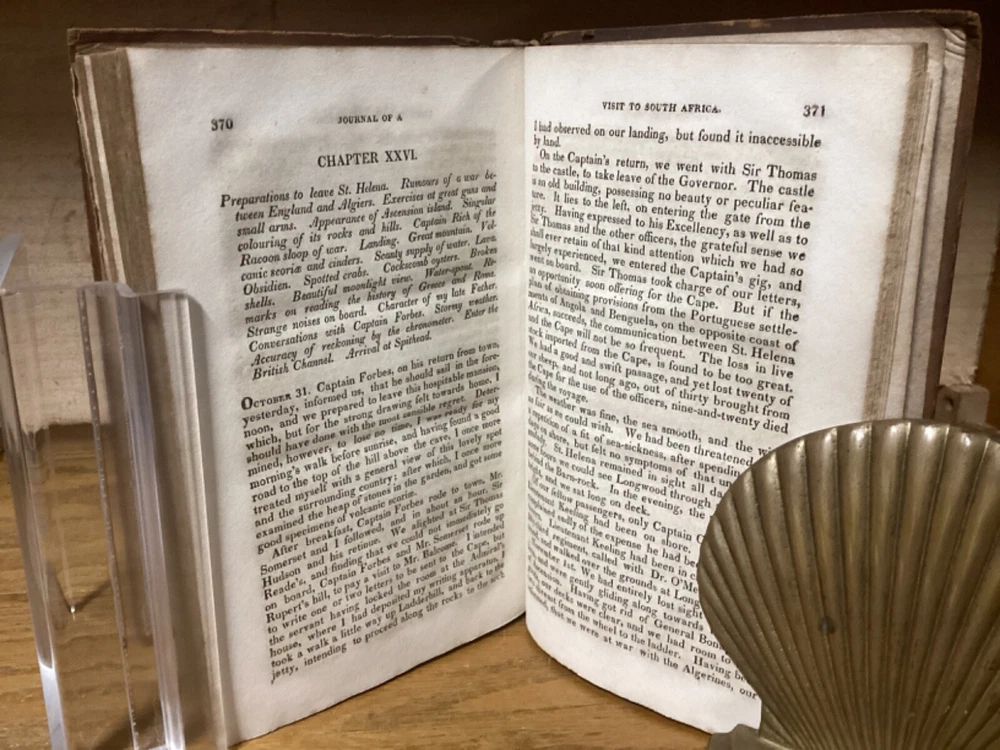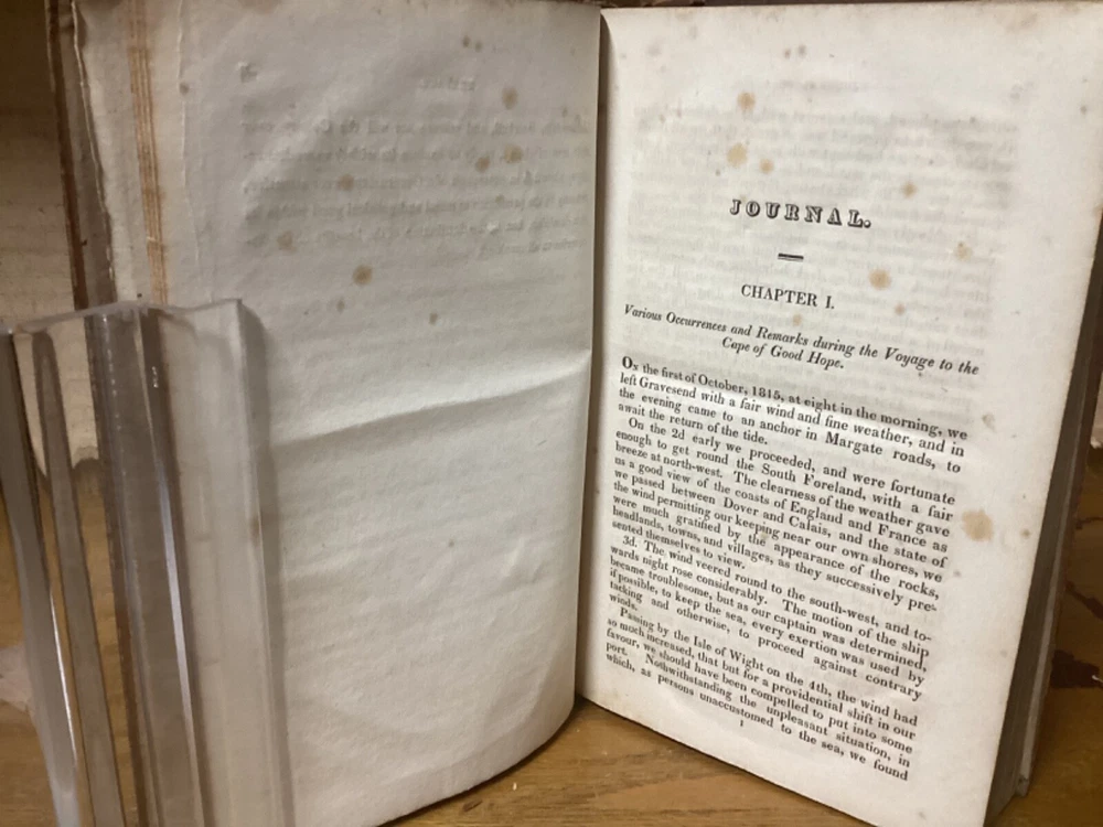 Journal of a Visit to South Africa, in 1815 and 1816, with Some Account of the Missionary Settlements of the United Brethren, Near the Cape of Good Hope. By Rev. C.I. Latrobe and printed in New York City by James Eastburn and Co. 1818, 395 pp, 8.5” x 5.5”, 8vo, hardcover full leather. As-is, with front board detached. Rubbing and wear to exterior of boards, primarily along edges and corners.Some smudging and loss to title label on spine. Text block remains bound well. Light markings and marginalia at front. Index at rear. General age-related toning to pages, along with periodic foxing and wear. Please see photographs and ask any questions prior to purchasing. A scarce volume on the author’s travels to modern-day South Africa. C.I. Latrobe (1758-1836) was an English clergyman of the Moravian Church, which was a proponent of mission work at the time. At this point, the Moravian Church was referenced to the Unitas Fratum, or the United Brethren, hence the title. A wonderful piece for restoration. COLT1818BFAW-0624-aj1747 FORN-TUB-0063-BB-2501-BSREV14