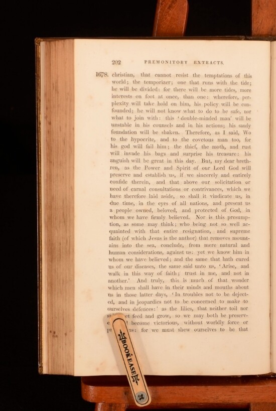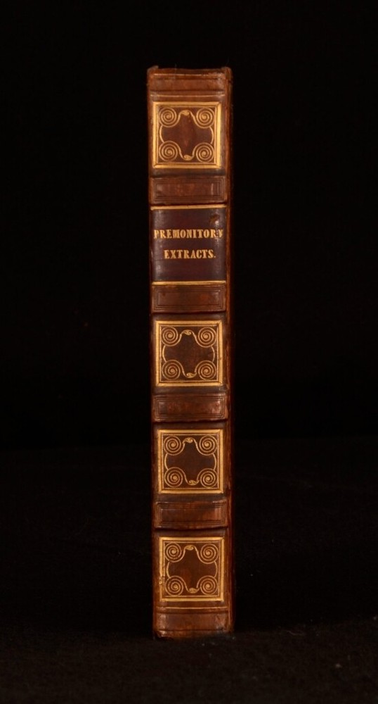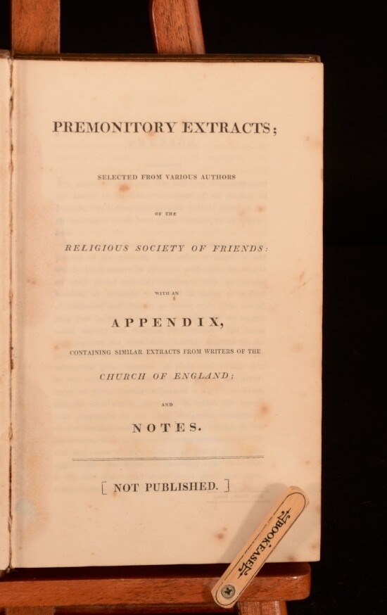 Click here to see our other books! Premonitory Extracts; Selected From Various Authors Of The Religious Society Of Friends Various 1819 Not Stated : Bristol 9" by 5.5" lv, 419pp SUMMARY Gawen Ball's compilation of Quaker premonitory writings, which was privately printed and distributed. Leather Binding,Very Scarce Overall Condition: Very Good This book weighs 1 KG when packed UK Postage: £ 3.99 US Postage: £ 22.99 EU Postage : £ 16.99 European Postage: £ 17.99 Asia Postage: £ 22.99 Worldwide Postage: £ 28.99 DESCRIPTION Extremely scarce. Ball says of himself in the preface that he collected these extracts, "having been from his youth accustomed to the perusal of the journals and other writings of our worthy predecessors in religious profession...". All of the extracts are eschatological in nature. He pleads the "extraordinary aspect of the times" as a reason to bring them to public notice. The work was privately published, and previously belonged to one Benjamin Whitton Carlow, whose personal bookplate can be found to the front pastedown. CONDITION In a full calf binding, with gilt borders and gilt detailing and titles to the spine. The front joint is tender but still reasonably firm. With some rubbing to the spine and wear to the head and the tail. Some light marking to the boards. With a personal bookplate to the front pastedown. Internally some spotting throughout. Generally firmly bound. Overall Condition: Very Good GLOSSARY OF TERMS Overall Condition (Dustwrapper condition rating is shown after that for the book itself, where a dustwrapper is present) Fine - Very well preserved copy showing very little wear Very Good Indeed - Only one or two minor faults, really a very attractive copy Very Good - Quite a wide term meaning no major faults but probably several smaller ones often expected given the age of the book, but still a respectable copy Good - Meaning not very good. Some more serious faults as will be described in the condition report under 'condition' Good Only - Meaning one or more faults that could really do with repair Fair - As with good only above but with other faults leaving a compromised copy even after repair Poor - Really bad and possibly seriously incomplete. We only sell books in this condition where their rarity or value makes them attractive none the less. Major defects will be described. GUARANTEE We offer a full money back guarantee on our descriptions. Please ask for details and conditions. We prefer PAYPAL. If you pay via PAYPAL we will post the item off the same or the next working day with the postage you have selected. Please note we cannot accept USD cheques