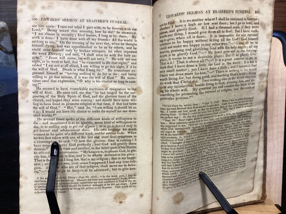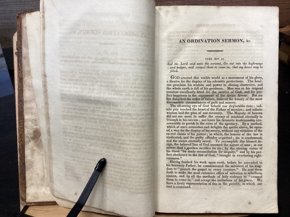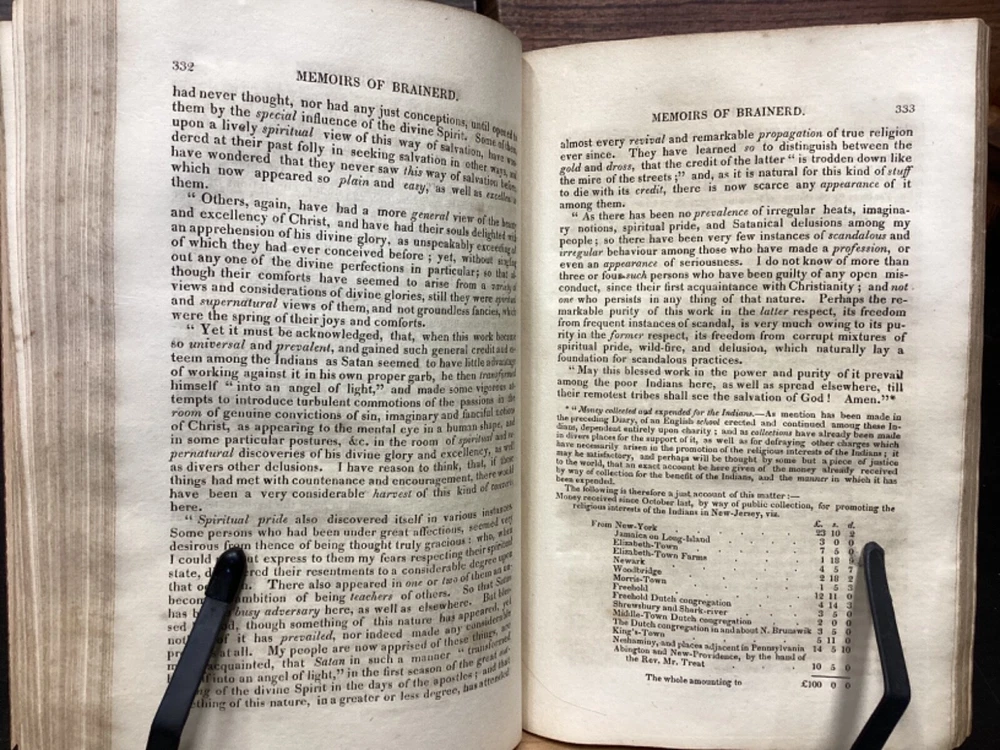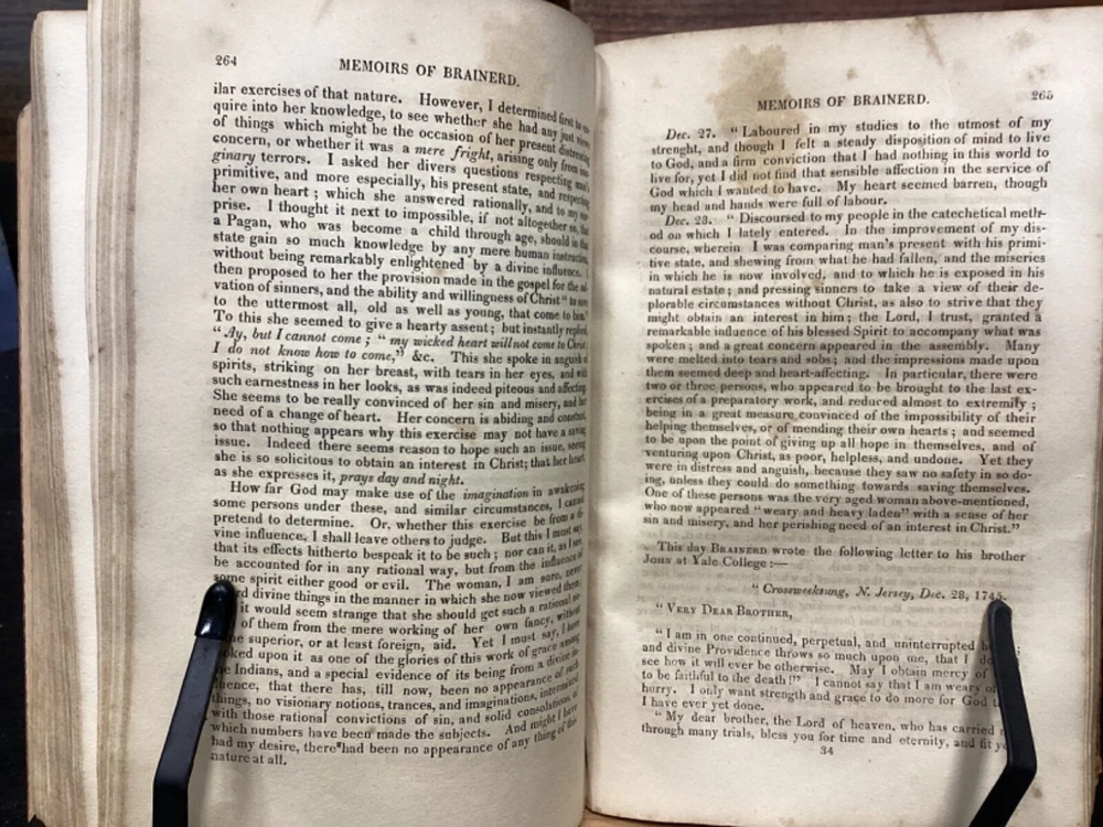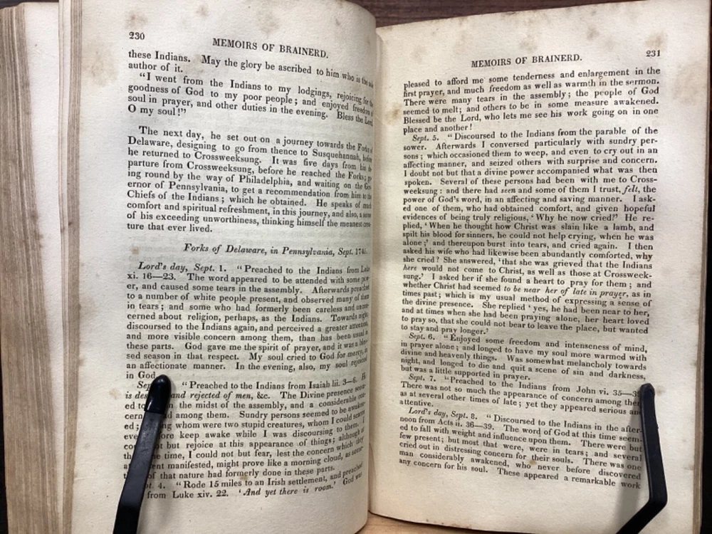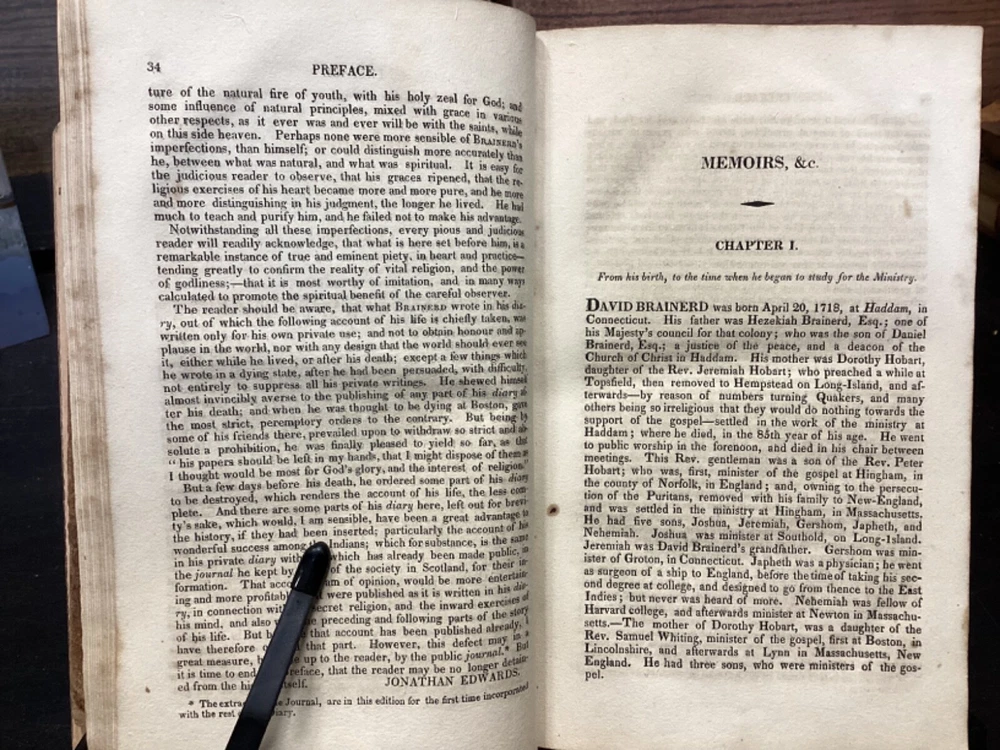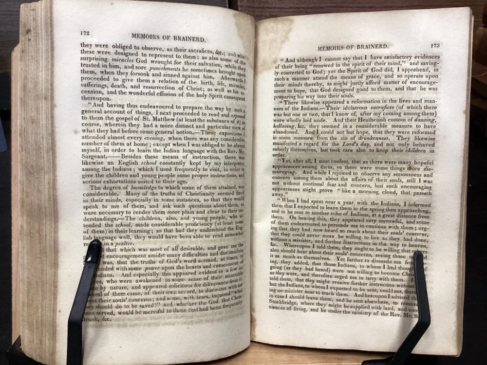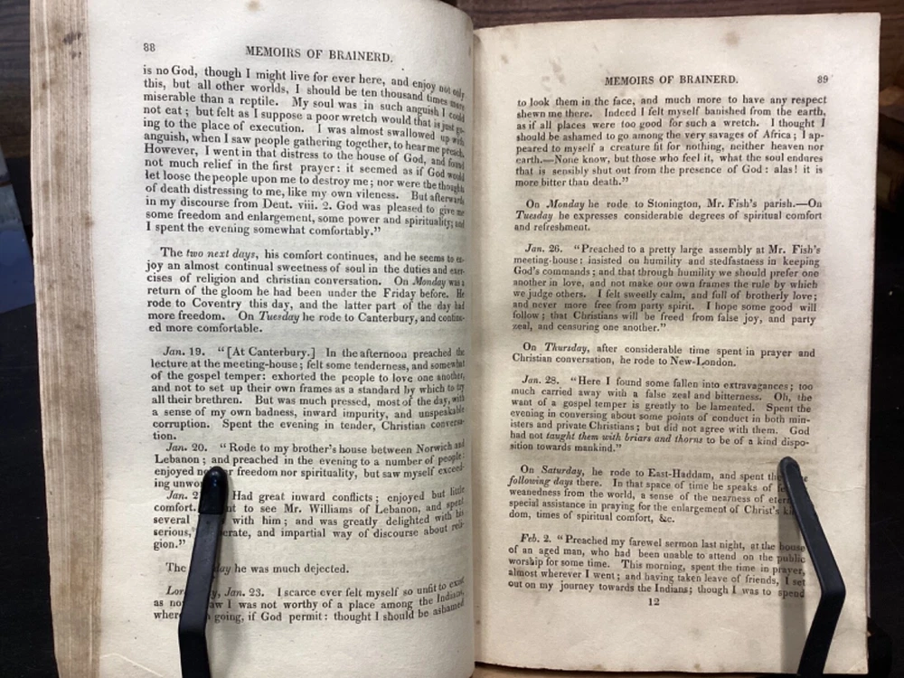 Memoirs of the Rev. David Brainerd; Missionary to the Indians on the Borders of New York, New Jersey, and Pennsylvania: Chiefly Taken from His Own Diary, by Rev. Jonathan Edwards, of Northampton, Including His Journal, Now for the First Time Incorporated with the Rest of His Diary, in a Regular Chronological Series, by Sereno Edwards Dwight, S. Converse, New Haven, 1822, 507pp, leather, 5.5 x 8.5", 12mo Poor condition/as is. Front and rear boards are cracked and chipped; redrot. Significant bumping to tips. Cracking and chipping spine with exposed binding at headcap and tail; illegible. Rear hinge and joint are cracked. Toning, age-staining, and foxing throughout textblock. Binding is fragile. Please see photos and ask any questions prior to purchase. David Brainerd (April 20, 1718 - October 9, 1747) was an American Presbyterian minister and missionary to the Native Americans among the Delaware Indians of New Jersey. Missionaries such as William Carey and Jim Elliot, and Brainerd's cousin, the Second Great Awakening evangelist James Brainerd Taylor (1801-1829) cit Brainerd as inspiration. FORN-MSB-0324-TUB0015-JC362