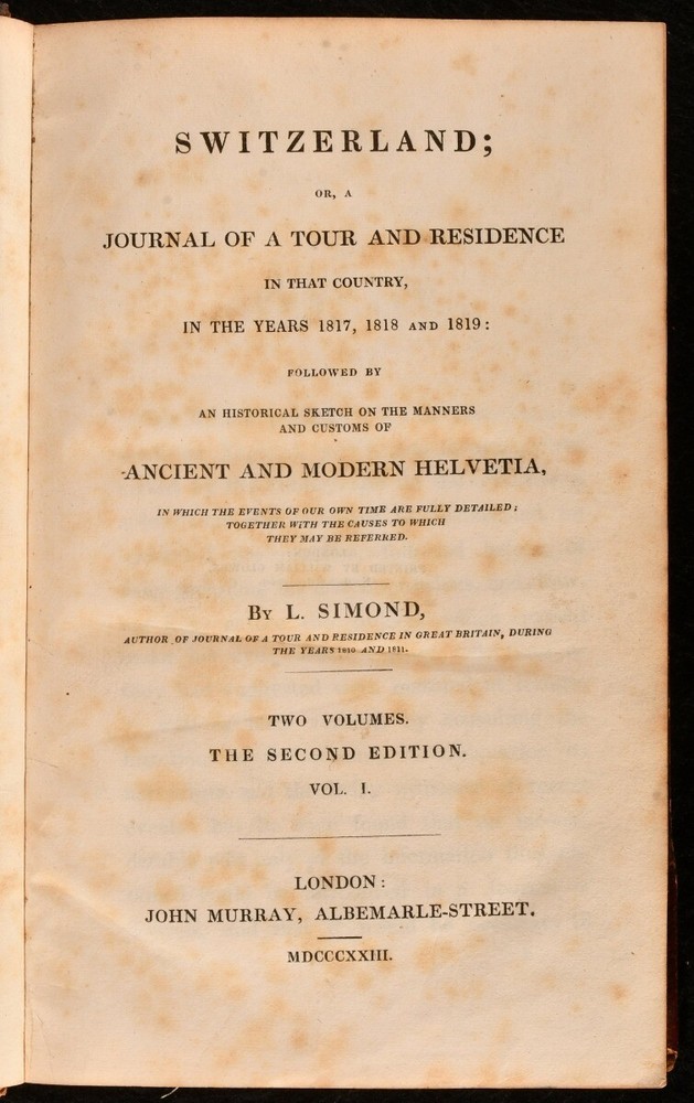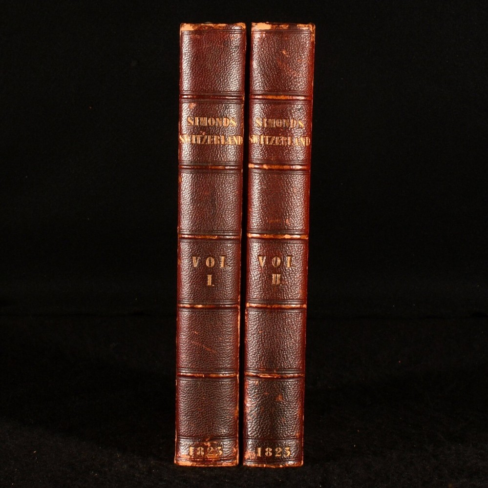 Click here to see our other books! Switzerland; or, A Journal of a Tour and Residence in that Country in the Years 1817, 1818 and 1819 L. Simond 1823 John Murray : London 8.5" by 5.5" vii, 520; [8], 500pp SUMMARY A smart complete two volume set of an account of travels in Switzerland. Leather Binding,Rebound Overall Condition: Good This book weighs 1.5 KG when packed UK Postage: £ 3.99 US Postage: £ 23.99 EU Postage : £ 18.99 European Postage: £ 19.99 Asia Postage: £ 31.99 Worldwide Postage: £ 32.99 DESCRIPTION A complete two volume set of Switzerland; or, A Journal of a Tour and Residence in that Country in the Years 1817, 1818 and 1819 which is followed by a historical sketch on the manners and customs of ancient and modern Helvetia by L. Simond, author of Journal of a Tour and Residence in Great Britain during the years 1810 and 1811. This is a second edition copy of this work, with the first being published in 1822. A fascinating and comprehensive reflection on Switzerland and its history. CONDITION In half morocco binding with marbled covered boards. Externally, generally smart with some fading and rubbing to the spine and some marks to the boards. Gift inscriptions to the leaf after the front free endpaper dated 2005. Internally, firmly bound with generally bright pages with some spots to the first and last few pages of both volumes. Overall Condition: Good GLOSSARY OF TERMS Overall Condition (Dustwrapper condition rating is shown after that for the book itself, where a dustwrapper is present) Fine - Very well preserved copy showing very little wear Very Good Indeed - Only one or two minor faults, really a very attractive copy Very Good - Quite a wide term meaning no major faults but probably several smaller ones often expected given the age of the book, but still a respectable copy Good - Meaning not very good. Some more serious faults as will be described in the condition report under 'condition' Good Only - Meaning one or more faults that could really do with repair Fair - As with good only above but with other faults leaving a compromised copy even after repair Poor - Really bad and possibly seriously incomplete. We only sell books in this condition where their rarity or value makes them attractive none the less. Major defects will be described. GUARANTEE We offer a full money back guarantee on our descriptions. Please ask for details and conditions. We prefer PAYPAL. If you pay via PAYPAL we will post the item off the same or the next working day with the postage you have selected. Please note we cannot accept USD cheques