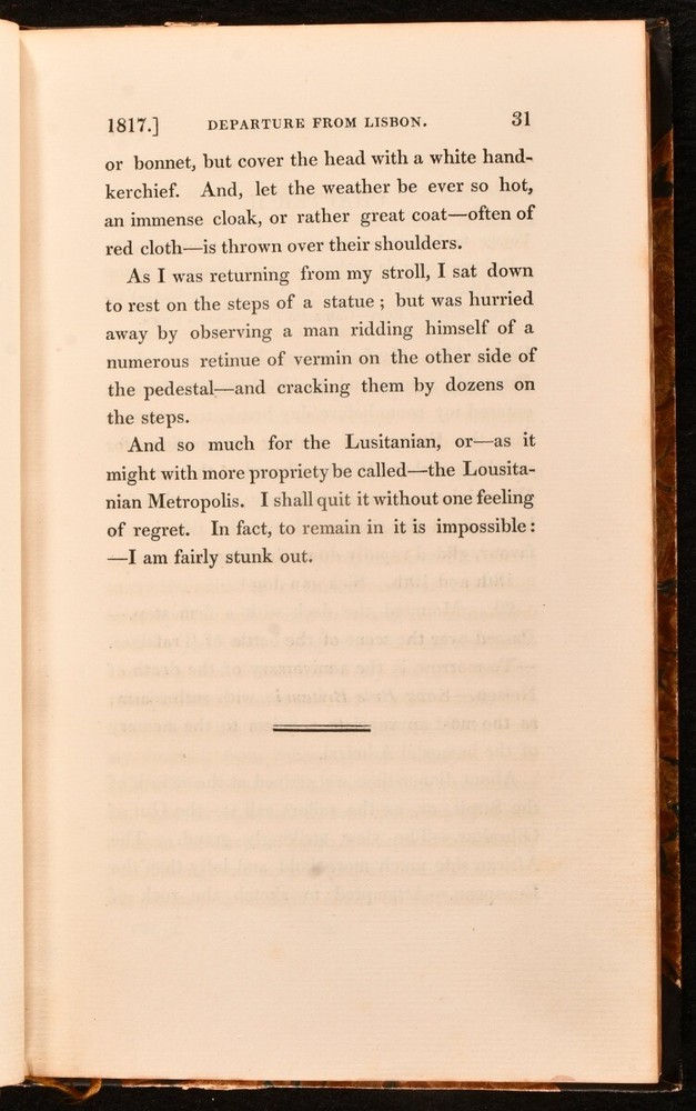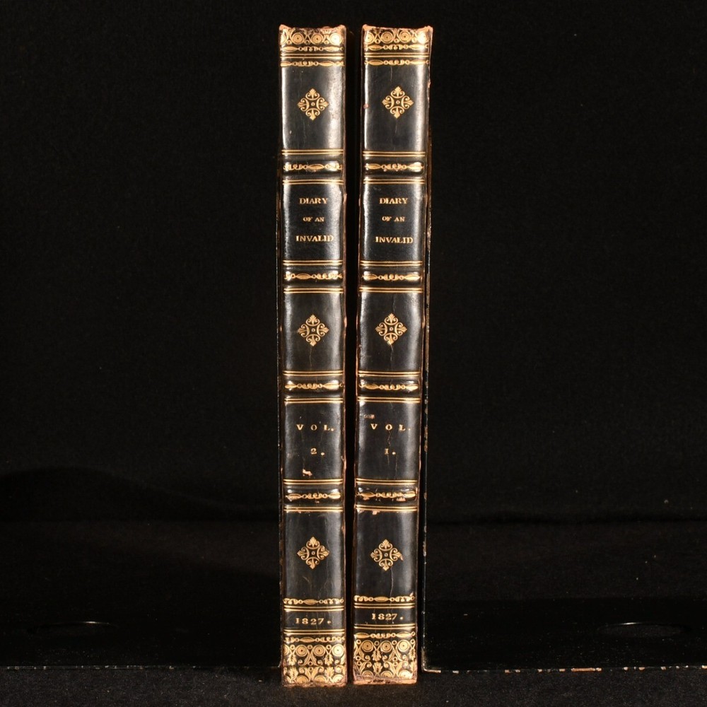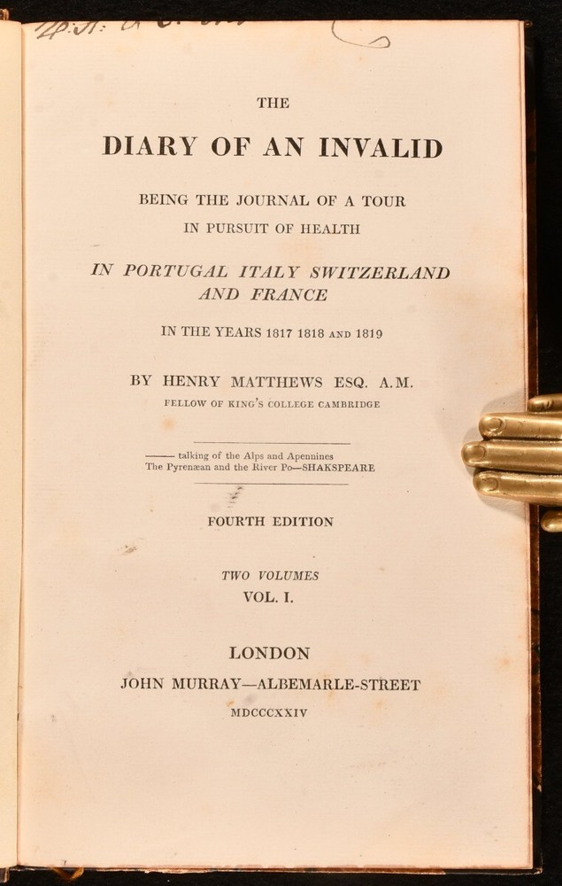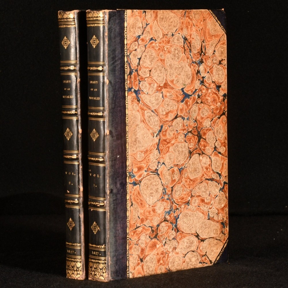 Click here to see our other books! The Diary of an Invalid: Being the Journal of a Tour in Pursuit of Health in Portugal, Italy, Switzerland and France in the Years 1817, 1818, and 1819. Henry Matthews 1824 John Murray : London 7.5" by 5" xvi, 296; xi, 307pp. SUMMARY Two volumes of Matthews' account of his time travelling to warmer climates for his health. Leather Binding,Original Binding,Publishers' Original Binding Overall Condition: Very Good This book weighs 1 KG when packed UK Postage: £ 3.99 US Postage: £ 22.99 EU Postage : £ 16.99 European Postage: £ 17.99 Asia Postage: £ 22.99 Worldwide Postage: £ 28.99 DESCRIPTION Two volumes. Fourth edition. A detailed account of the author's experiences upon leaving England in 1817 due to ill health. On his return, the work was published and became so popular that by 1835 it has reached a fifth edition. Matthews writes light and pleasant sketches of Portugal, Italy, Switzerland, and France. Written by Henry Matthews. CONDITION In half calf binding with marbled boards. Externally, very smart with light bumping to the extremities. Rubbing to the head and tail of the spine as well as joints. Internally, firmly bound. Pages are bright and clean with the odd spot. Overall Condition: Very Good GLOSSARY OF TERMS Overall Condition (Dustwrapper condition rating is shown after that for the book itself, where a dustwrapper is present) Fine - Very well preserved copy showing very little wear Very Good Indeed - Only one or two minor faults, really a very attractive copy Very Good - Quite a wide term meaning no major faults but probably several smaller ones often expected given the age of the book, but still a respectable copy Good - Meaning not very good. Some more serious faults as will be described in the condition report under 'condition' Good Only - Meaning one or more faults that could really do with repair Fair - As with good only above but with other faults leaving a compromised copy even after repair Poor - Really bad and possibly seriously incomplete. We only sell books in this condition where their rarity or value makes them attractive none the less. Major defects will be described. GUARANTEE We offer a full money back guarantee on our descriptions. Please ask for details and conditions. We prefer PAYPAL. If you pay via PAYPAL we will post the item off the same or the next working day with the postage you have selected. Please note we cannot accept USD cheques