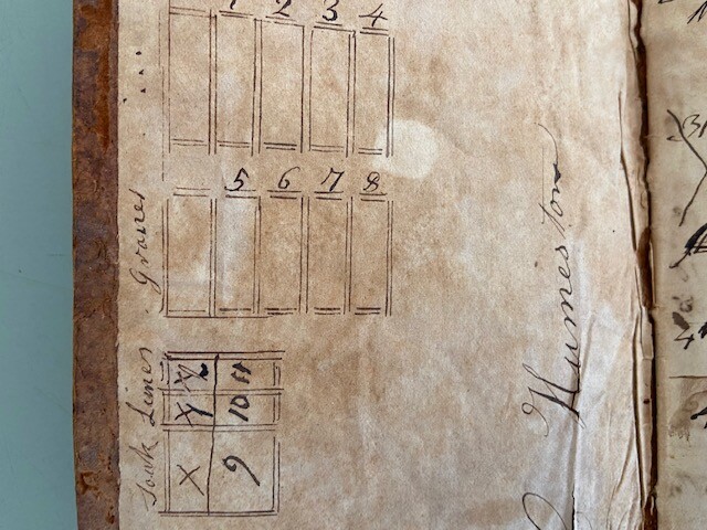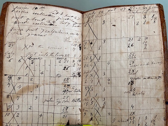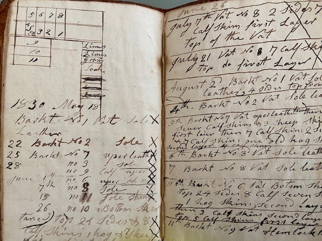 A great small leather ledger or pocketbook from a hide tanner in Massachusetts, possibly Natick area named C Humeston. Measuring 4 1/4 by 7 inches, the leatherbound book contains 8 pages dating from 1824 to 1831 and details various tanning or rendering projects. Signed C Humeston to from inside cover, book bears the name L Allen to back cover. Buyer to pay $7.95 priority shipping in US; flat rate envelope priority international