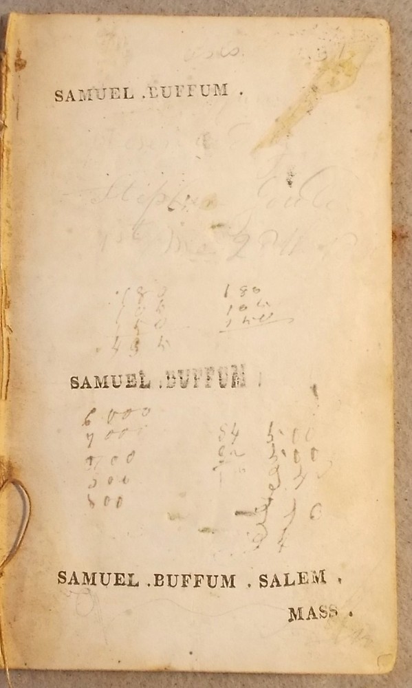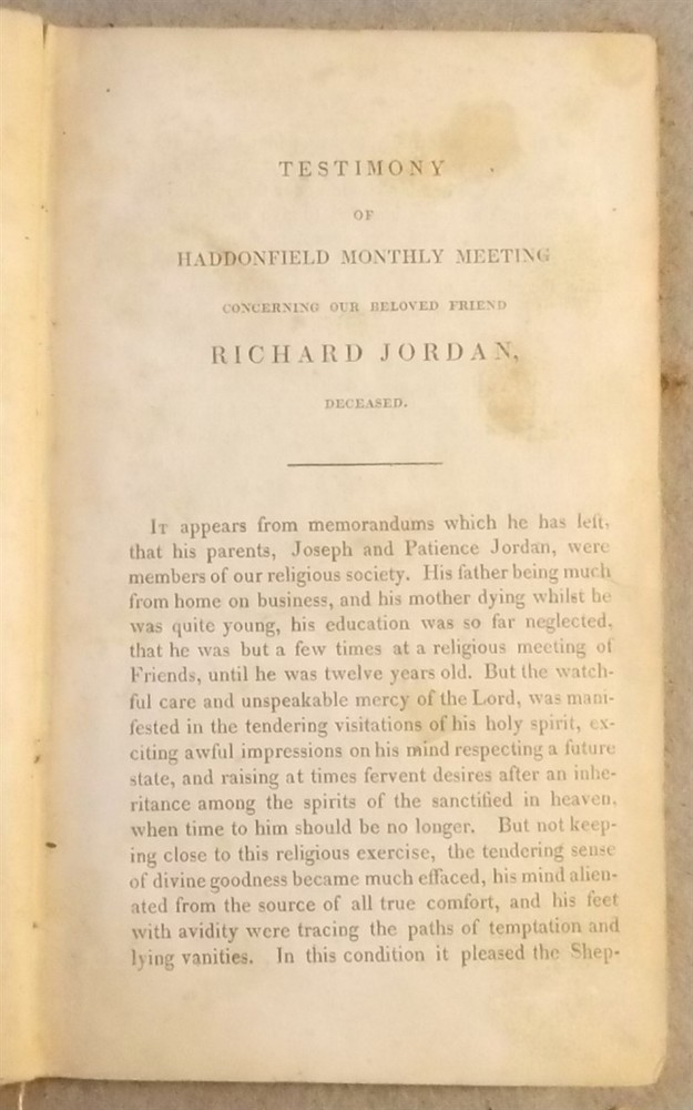 Jordan, Richard. A Journal of the Life and Religious Labours of Richard Jordan, a Minister of the Gospel in the Society of Friends, Late of Newton, Gloucester County, New Jersey. Thomas Kite, 1829. Leather: Poor The covers are detached and the spine perished. With three stamps on the endpaper from Samuel Buffum of Salem, MA.