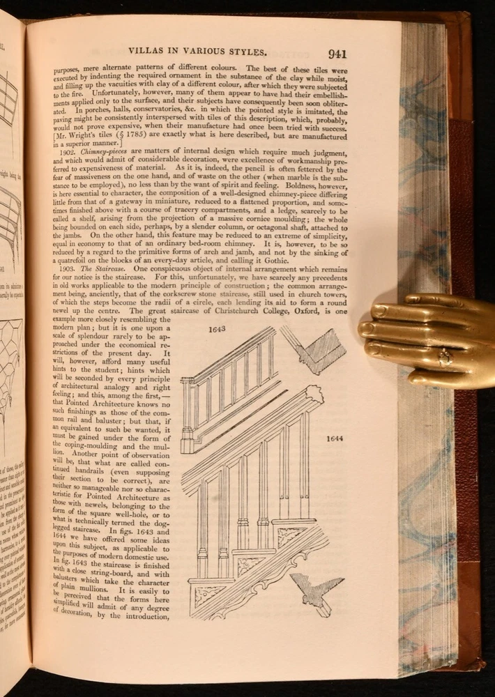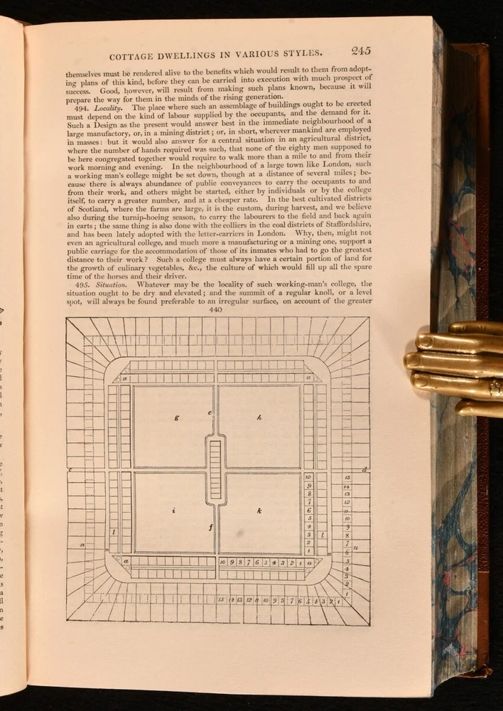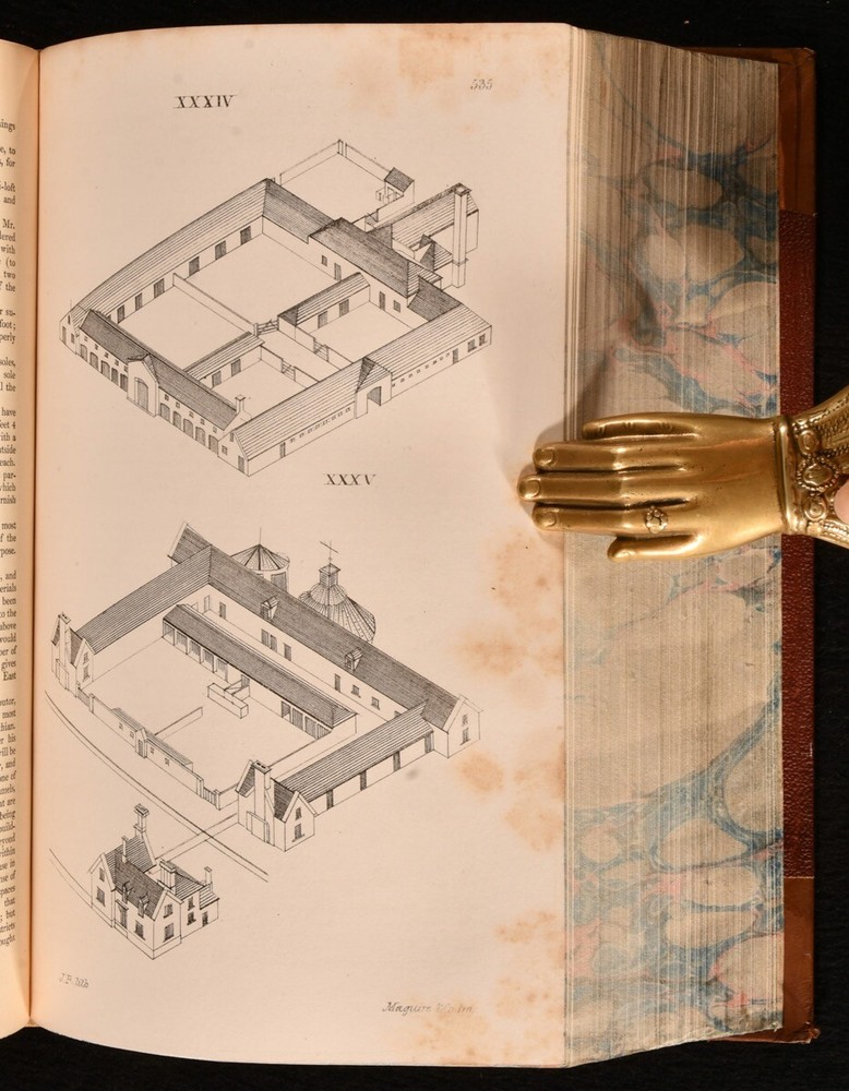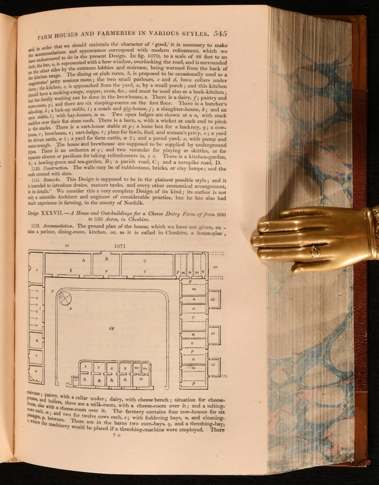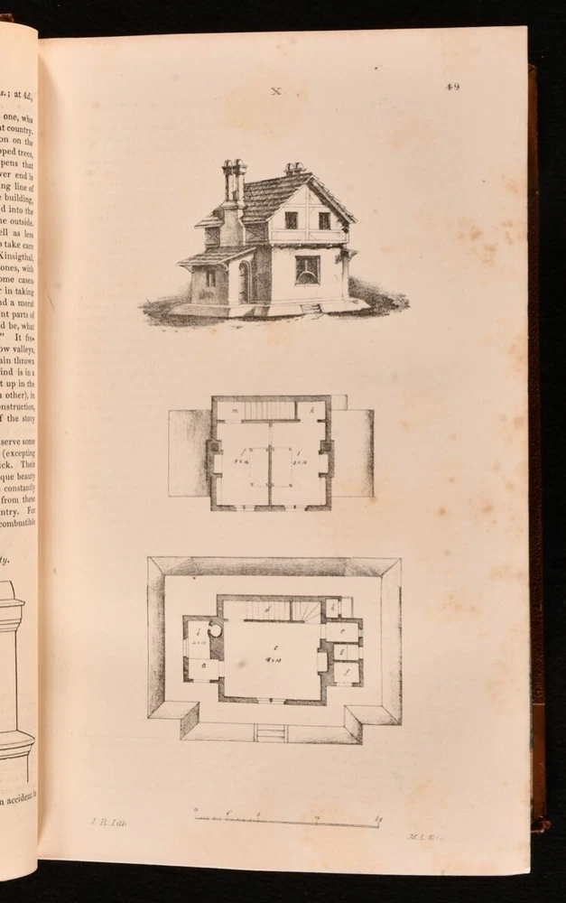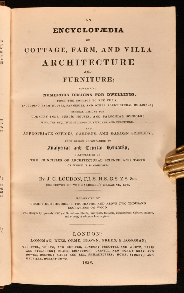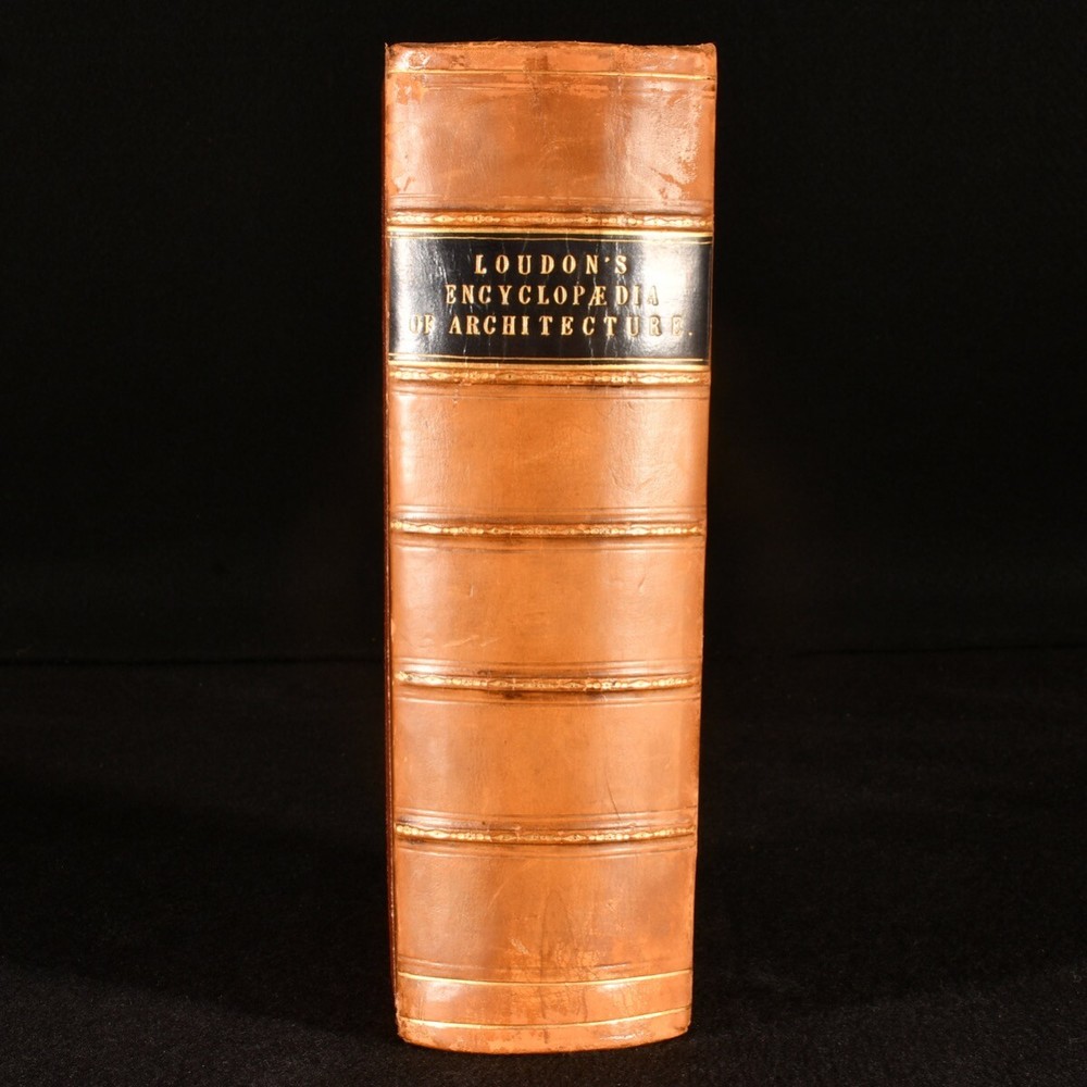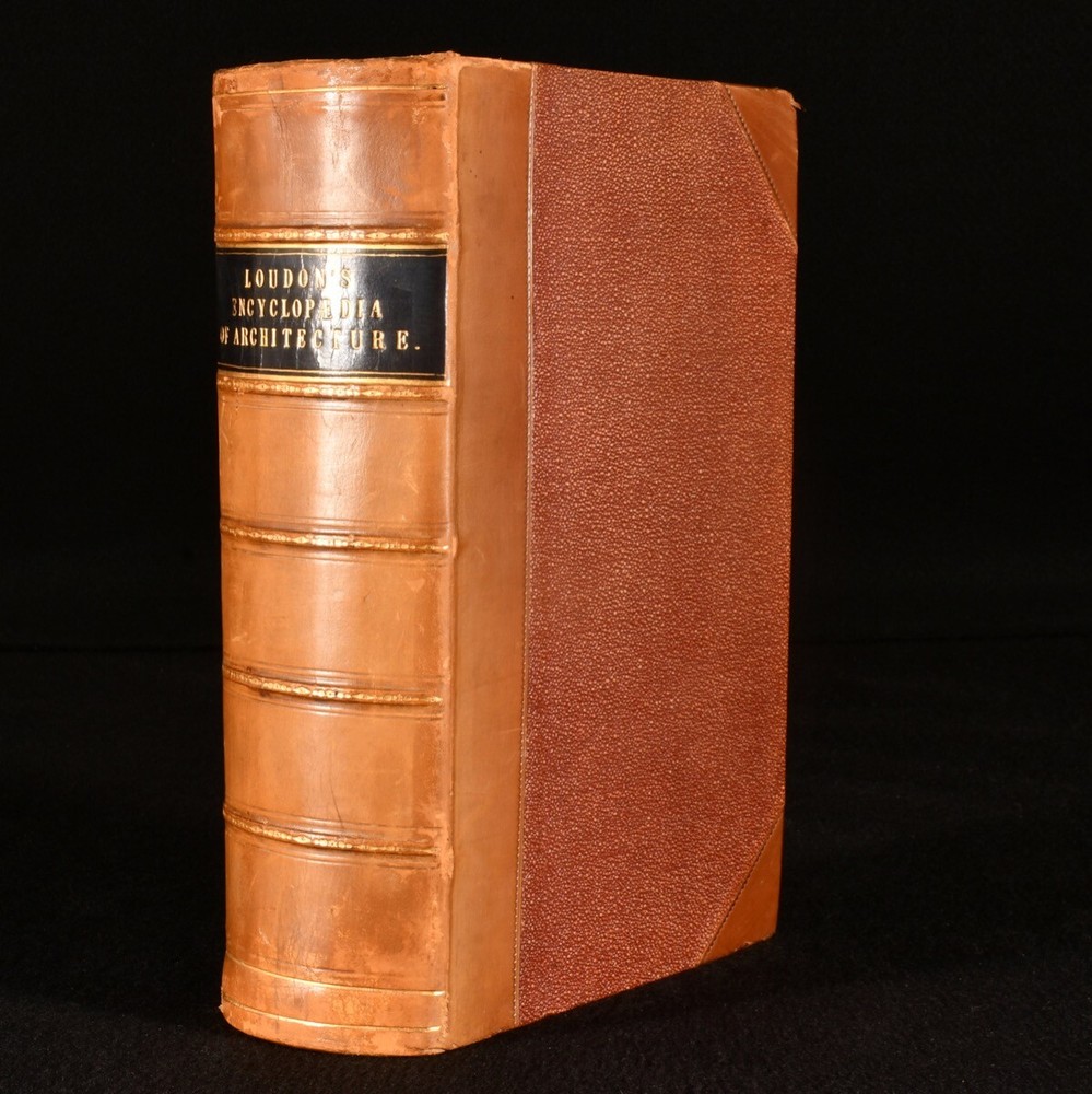 Click here to see our other books! An Encyclopaedia of Cottage, Farm, and Villa Architecture and Furniture J. C. Loudon 1833 Longman, Rees, Orme, Brown, Green & Longman : London 9" by 6.5" xx [1], 2-1138pp SUMMARY A handsome copy of the very scarce first edition of J.C. Loudon's architectural work, a principal architectural study of the mid nineteenth century. First Edition,Illustrated,Leather Binding,Very Scarce Overall Condition: Very Good This book weighs 2 KG when packed UK Postage: £ 3.99 US Postage: £ 29.99 EU Postage : £ 21.99 European Postage: £ 23.99 Asia Postage: £ 37.99 Worldwide Postage: £ 38.99 DESCRIPTION The very scarce first edition of this work, which helped to establish Loudon as an expert in rural architecture. Prior to this publication, Loudon had chiefly been known as a garden designer, and was respected in the field of landscaping. He was the first to use the term arboretum and was a prolific writer on this subject. He designed many prominent locations, including the Birmingham Botanical Gardens, the Abbey Cemetery in Bath and Harewood House. The Oxford Companion to Gardens notes that 'his books, encyclopaedias, and magazines were essential reference books in their day and remain an indispensable source for historians of the period'. This architectural study looks at rural buildings such as the cottage, the villa, country inns, parochial schools, farm houses, offices, gardens and much more. There is not a known collation for Loudon's work, with the lithographic plates usually appearing in the pagination, and printed on both sides. Lithographs present are: IV-V, pp29-30; VI-VII, pp.33-34; VIII-IX, pp.45-46; X-XI, pp.49-50; XII-XIII, pp.55-56; XIV-XV, pp.61-62; XVI-XVII, pp.69-70; XVIII-XIX, pp.75-76; XX-XXI, pp.85-86; XXII-XXIII, pp.89-90; XXIV-XXV, pp.95-96; XXVI-XXVII, pp.99-100; XXVIII-XXIX, pp.103-104; XXX-XXXI, pp.109-110; XXXII-XXXIII, pp.113-114; XXXII-XXXIII, pp.117-118; XXXIII-XXXIV, pp.133-134; XXXVII-XXXVIII, pp.139-140; XLII-XLIII, pp.159-160; XLIV-XLV, pp.165-166; XLVI-XLVII, pp.169-170; XLVIII-XLVIX, pp.173-174; L-LI, pp.177-178; LVII-LVIII, pp.193-194; LXI-LXIV, pp.199-200; LXV-LXVI, pp.203-204; LXVII-LXVIII, pp.209-210; LXIX-LXXII, pp.215-216; LXXIII-LXXVI, pp.225-226. With twelve further plates, printed on both sides, and numbered with figures, rather than in roman. In addition to the aforementioned lithographic plates there are thousands of in-text illustrations. A lovely copy of this very scarce first edition. From the library of Doctor Malcolm Higgs, an important architectural historian who worked as an assistant architect to Stirling & Gowan, working on their particularly renowned Leicester University Engineering Laboratory. During his long career he taught at the University of Edinburgh School of Architecture, Canterbury School of Architecture, and University of Nottingham. Later in his life he was the Vice-President and Honorary Librarian of the Royal Institute of British Architects, and contributed and edited the ‘Journal of Architecture’. CONDITION In a half calf binding, with cloth covered boards. Light rubbing to back strip and joint heads and tails, and to board perimeters. Otherwise, externally excellent. Front hinge a touch strained, but firmly held. Bookseller's label to front pastedown. Internally, firmly bound. Pages clean and bright, with spotting to lithographs. Overall Condition: Very Good GLOSSARY OF TERMS Overall Condition (Dustwrapper condition rating is shown after that for the book itself, where a dustwrapper is present) Fine - Very well preserved copy showing very little wear Very Good Indeed - Only one or two minor faults, really a very attractive copy Very Good - Quite a wide term meaning no major faults but probably several smaller ones often expected given the age of the book, but still a respectable copy Good - Meaning not very good. Some more serious faults as will be described in the condition report under 'condition' Good Only - Meaning one or more faults that could really do with repair Fair - As with good only above but with other faults leaving a compromised copy even after repair Poor - Really bad and possibly seriously incomplete. We only sell books in this condition where their rarity or value makes them attractive none the less. Major defects will be described. GUARANTEE We offer a full money back guarantee on our descriptions. Please ask for details and conditions. We prefer PAYPAL. If you pay via PAYPAL we will post the item off the same or the next working day with the postage you have selected. Please note we cannot accept USD cheques