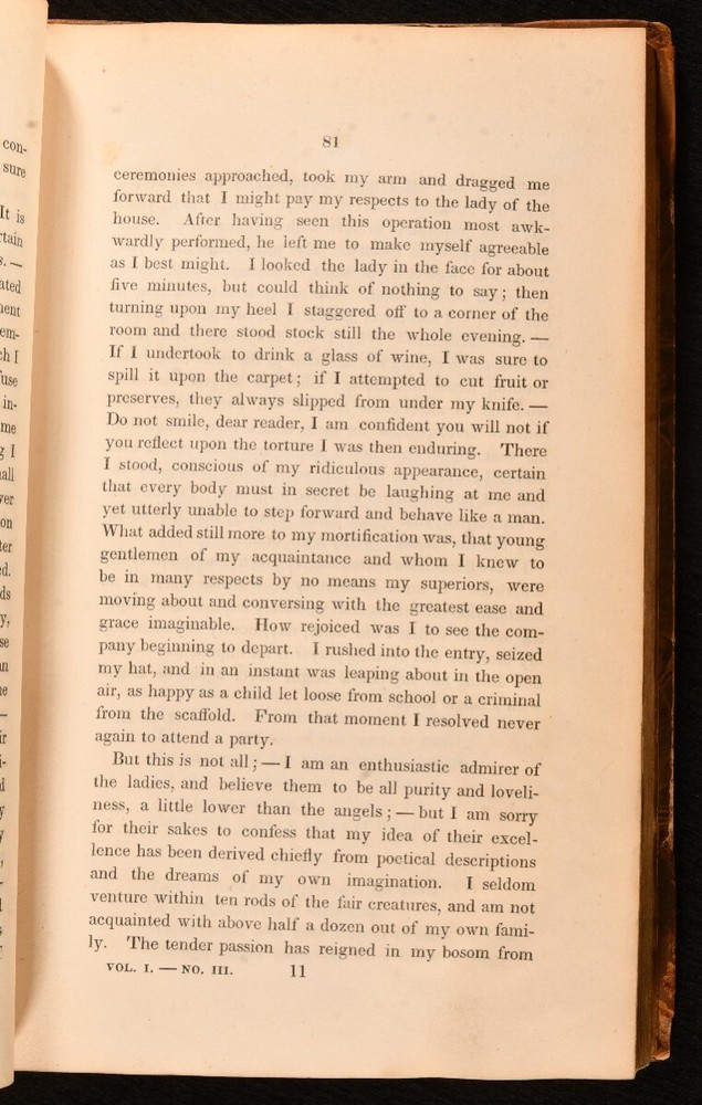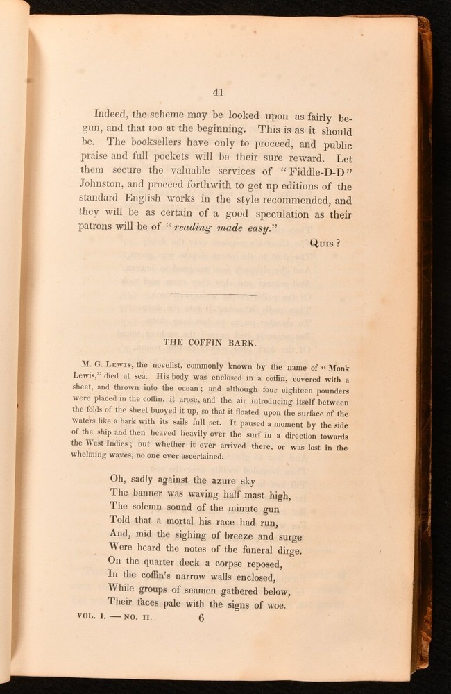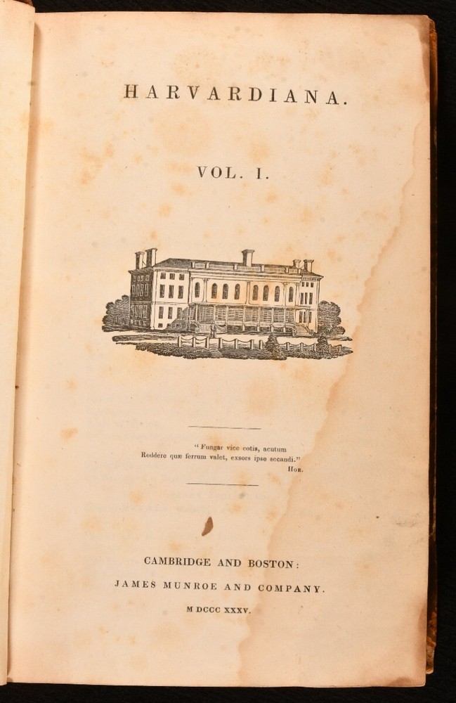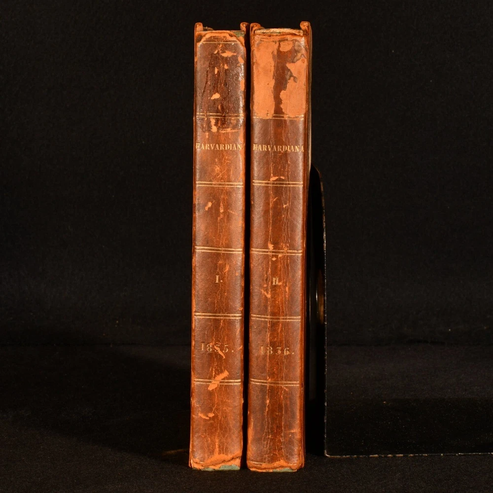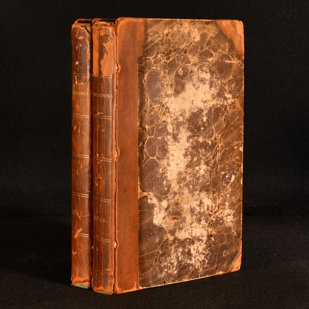 Click here to see our other books! Harvardiana Various 1835-36 James Munroe and Company : Cambridge; Boston 8.5" by 5.5" vi, [2], 384; iv, 386, [1pp] SUMMARY The first edition of the first two volumes of Harvard's literary journal, very scarce. First Edition,Leather Binding,Very Scarce Overall Condition: Good Only This book weighs 1.5 KG when packed UK Postage: £ 3.99 US Postage: £ 23.99 EU Postage : £ 18.99 European Postage: £ 19.99 Asia Postage: £ 31.99 Worldwide Postage: £ 32.99 DESCRIPTION The first edition of this very scarce work. In two volumes, being Volumes I and II of this periodical, which ran to a total of IV volumes. A total of twelve issues bound per volume. Vignette title to each volume. 'Harvardiana' was a literary journal made for and by the undergraduates of Harvard University published from 1835 to 1838. This periodical contains a vast variety of short stories, essays, poems, and reviews. Including 'The Comet of 1831', 'On Enthusiasm in One's Profession', 'Rural Sentimentalities', 'Review of Philip van Artevelde', 'Classical Education of Boys', 'Phrenology', 'My Mother's Voice', 'Review of Sartor Resartus', 'The Confessions of a Poet', and more. One of the editors and contributors was American Romantic poet, James Russell Lowell, who graduated from Harvard with a reputation as a troublemaker in 1838. One page of adverts to the rear of Volume II. CONDITION In a half calf binding binding with marbled paper to the boards. Externally, front board of Volume I is held by one cord only, joints of Volume II and rear joint of Volume I are strained. Rubbing to the boards and spines. Light fading to the spines. Minor bumping to the extremities, resulting in a small amount of loss. Loss to the head and tail of the spines. Rear hinge of Volume I and hinges of Volume II are tender. Torn labels to the front paste downs. Internally, firmly bound. Pages are bright and generally clean. Tidemark to the textblocks. Overall Condition: Good Only GLOSSARY OF TERMS Overall Condition (Dustwrapper condition rating is shown after that for the book itself, where a dustwrapper is present) Fine - Very well preserved copy showing very little wear Very Good Indeed - Only one or two minor faults, really a very attractive copy Very Good - Quite a wide term meaning no major faults but probably several smaller ones often expected given the age of the book, but still a respectable copy Good - Meaning not very good. Some more serious faults as will be described in the condition report under 'condition' Good Only - Meaning one or more faults that could really do with repair Fair - As with good only above but with other faults leaving a compromised copy even after repair Poor - Really bad and possibly seriously incomplete. We only sell books in this condition where their rarity or value makes them attractive none the less. Major defects will be described. GUARANTEE We offer a full money back guarantee on our descriptions. Please ask for details and conditions. We prefer PAYPAL. If you pay via PAYPAL we will post the item off the same or the next working day with the postage you have selected. Please note we cannot accept USD cheques