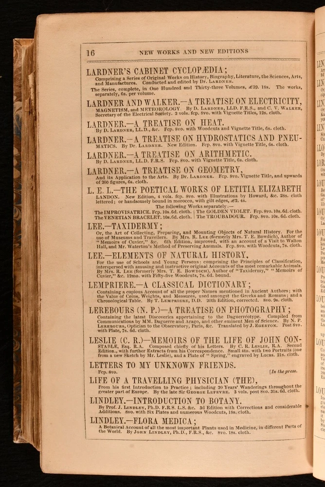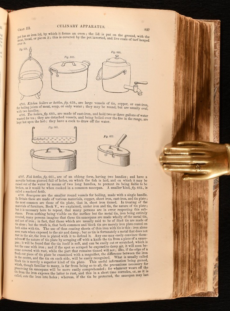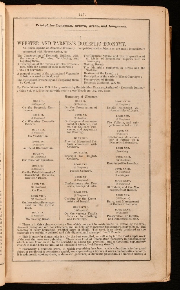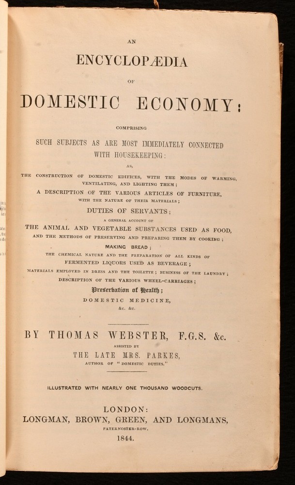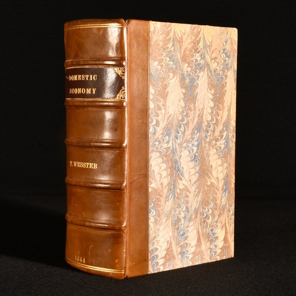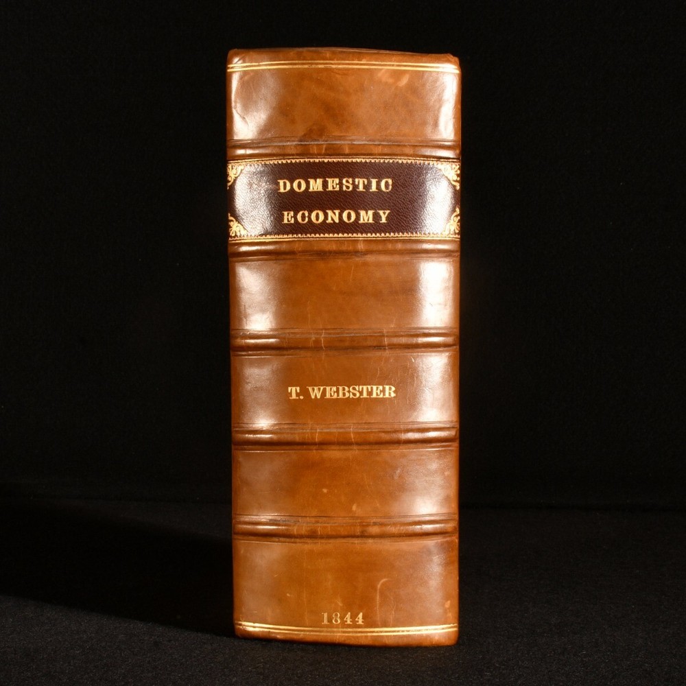 Click here to see our other books! An Encyclopaedia of Domestic Economy: Comprising Such Subjects as are Most Immediately Connected With Housekeeping: As, the Construction of Domestic Edifices, with the Modes of Warming, Ventilating, and Lighting Them; a Description of the Various Articles of Furniture with the Nature of Their Materials; Duties of Servants; a General Account of the Animals and Vegetable Substances Used as Food, and the Methods of Preserving and Preparing Them by Cooking; Making Bread; the Chemical Nature and the Preparation of all Kinds of Fermented Liquors used as beverage; Materials Employed in Dress and the Toilette; Business of the Laundry; Description of the Various Wheel-Carriages; Preservation of Health; Domestic Medicine, &c. &c. Thomas Webster; Mrs. Parkes 1844 Longman, Brown, Green, and Longmans : London 9" by 5.5" xvi, xix, [1], 1264, 32pp SUMMARY A very scarce first edition domestic encyclopedia, an extensive Victorian publication on the effective running of a household. First Edition,Illustrated,Leather Binding,Rebound,Scarce Overall Condition: Near Fine This book weighs 2 KG when packed UK Postage: £ 3.99 US Postage: £ 29.99 EU Postage : £ 21.99 European Postage: £ 23.99 Asia Postage: £ 37.99 Worldwide Postage: £ 38.99 DESCRIPTION The scarce first edition. Illustrated with nearly one thousand woodcuts throughout. Sixteen pages of adverts to the front, dated February 1845, and thirty-two pages of adverts to the rear, dated October 1846. An immensely detailed encyclopaedia guiding the reader on the proper running of a Victorian household. Offering a fascinating insight into the Victorian home, written at a time when such manuals were essential for every home and housekeeper. Divided into twenty-six books, with sections including ventilation, artificial illumination, the domestic residence, furniture, servants, food, beverages, bread, food preservation, the arrangement of a kitchen, recipes for English cookery, fabrics for clothing and furniture, the toilette, jewellery, horses, pets, and more. This was an immensely popular publication, being oft-reprinted in both the U.K. and U.S. By Thomas Webster, assisted by the late Mrs. Parkes. CONDITION In a modern quarter calf binding with marbled paper to the boards. Externally, smart. Internally, firmly bound. Pages are lightly age-toned and clean, with some light handling marks and scattered spots. Overall Condition: Near Fine GLOSSARY OF TERMS Overall Condition (Dustwrapper condition rating is shown after that for the book itself, where a dustwrapper is present) Fine - Very well preserved copy showing very little wear Very Good Indeed - Only one or two minor faults, really a very attractive copy Very Good - Quite a wide term meaning no major faults but probably several smaller ones often expected given the age of the book, but still a respectable copy Good - Meaning not very good. Some more serious faults as will be described in the condition report under 'condition' Good Only - Meaning one or more faults that could really do with repair Fair - As with good only above but with other faults leaving a compromised copy even after repair Poor - Really bad and possibly seriously incomplete. We only sell books in this condition where their rarity or value makes them attractive none the less. Major defects will be described. GUARANTEE We offer a full money back guarantee on our descriptions. Please ask for details and conditions. We prefer PAYPAL. If you pay via PAYPAL we will post the item off the same or the next working day with the postage you have selected. Please note we cannot accept USD cheques