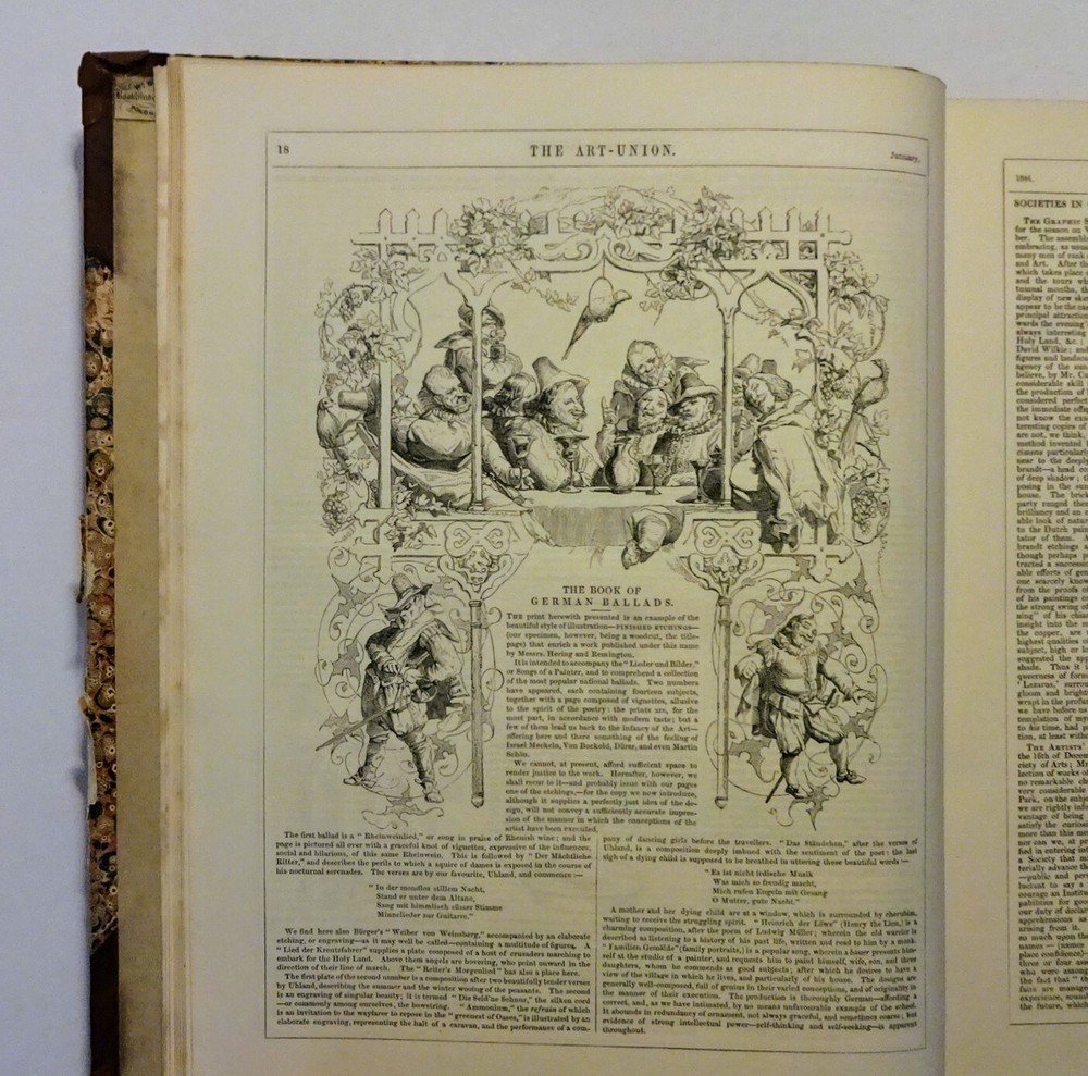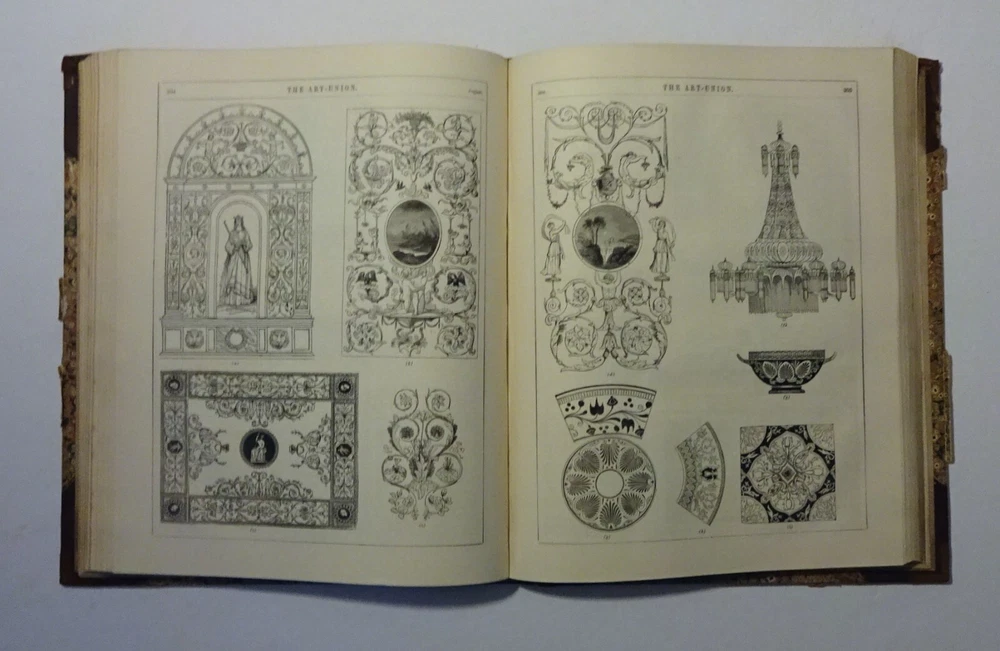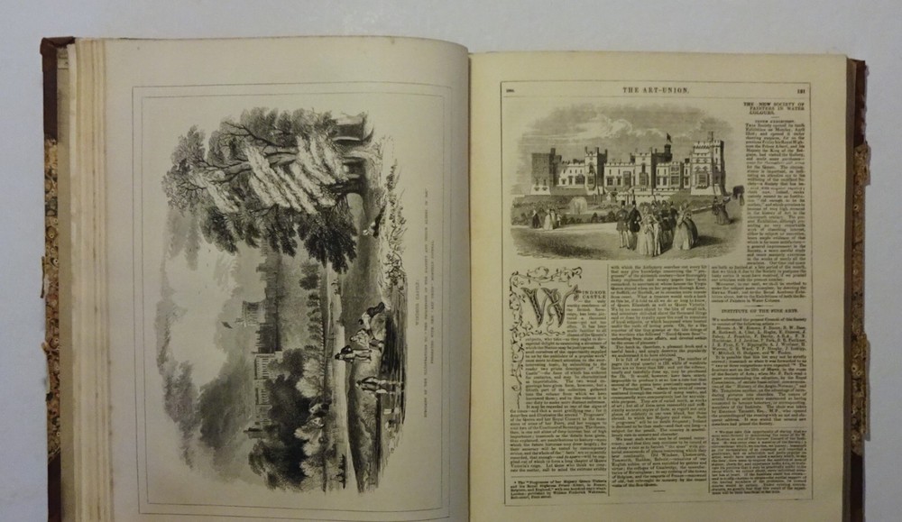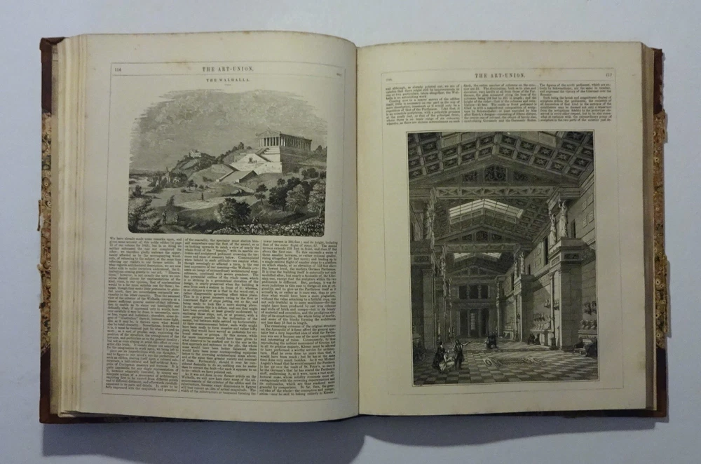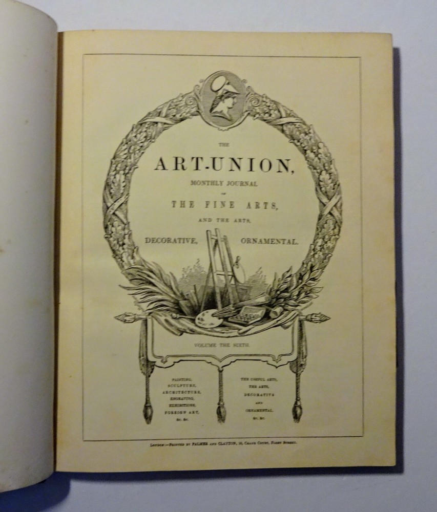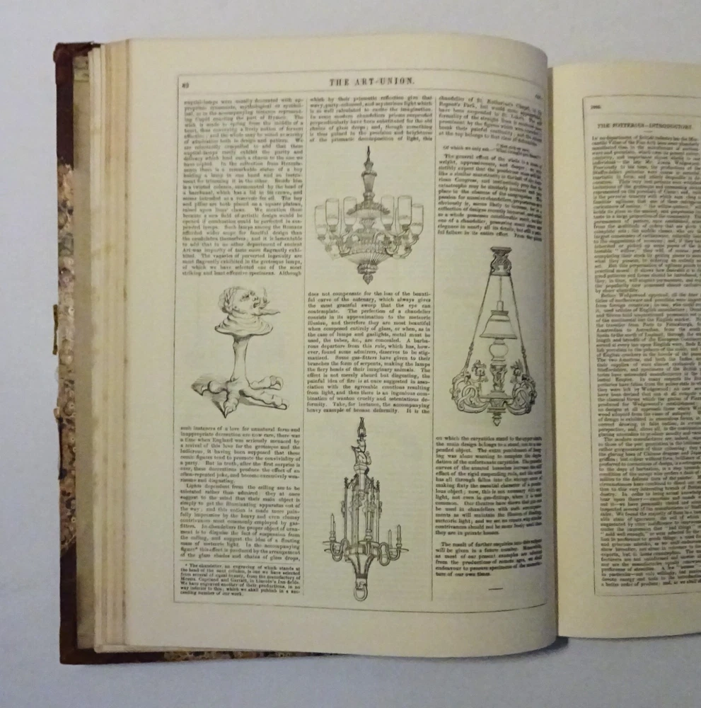 "The Art-Union Monthly Journal of the Fine Arts, and the Arts, Decorative, Ornamental." The volume contains 12 bound issues - January 1, 1844 to December 1, 1844. Published by Palmer and Clayton in London. Volume VI. Nicely bound in three-quarter leather with marbled covers, and four raised bands and gilt lettering on the spine. The book is beautifully illustrated with numerous full-page engraved plates and in-text drawings throughout. Also included is a fold-out "Elevation & Ground Plan of the Museum Palace for the Exposition of the Products of French Industy, Opened at Paris, May & June 1844." In addition to the illustrations, the issues art-related articles - here are a few examples: Improvements in Porcelain; Painted Glass; Washington Memorial; French Fabric in Silk; Flaxman's Compositions; Electrotype; Architectural Lectures; Church Painting at Malta; Glyphography; Painting of Goldsmith and Johnson; Drawing Ink; Millar's Silica Colours; Lorimer's Transparent Planes; Monumental Sculpture; Prize Cartoons...and much more. There is an Index at the front. Over-sized - the book measures 11 3/4" tall x 9 1/2" wide.