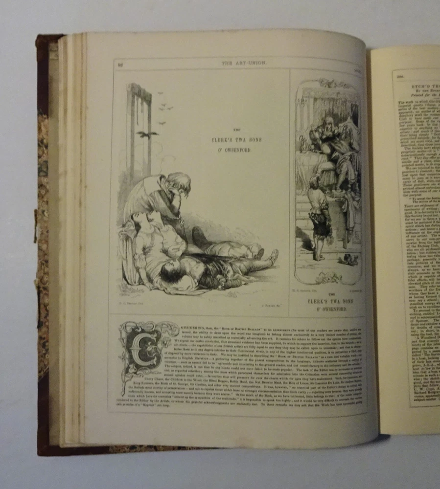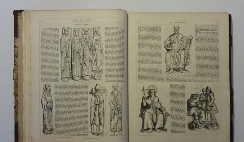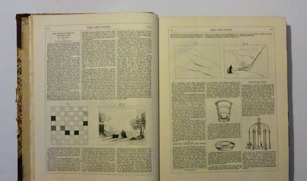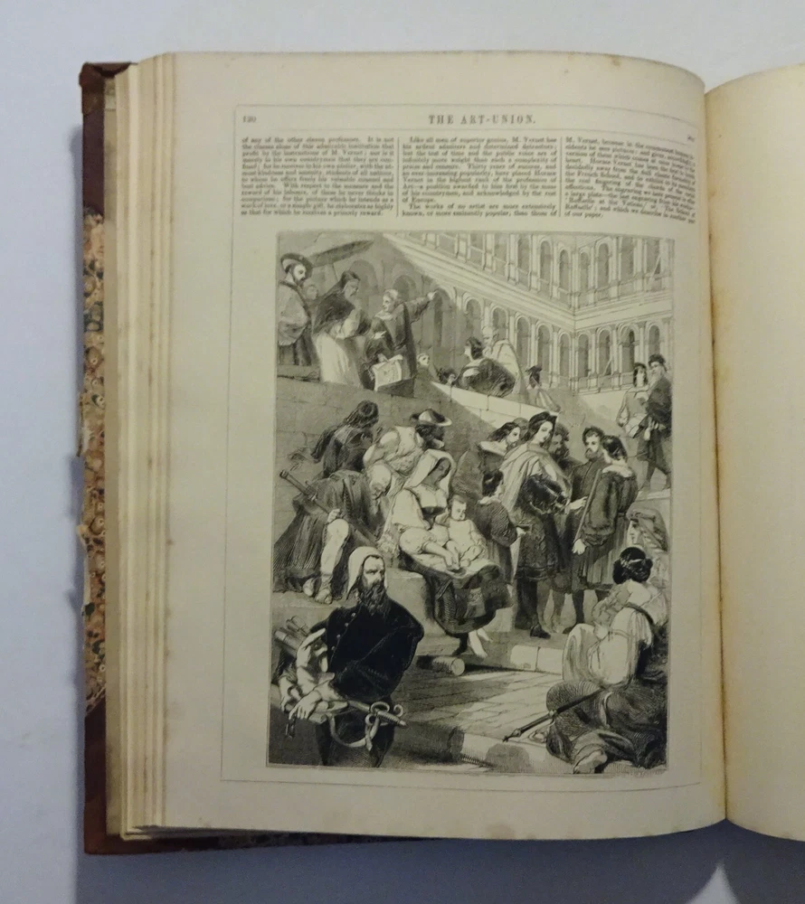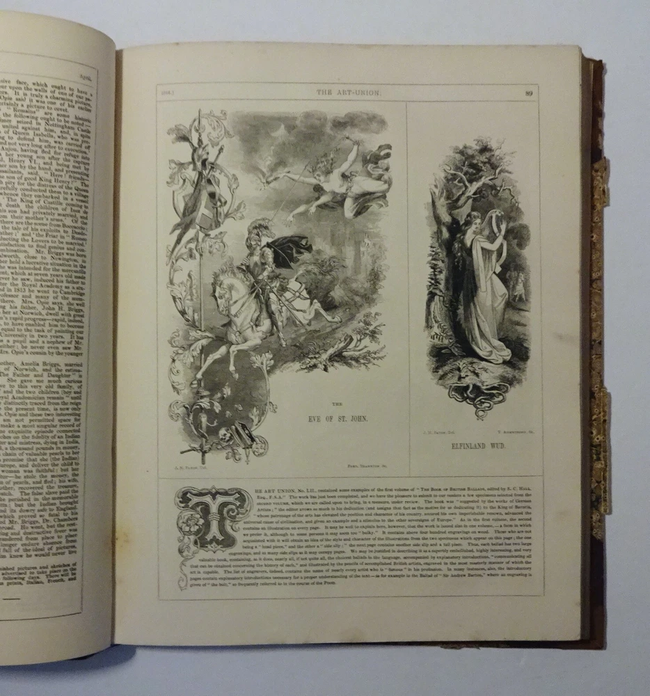 "The Art-Union Monthly Journal of the Fine Arts, and the Arts, Decorative, Ornamental." The volume contains 12 bound issues - January 1, 1844 to December 1, 1844. Published by Palmer and Clayton in London. Volume VI. Nicely bound in three-quarter leather with marbled covers, and four raised bands and gilt lettering on the spine. The book is beautifully illustrated with numerous full-page engraved plates and in-text drawings throughout. Also included is a fold-out "Elevation & Ground Plan of the Museum Palace for the Exposition of the Products of French Industy, Opened at Paris, May & June 1844." In addition to the illustrations, the issues art-related articles - here are a few examples: Improvements in Porcelain; Painted Glass; Washington Memorial; French Fabric in Silk; Flaxman's Compositions; Electrotype; Architectural Lectures; Church Painting at Malta; Glyphography; Painting of Goldsmith and Johnson; Drawing Ink; Millar's Silica Colours; Lorimer's Transparent Planes; Monumental Sculpture; Prize Cartoons...and much more. There is an Index at the front. Over-sized - the book measures 11 3/4" tall x 9 1/2" wide.