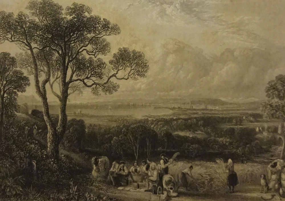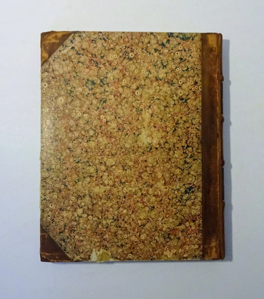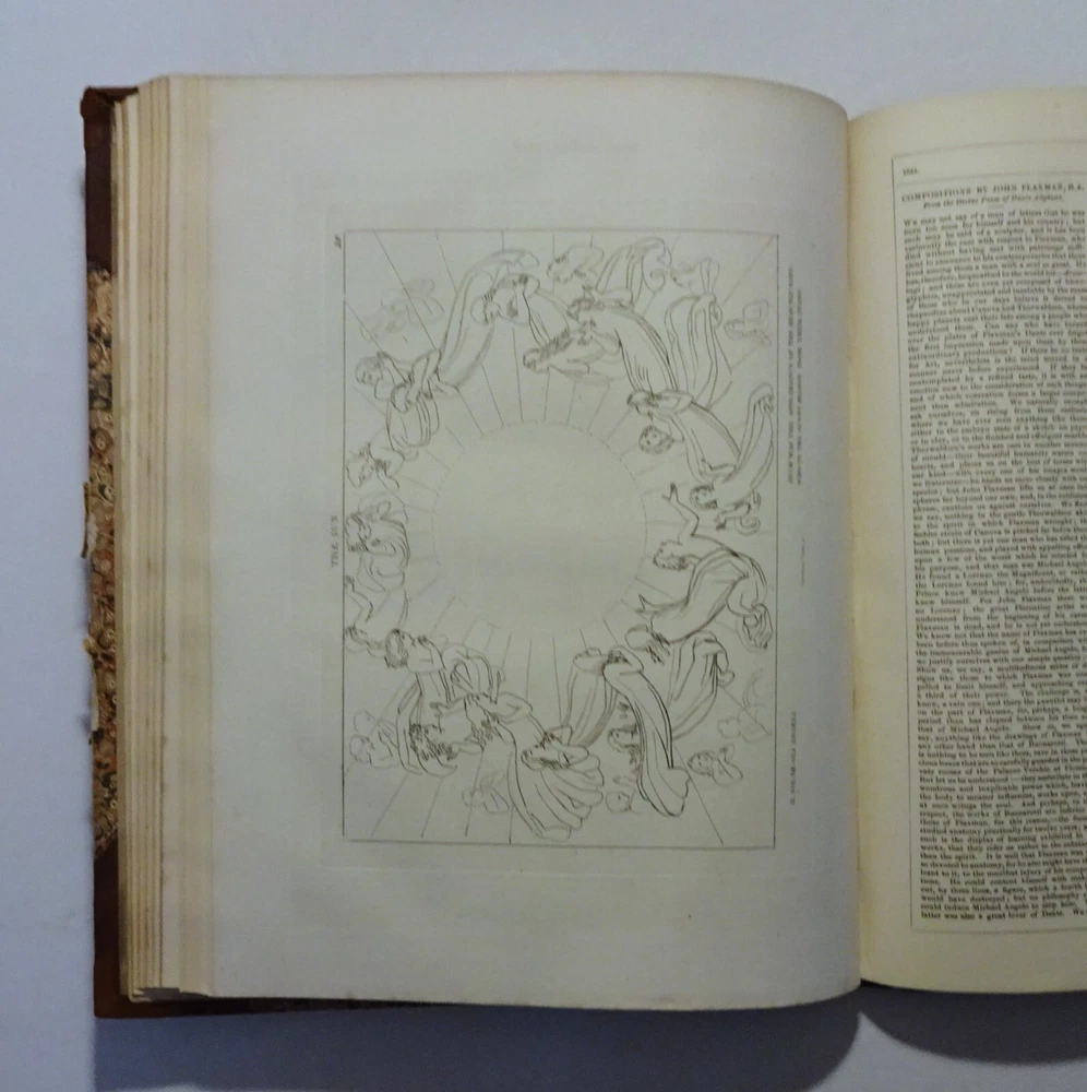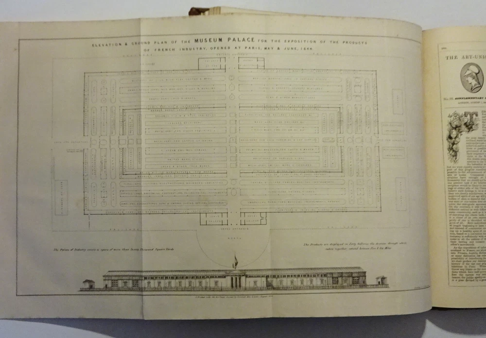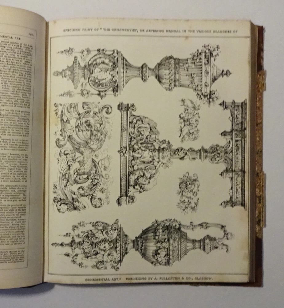 "The Art-Union Monthly Journal of the Fine Arts, and the Arts, Decorative, Ornamental." The volume contains 12 bound issues - January 1, 1844 to December 1, 1844. Published by Palmer and Clayton in London. Volume VI. Nicely bound in three-quarter leather with marbled covers, and four raised bands and gilt lettering on the spine. The book is beautifully illustrated with numerous full-page engraved plates and in-text drawings throughout. Also included is a fold-out "Elevation & Ground Plan of the Museum Palace for the Exposition of the Products of French Industy, Opened at Paris, May & June 1844." In addition to the illustrations, the issues art-related articles - here are a few examples: Improvements in Porcelain; Painted Glass; Washington Memorial; French Fabric in Silk; Flaxman's Compositions; Electrotype; Architectural Lectures; Church Painting at Malta; Glyphography; Painting of Goldsmith and Johnson; Drawing Ink; Millar's Silica Colours; Lorimer's Transparent Planes; Monumental Sculpture; Prize Cartoons...and much more. There is an Index at the front. Over-sized - the book measures 11 3/4" tall x 9 1/2" wide.