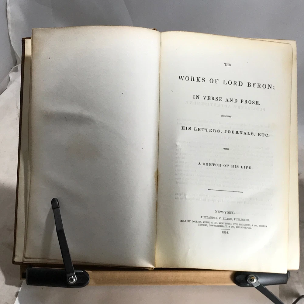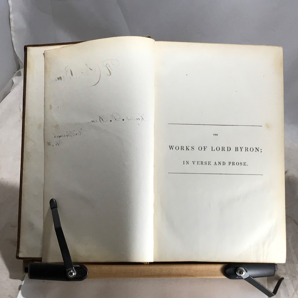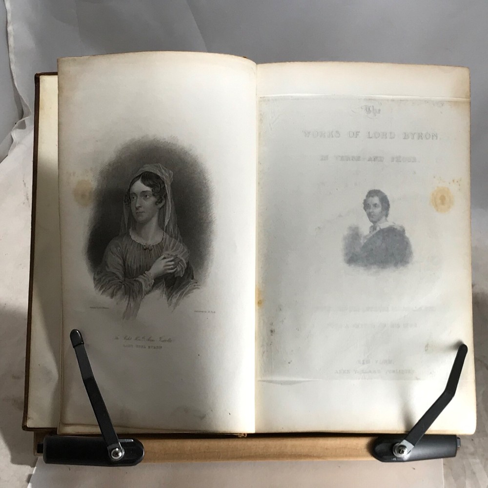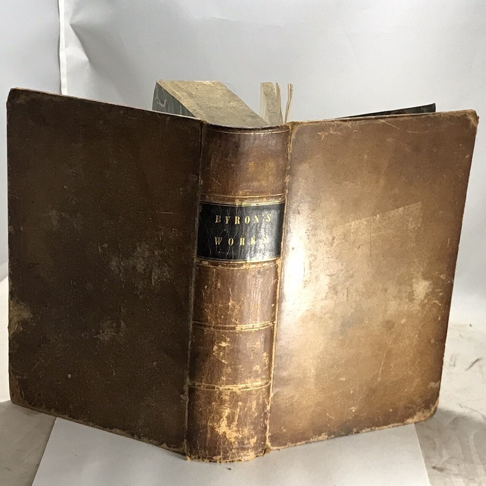 The Works of Lord Byron; In Verse and Prose. Including his Letters, Journals, Etc. With a Sketch of His Life, Lord Byron, Alexander V. Blake, New York, 1844, 627 pages, frontispieces, leather, 8vo. In fair condition. Boards exhibit typical wear with minor abrasions and areas of dryness. Spine has light creasing along leather. Front gutter is shaken. Previous owner’s name on front end page. Dampness marks on title pages. Light rippling throughout text block. Unmarked. Binding intact. Please see photos. The letters and and journals of Lord Byron, one of the leading figures of the Romantic movement, and regarded as one of the greatest British poets. Incredibly comprehensive. COLL1844ABDA-variant