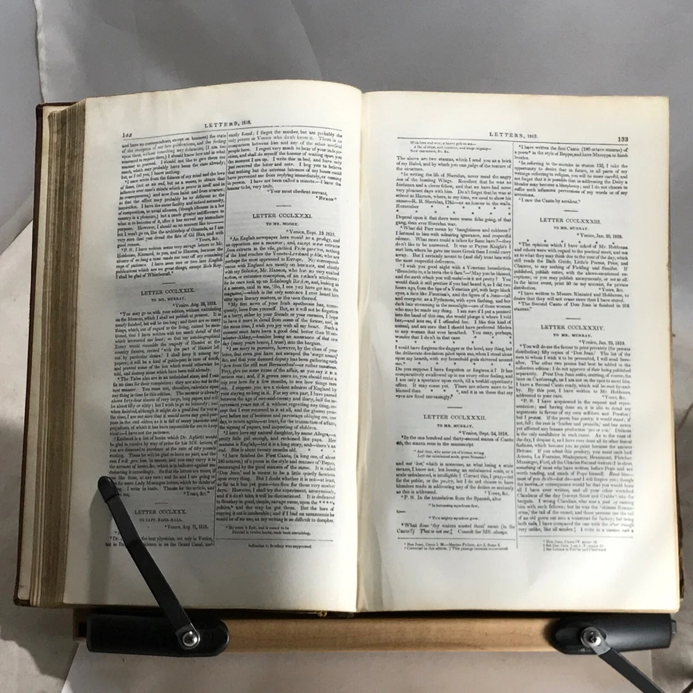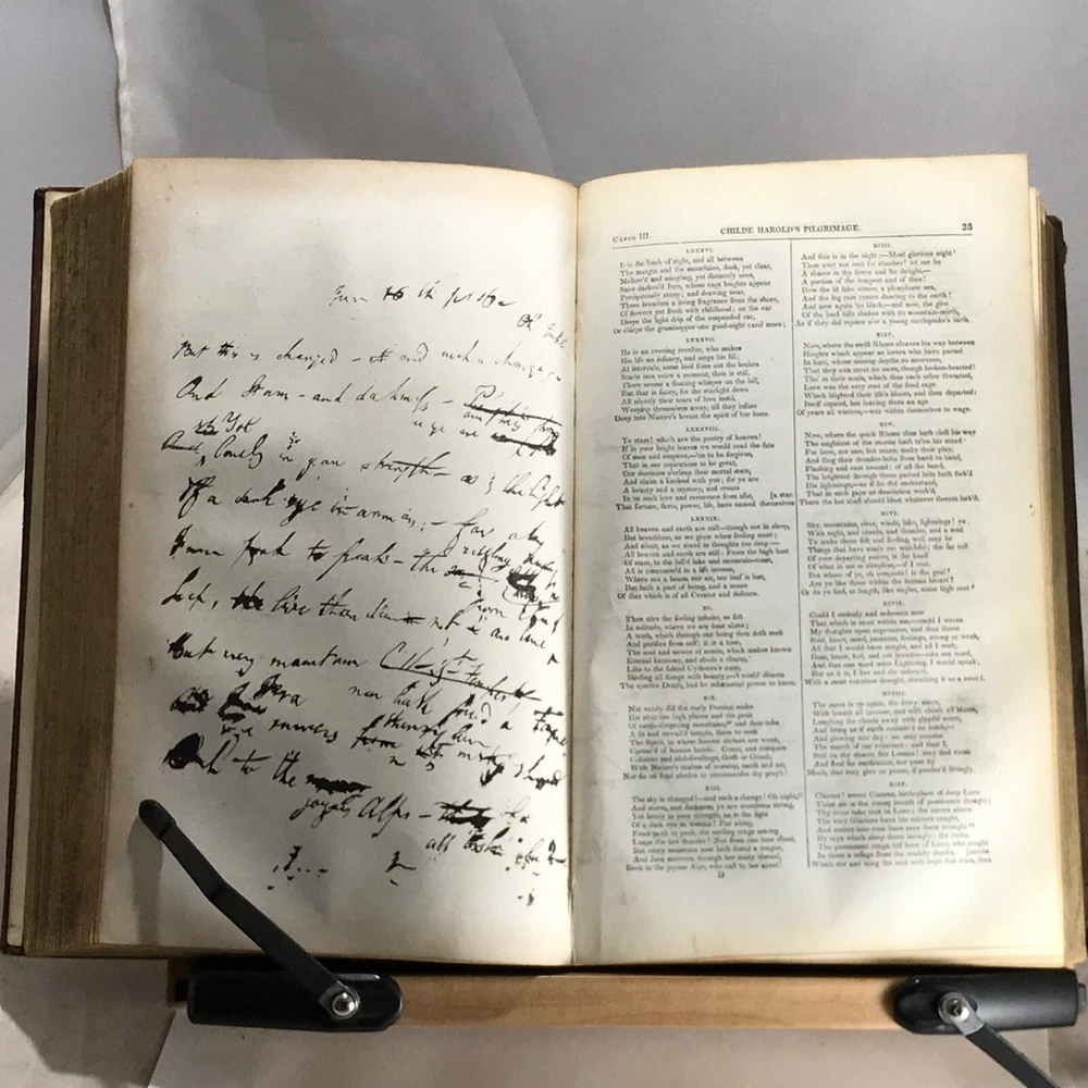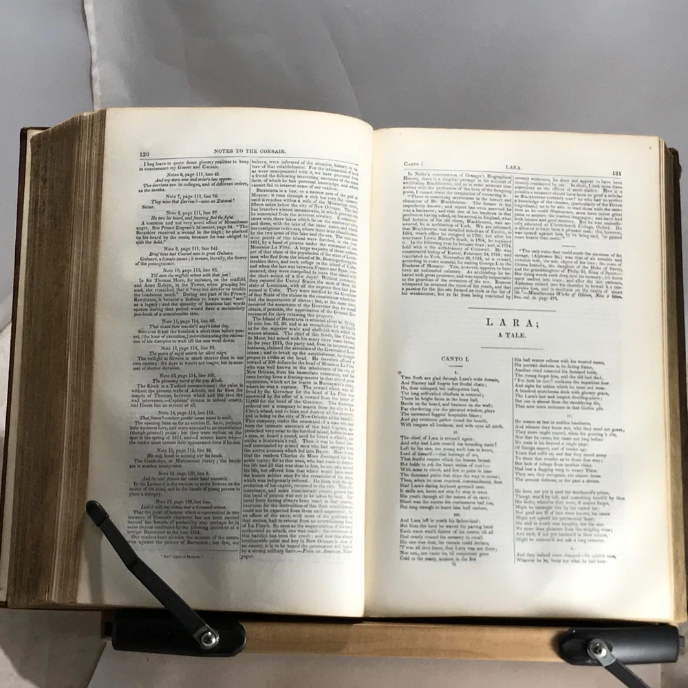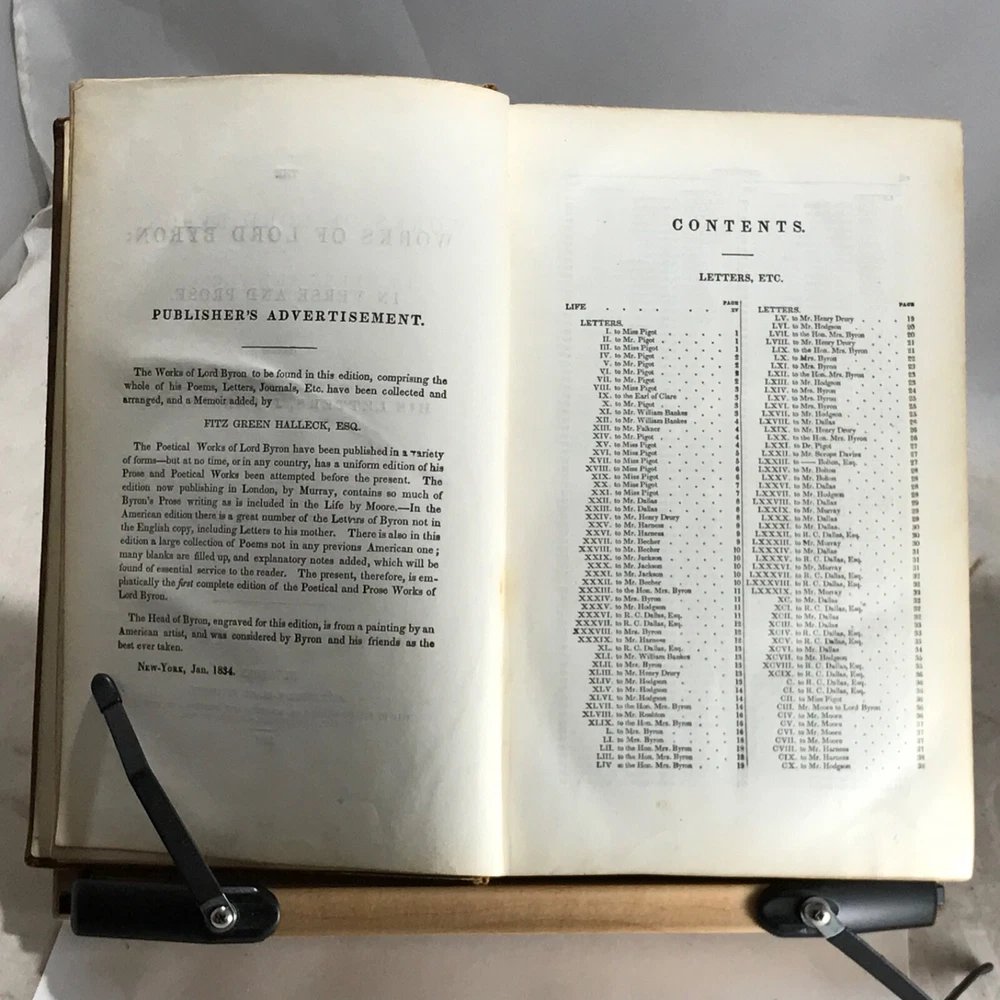 The Works of Lord Byron; In Verse and Prose. Including his Letters, Journals, Etc. With a Sketch of His Life, Lord Byron, Alexander V. Blake, New York, 1844, 627 pages, frontispieces, leather, 8vo. In fair condition. Boards exhibit typical wear with minor abrasions and areas of dryness. Spine has light creasing along leather. Front gutter is shaken. Previous owner’s name on front end page. Dampness marks on title pages. Light rippling throughout text block. Unmarked. Binding intact. Please see photos. The letters and and journals of Lord Byron, one of the leading figures of the Romantic movement, and regarded as one of the greatest British poets. Incredibly comprehensive. COLL1844ABDA-variant
