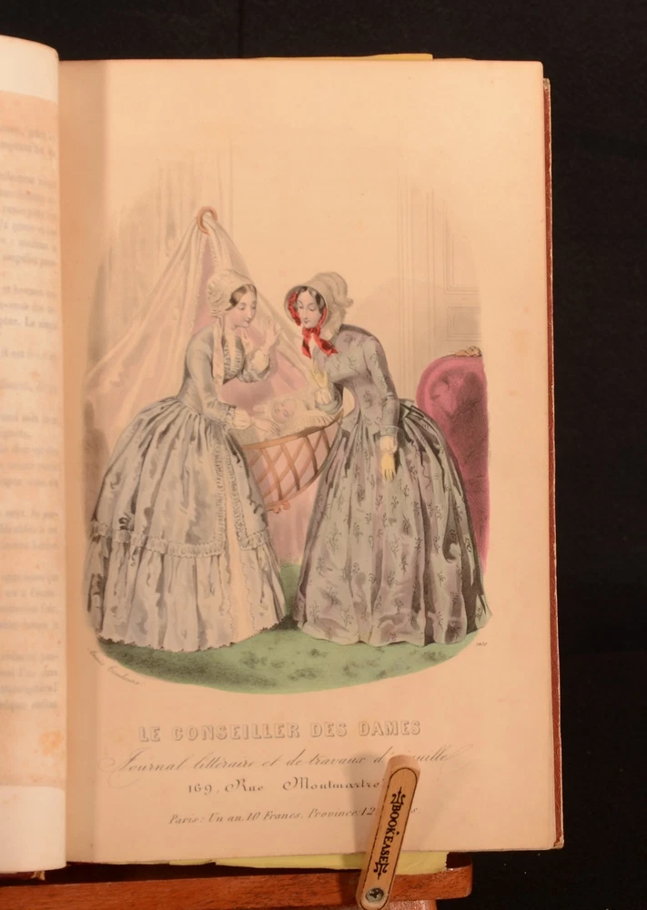 Click here to see our other books! Le Conseiller des Dames Journal D'Economie Domestique Various 1847-49 Administration et Redaction : Paris 10.5" by 7" 384, [1], 66-384 SUMMARY Two volumes of this mid-Nineteenth century bourgeois newspaper for women, 'Le Conseiller des Dames'. An illustrated periodical, with many hand-coloured plates and folding embroidery patterns. Folding Plates,Illustrated,Leather Binding Overall Condition: Very Good This book weighs 3 KG when packed UK Postage: £ 3.99 US Postage: £ 36.99 EU Postage : £ 25.99 European Postage: £ 27.99 Asia Postage: £ 47.99 Worldwide Postage: £ 69.99 DESCRIPTION The first volume is December 1847-October 1848 and January 1849-October 1849. With three black and white plates, ten hand-coloured plates, four coloured cross-stitch plates, eleven yellow embroidery pattern plates dated November 1847 - October 1848 and two plates of sheet music to the 1847-8 volume. With nine yellow embroidery plates, two tapestry pattern plates, three cross stitch plates, one black and white folding plate, two music plates and eight coloured plates to the second volume (Jan-October 1849). The hand-coloured plates across both volumes are typically scenes of women and their fashion. Mai 1848 embroidery pattern plate, also has a pattern for negligee to the rear. Janvier 1849 embroidery plate has a sewing pattern to the rear. May has a sewing pattern for an outer garment to the rear. This beautifully illustrated periodical began in November 1847, and was edited by one Z Bourey. In addition to the many sewing patterns and plates representing fashion, there are articles discussing the February Revolution, the revival of clubs and the voice of women, female writers under the republic (written by Leonie Verrieres.) and much more. CONDITION A quarter morocco binding with paper covered boards. Externally, generally smart. Patches of rubbing to the joints and extremities. Further patches of rubbing to the spine and paper covered boards. Internally, both volumes are firmly bound. Pages are generally bright. April 1848 yellow sewing plate to 1847-8 volume has had a small amount cut out. Small closed tear to the hand-coloured plate at page 133 of the first volume. Small chips to the edges of some of the yellow embroidery pattern plates. The September embroidery plate to the second volume is detached but present. Closed tear to the first music plate to the second volume. One emboidery plate has been completely removed to September and October of vol II. Occasional scattered spots to pages, with heavy spotting to pages 333-352 to the 1849 volume. Overall Condition: Very Good GLOSSARY OF TERMS Overall Condition (Dustwrapper condition rating is shown after that for the book itself, where a dustwrapper is present) Fine - Very well preserved copy showing very little wear Very Good Indeed - Only one or two minor faults, really a very attractive copy Very Good - Quite a wide term meaning no major faults but probably several smaller ones often expected given the age of the book, but still a respectable copy Good - Meaning not very good. Some more serious faults as will be described in the condition report under 'condition' Good Only - Meaning one or more faults that could really do with repair Fair - As with good only above but with other faults leaving a compromised copy even after repair Poor - Really bad and possibly seriously incomplete. We only sell books in this condition where their rarity or value makes them attractive none the less. Major defects will be described. GUARANTEE We offer a full money back guarantee on our descriptions. Please ask for details and conditions. We prefer PAYPAL. If you pay via PAYPAL we will post the item off the same or the next working day with the postage you have selected. Please note we cannot accept USD cheques